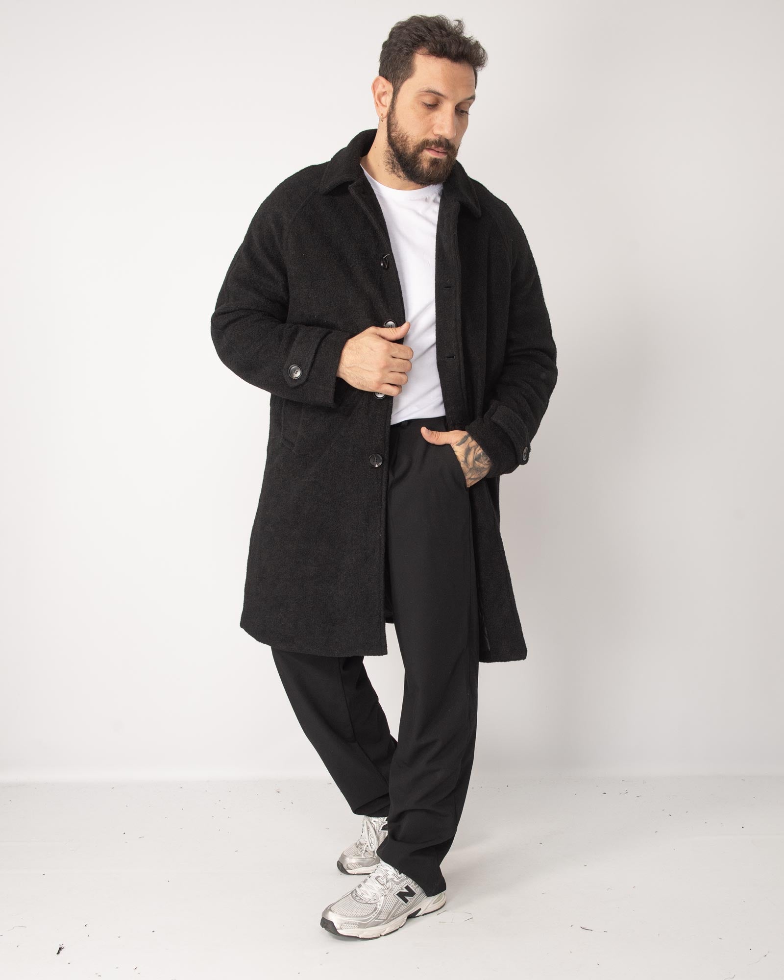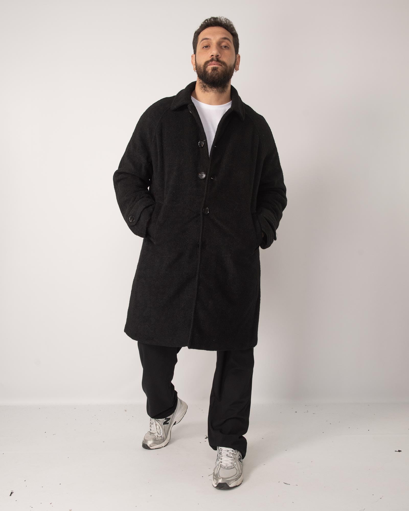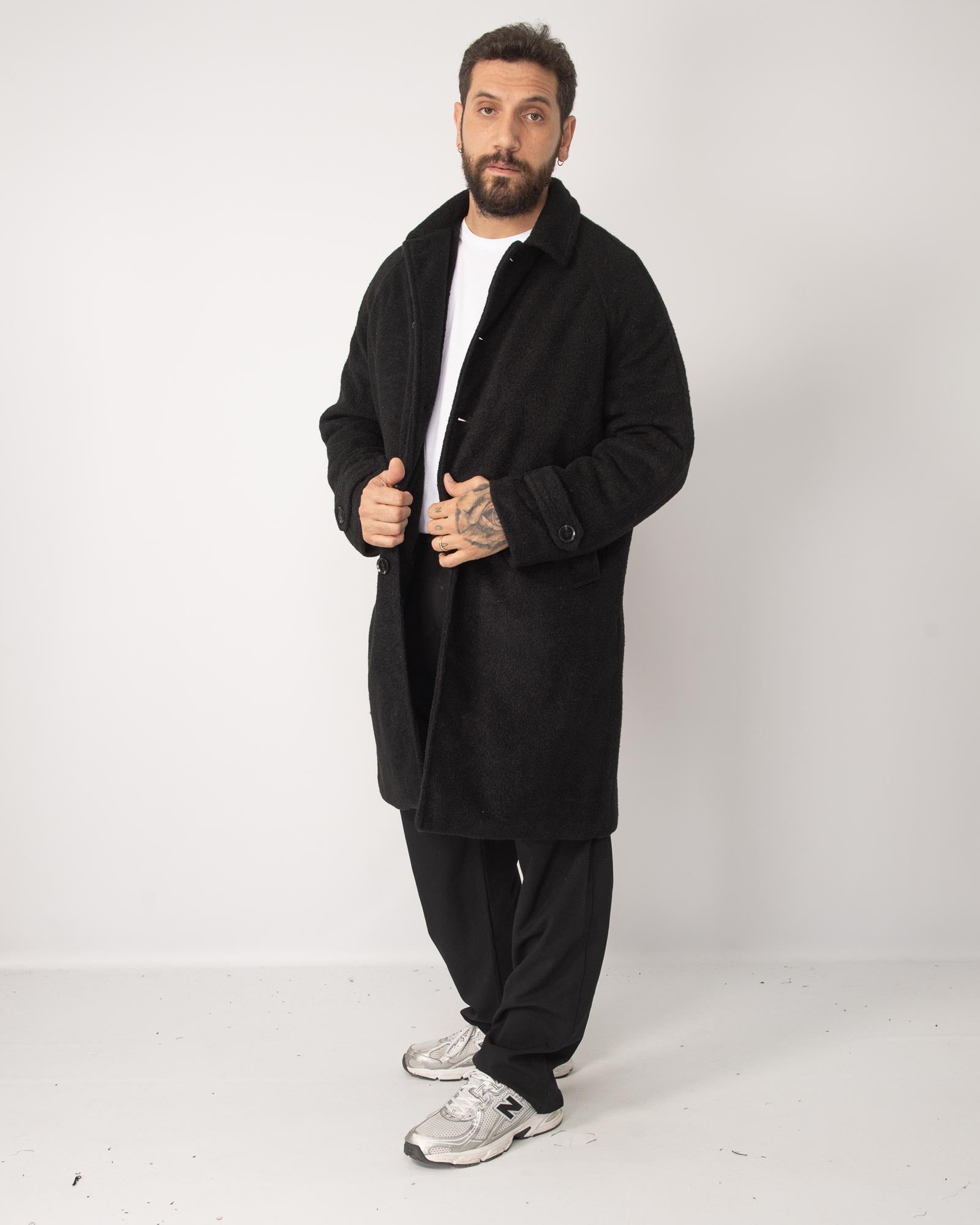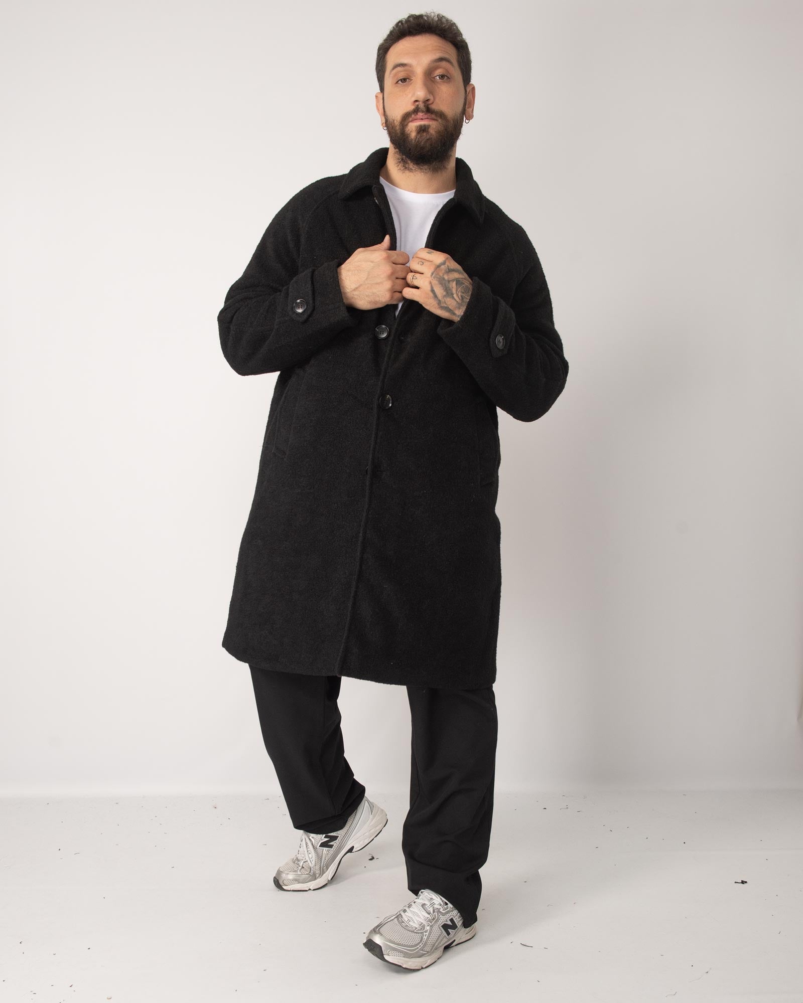 Cappotto oversize realizzato in tessuto con texture bouclé. Collo college e maniche lunghe rifinite con polsino abbottonato. Tasche a filetto sui fianchi e dettaglio tasca interna. Orlo con spacco centrale posteriore. In foto è indossata la taglia XL per altezza 1,85cm e peso 97kg.