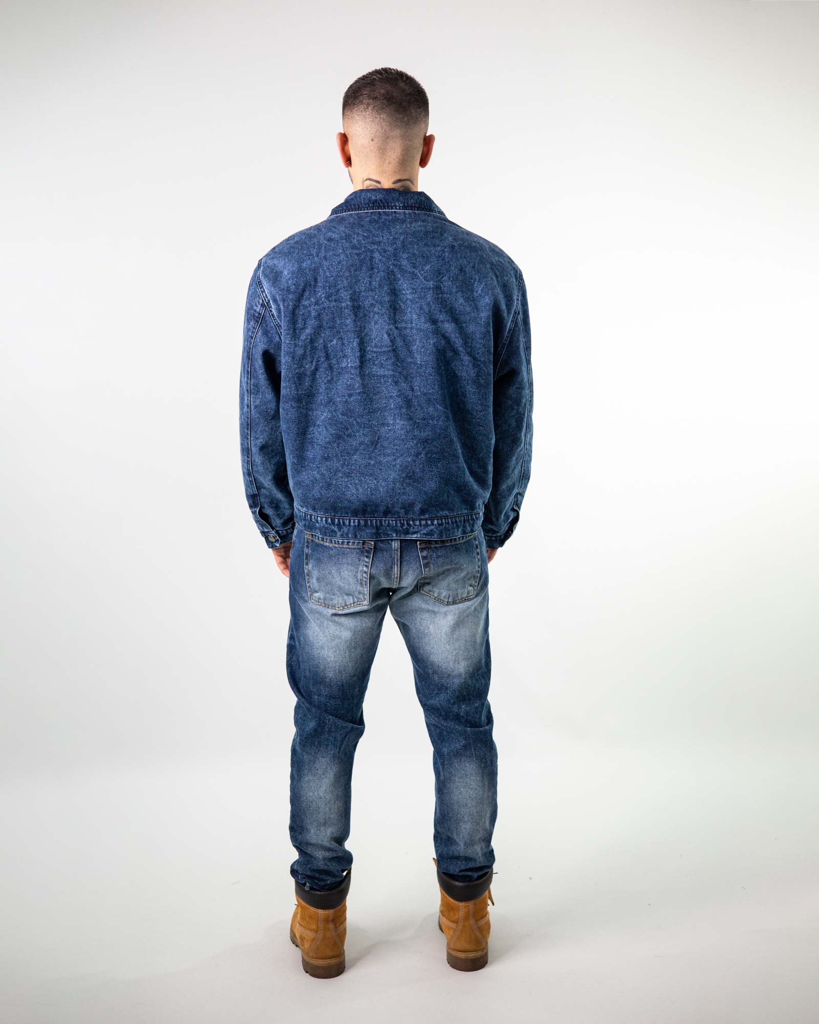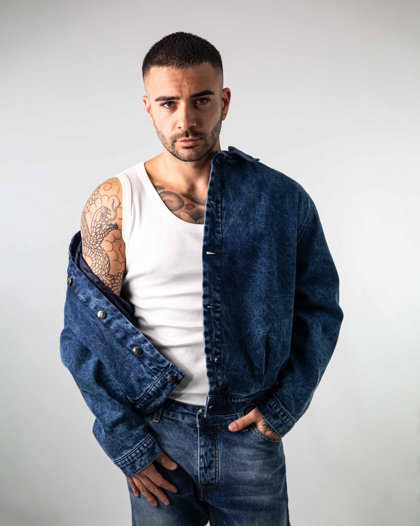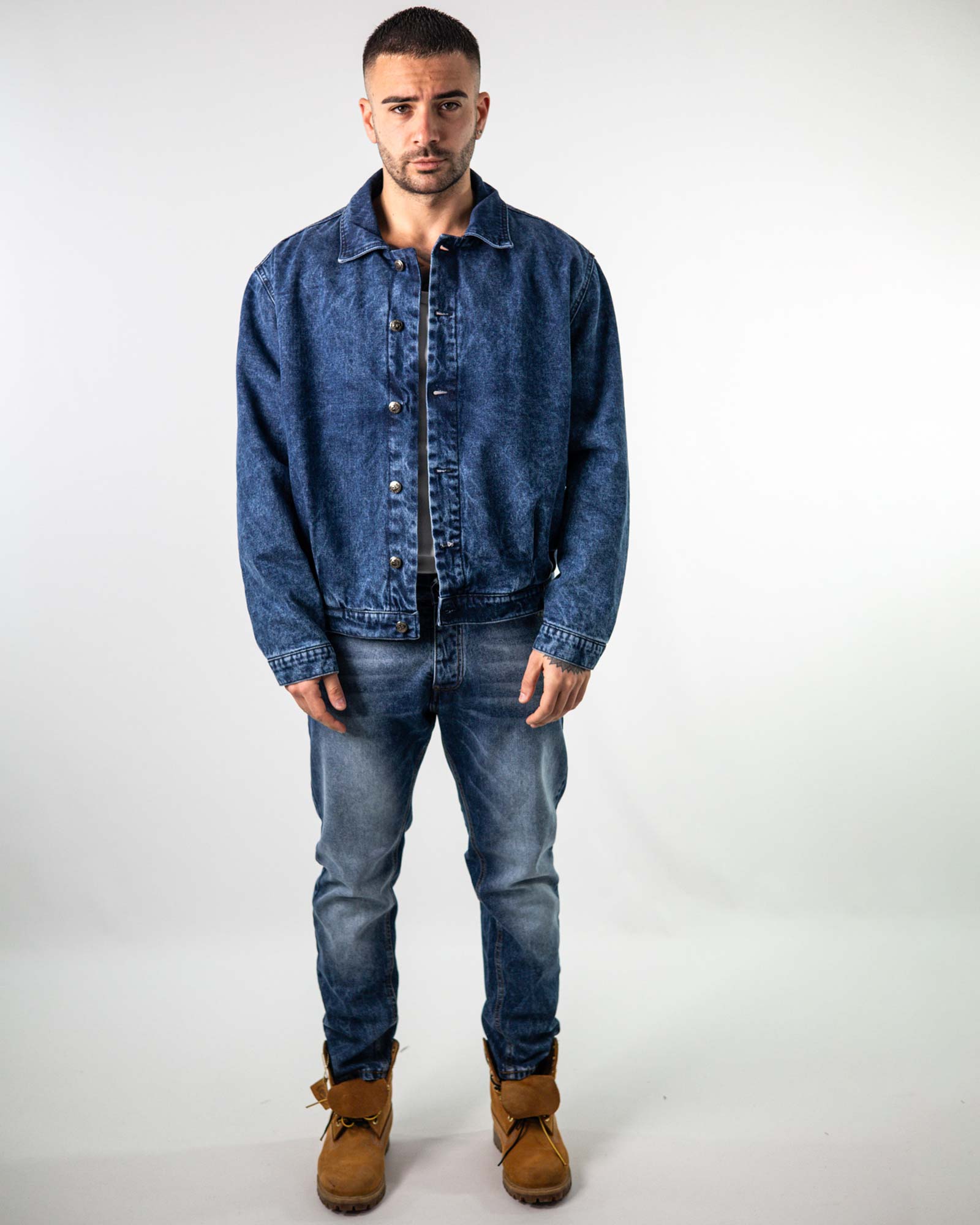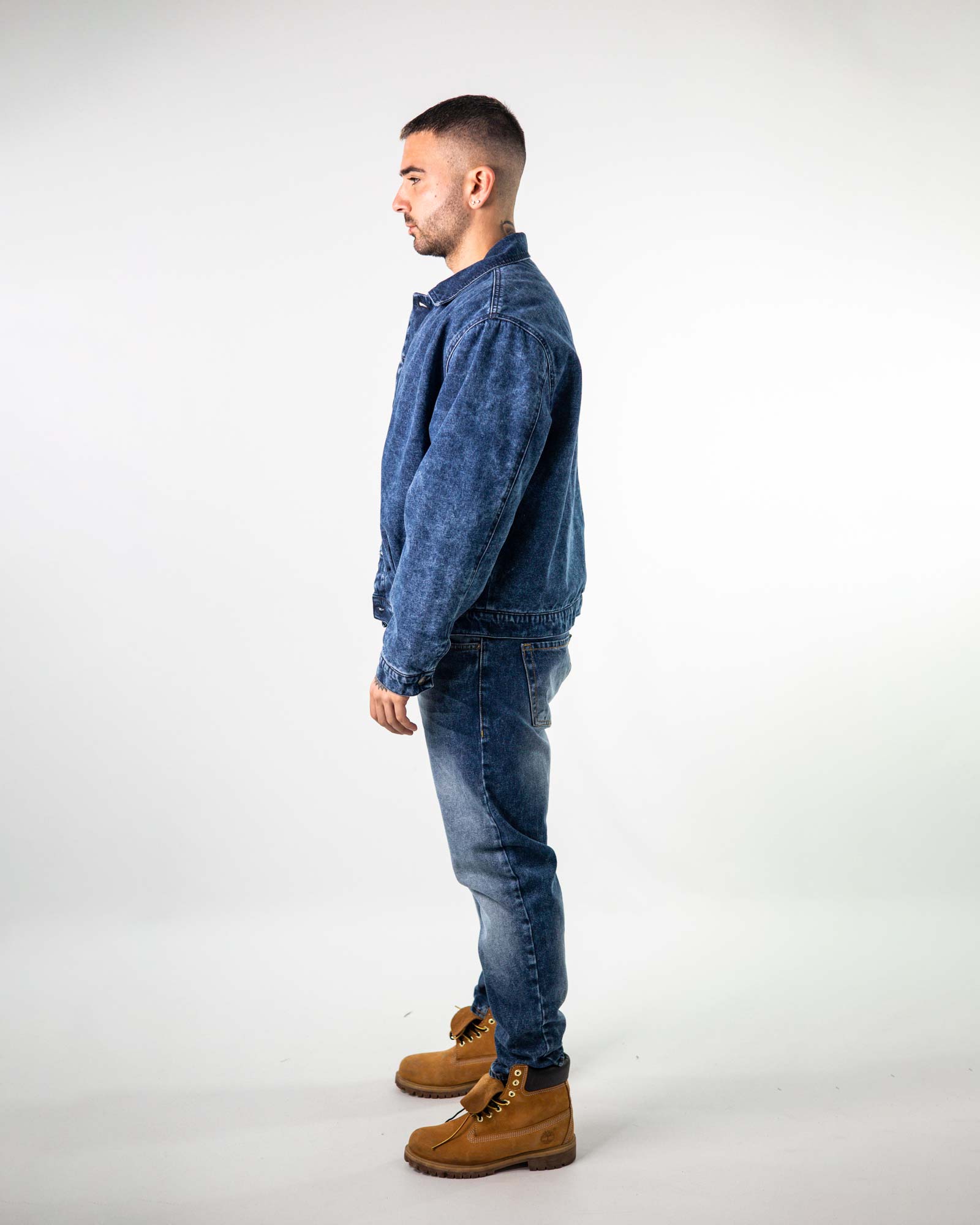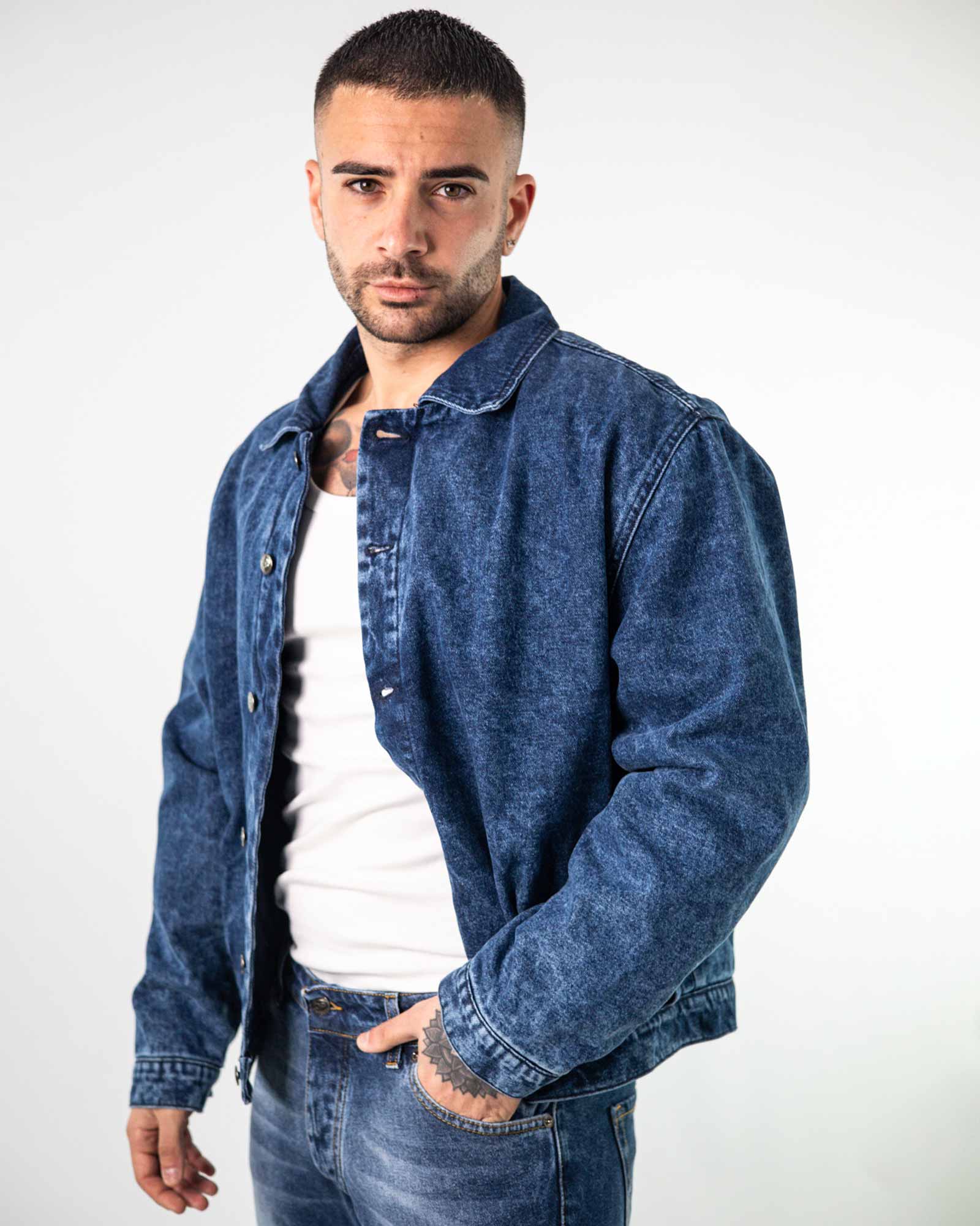 Giubbino bomber in denim manica lunga e collo classico con abbottonature frontale con sei bottoni. Presente tasche laterali a filetto e trapunta interna leggermente imbottina.