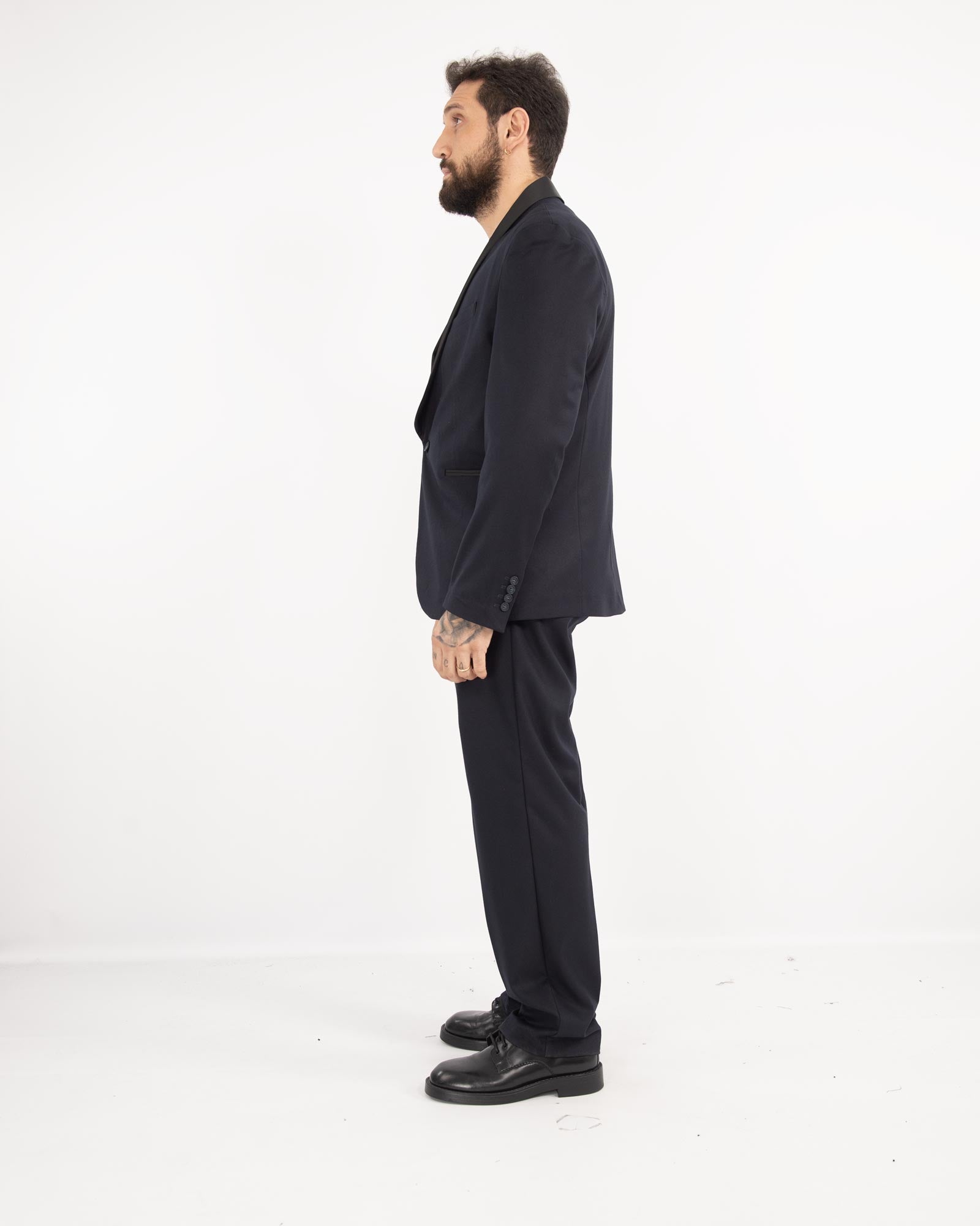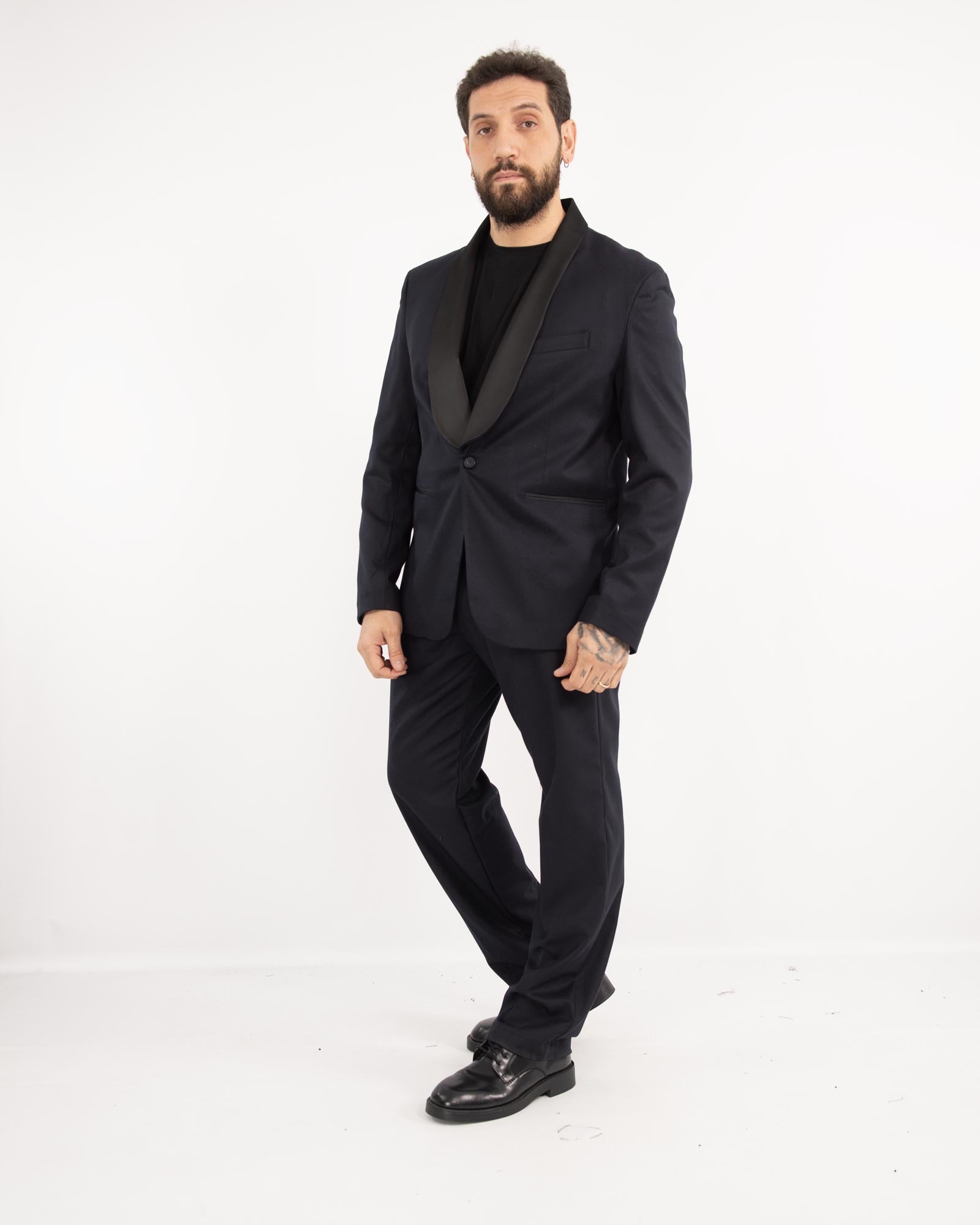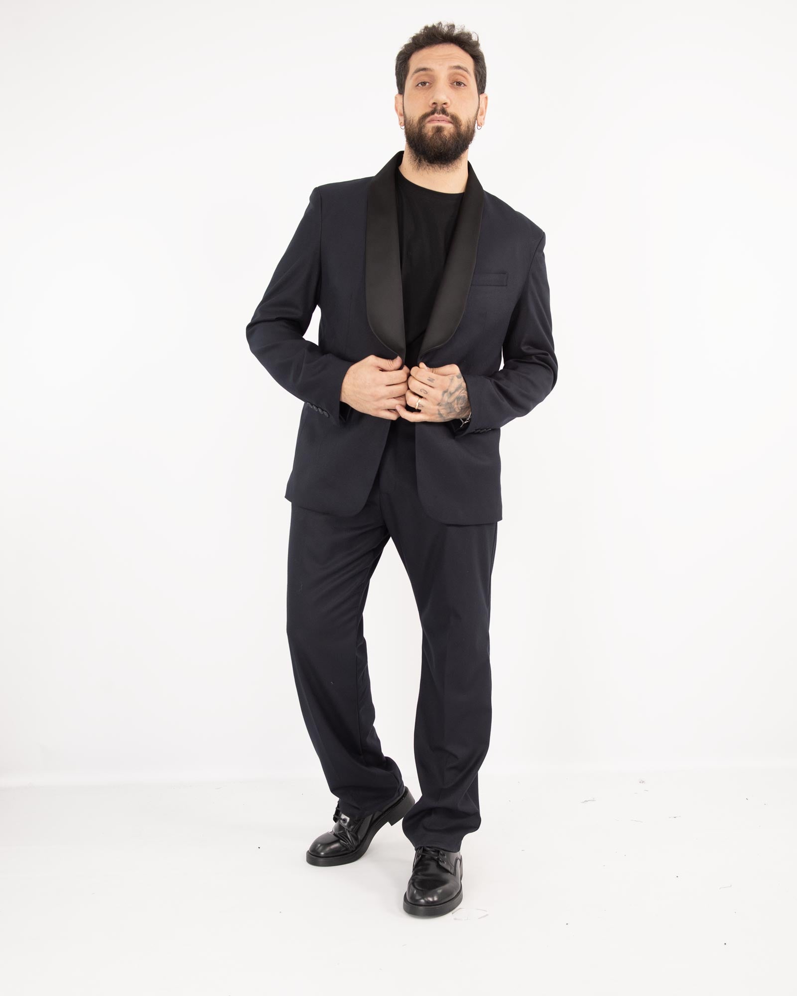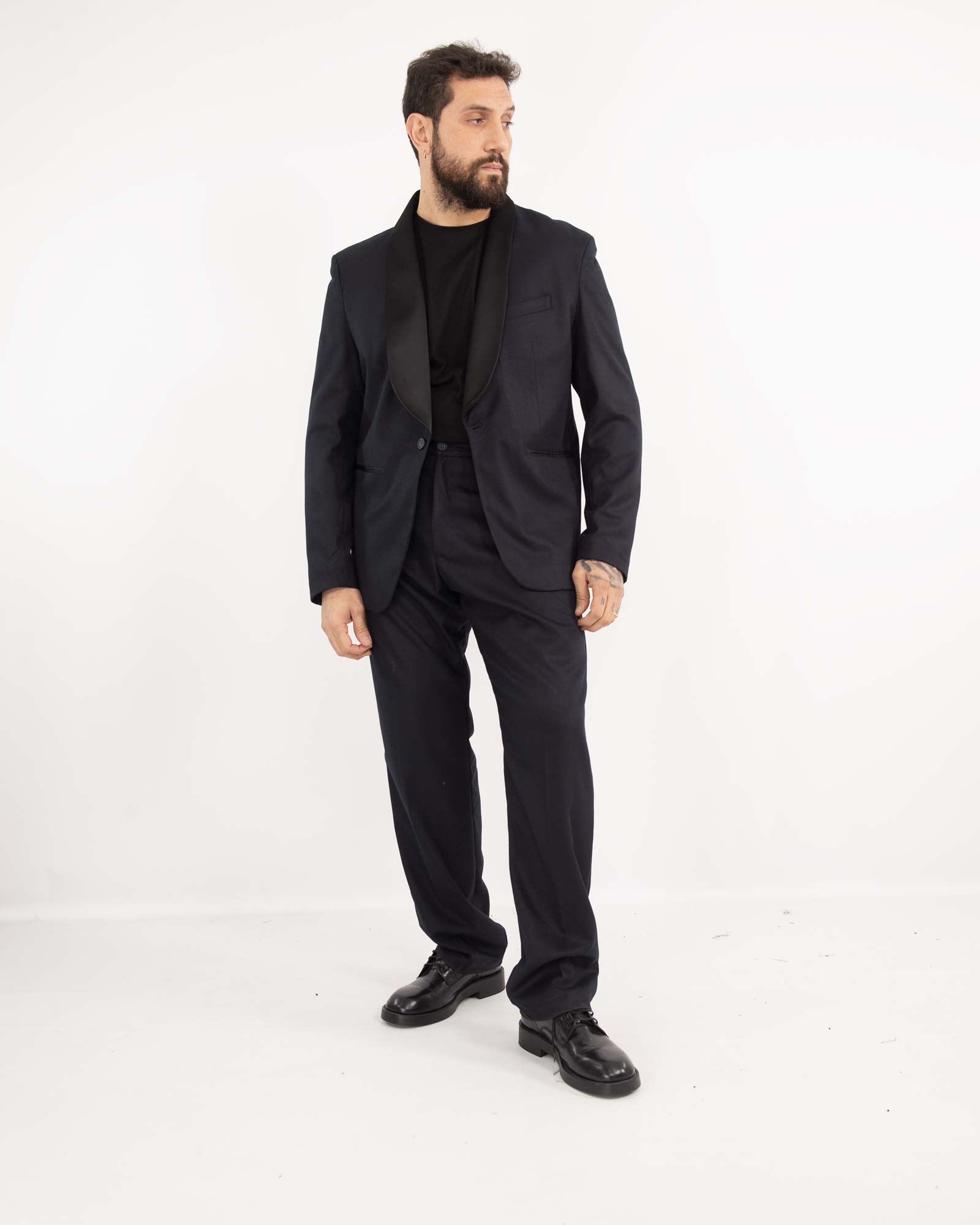 Abito smoking in flanella composto da giacca a contrasto con collo revers a scialle in raso e maniche lunghe con polsini e bottoni, abbinata al pantalone vita alta e fondo largo con tasche laterali e a filetto sul retro. In foto è indossata giacca taglia 56 e pantalone taglia 54 per latezza 1,85cm e peso 97kg.
