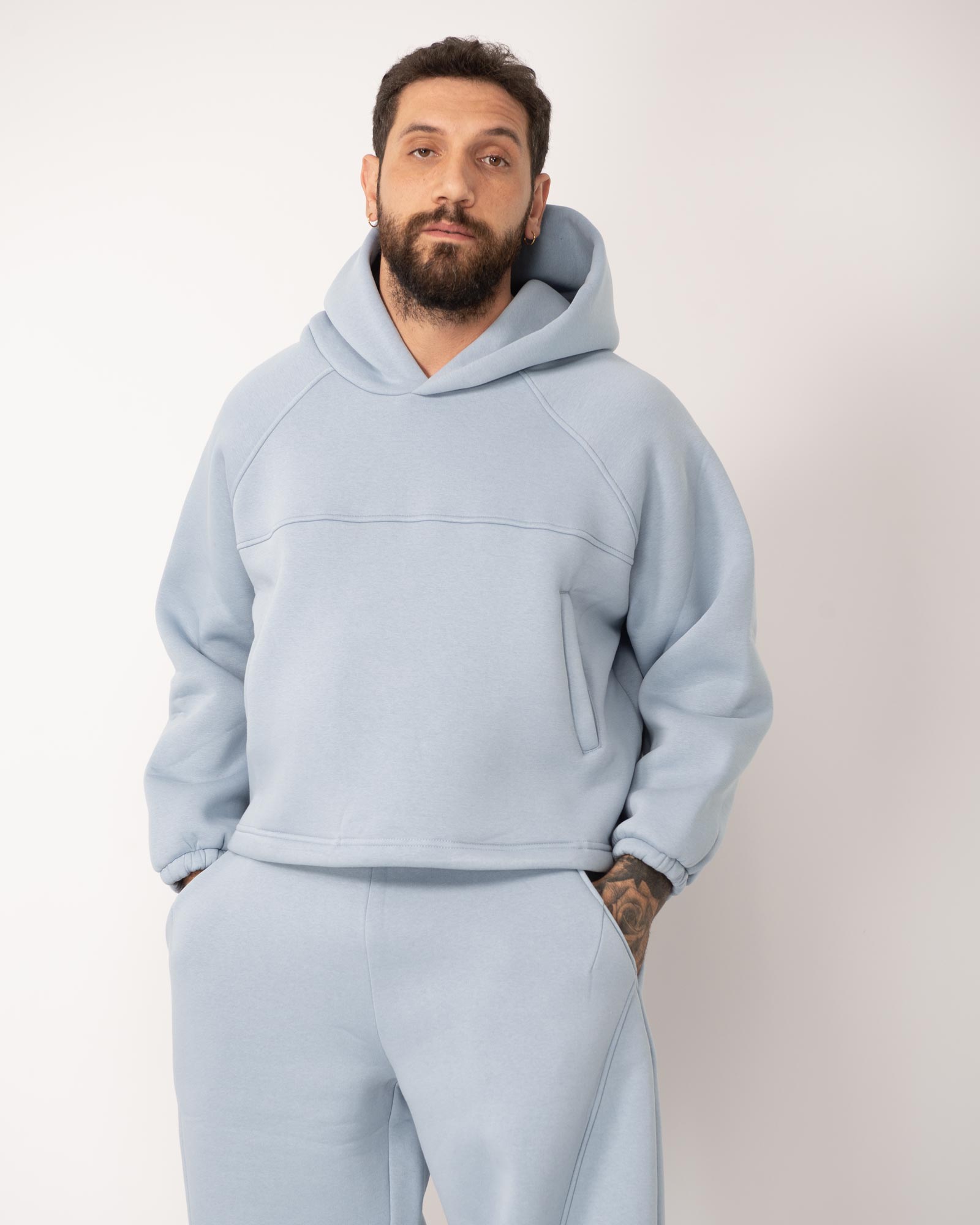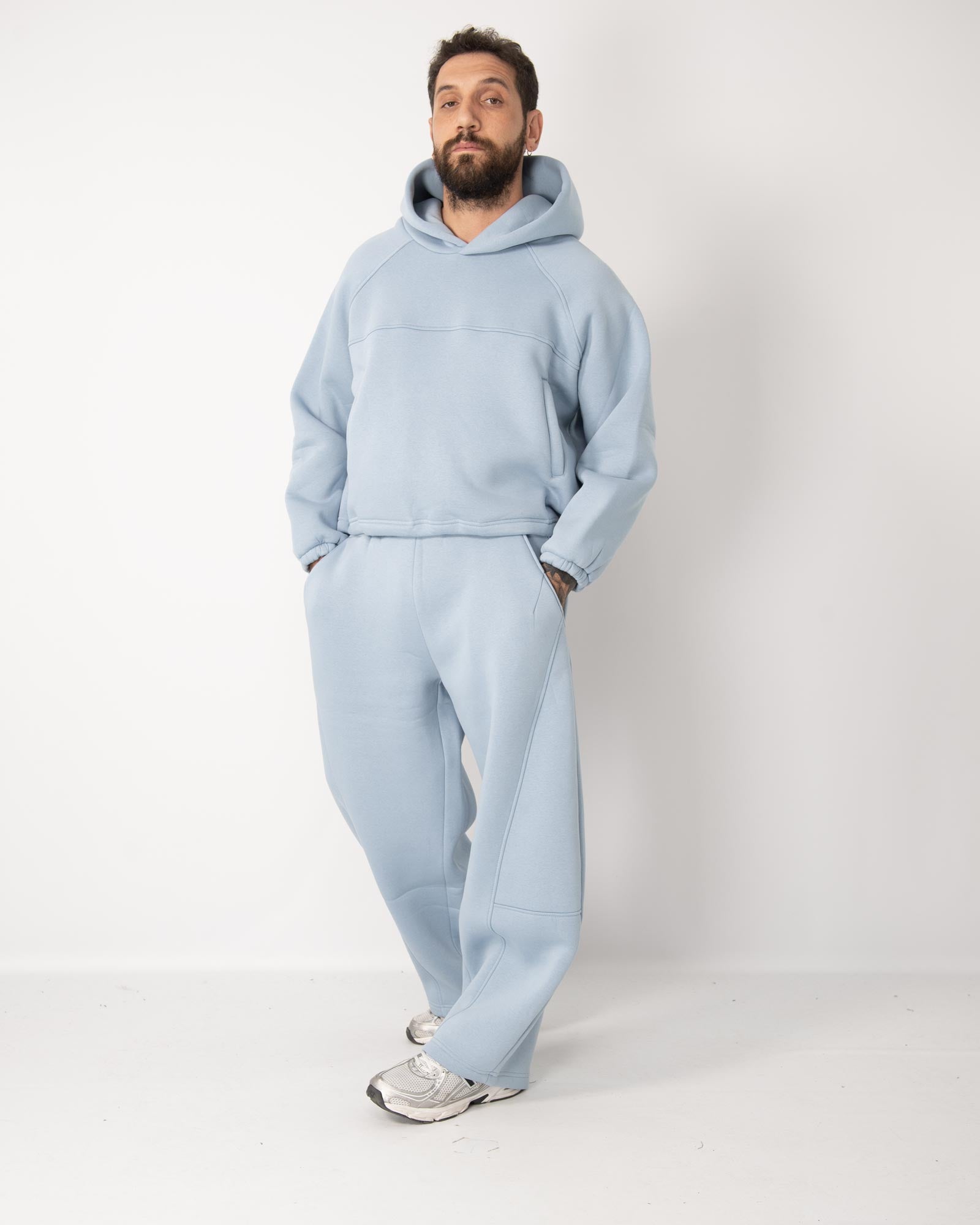 La felpa presenta un design cropped fit con cappuccio e pratiche tasche sul davanti, rifinita con elastico regolabile sul fondo abbinata al pantatuta dal taglio balloon fit, garantisce massima libertà di movimento grazie all’elastico in vita con coulisse regolabile e alle tasche laterali funzionali. In foto è indossata per la felpa la taglia XL e il pantatuta L per altezza 1,85cm e peso 97kg.