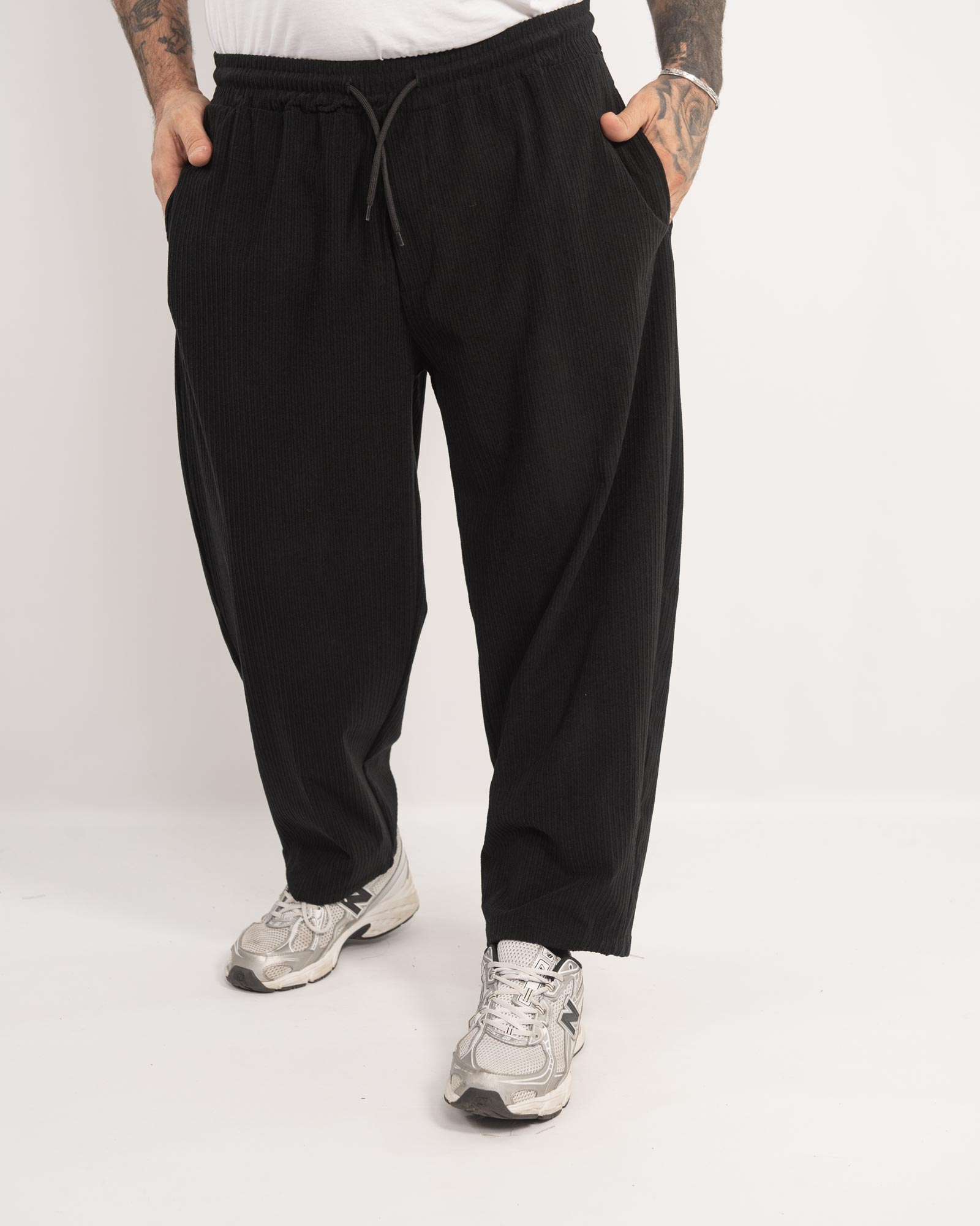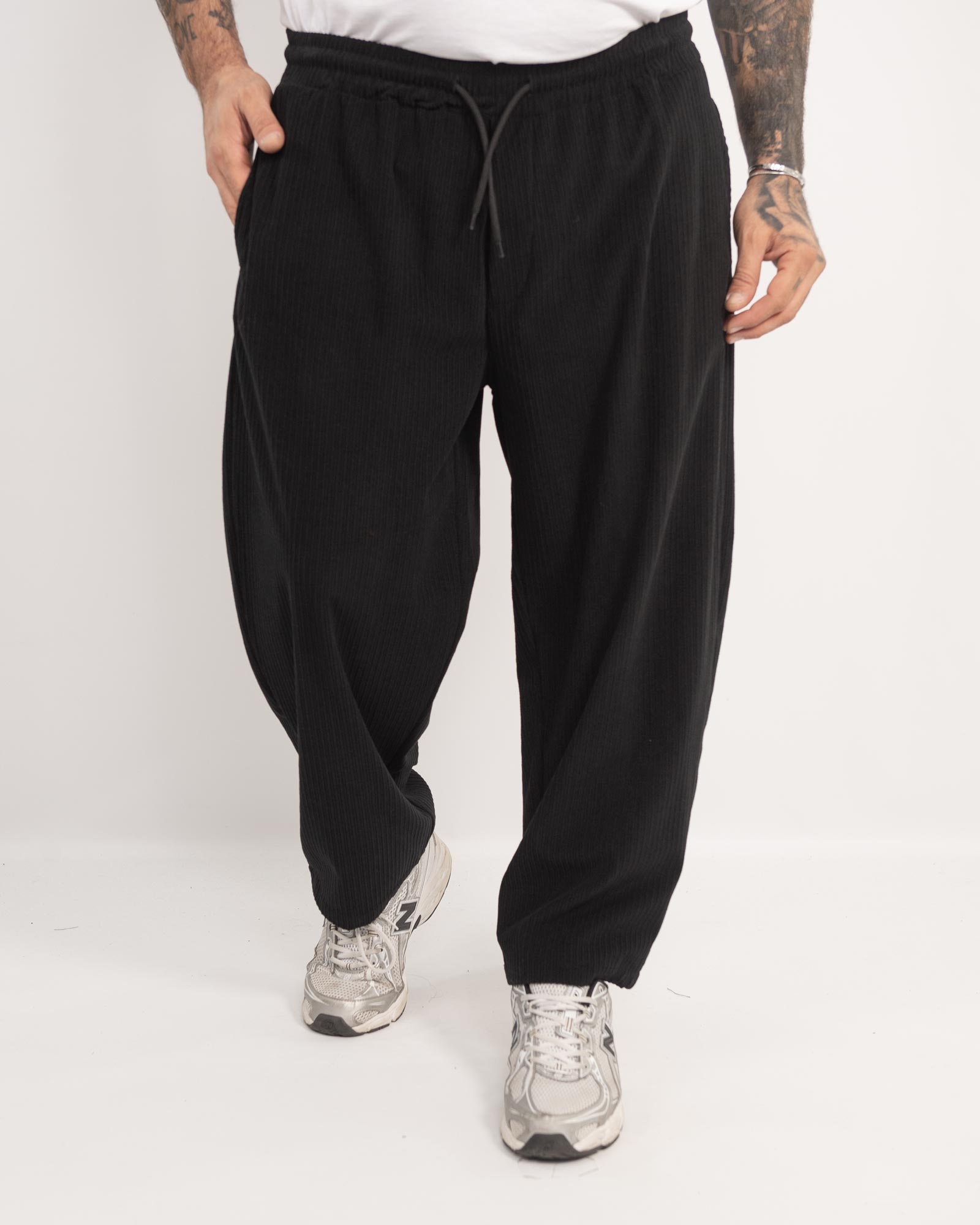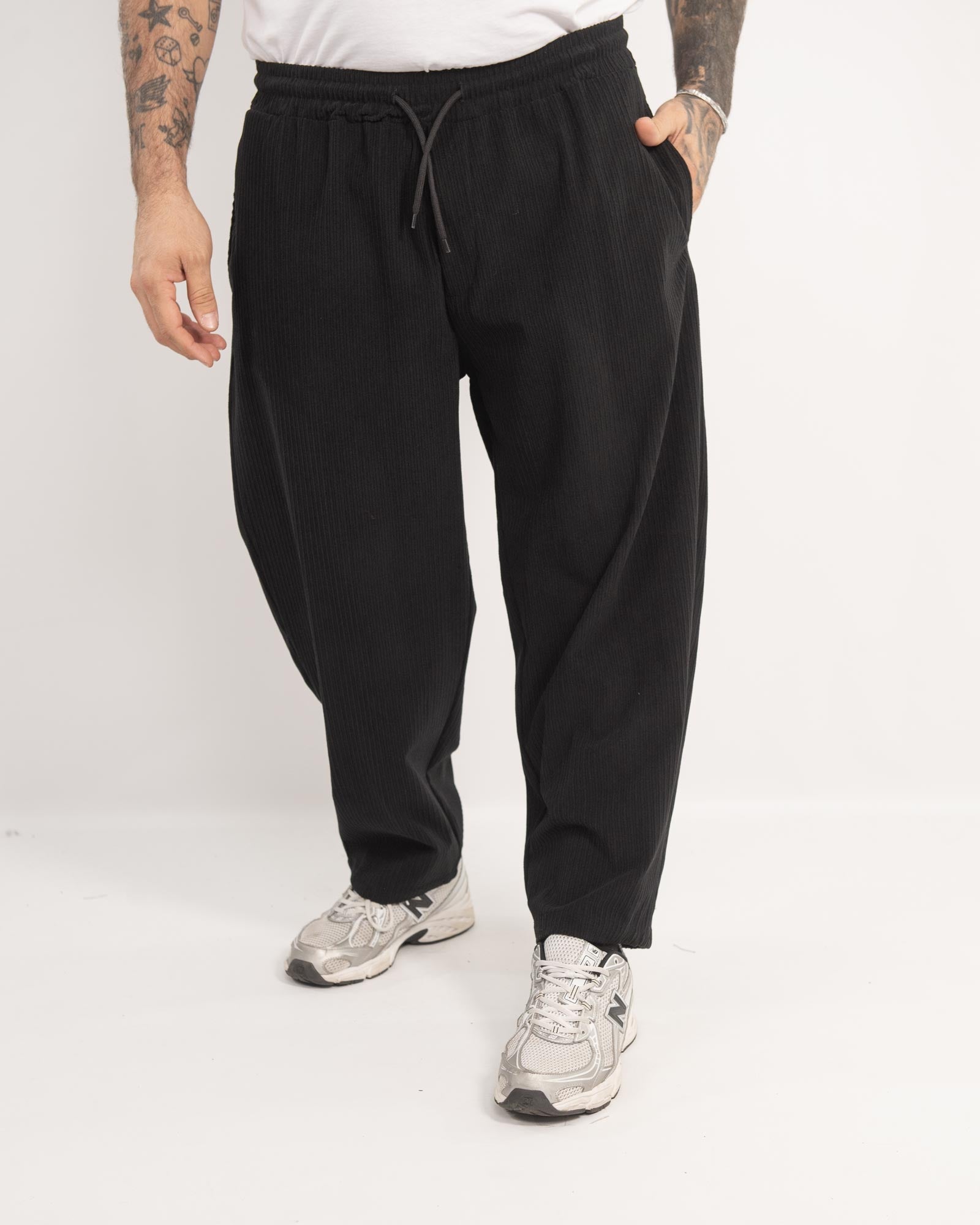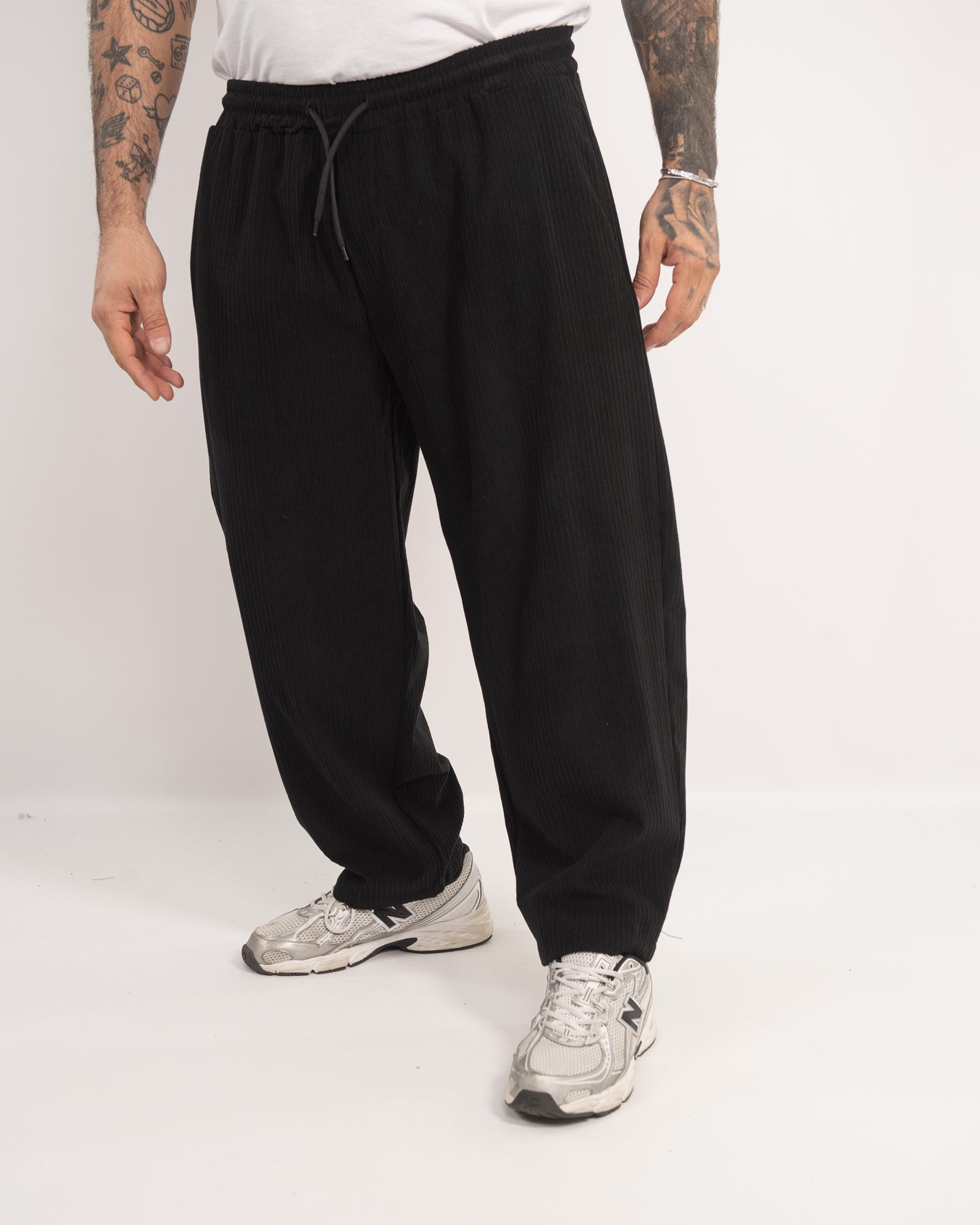 Pantalaccio balloon fit realizzati in velluto 100% cotone. Tasche anteriori e vita elasticizzata con coulisse regolabile. In foto è indossata taglia XL per altezza 1,85cm e peso 97kg.