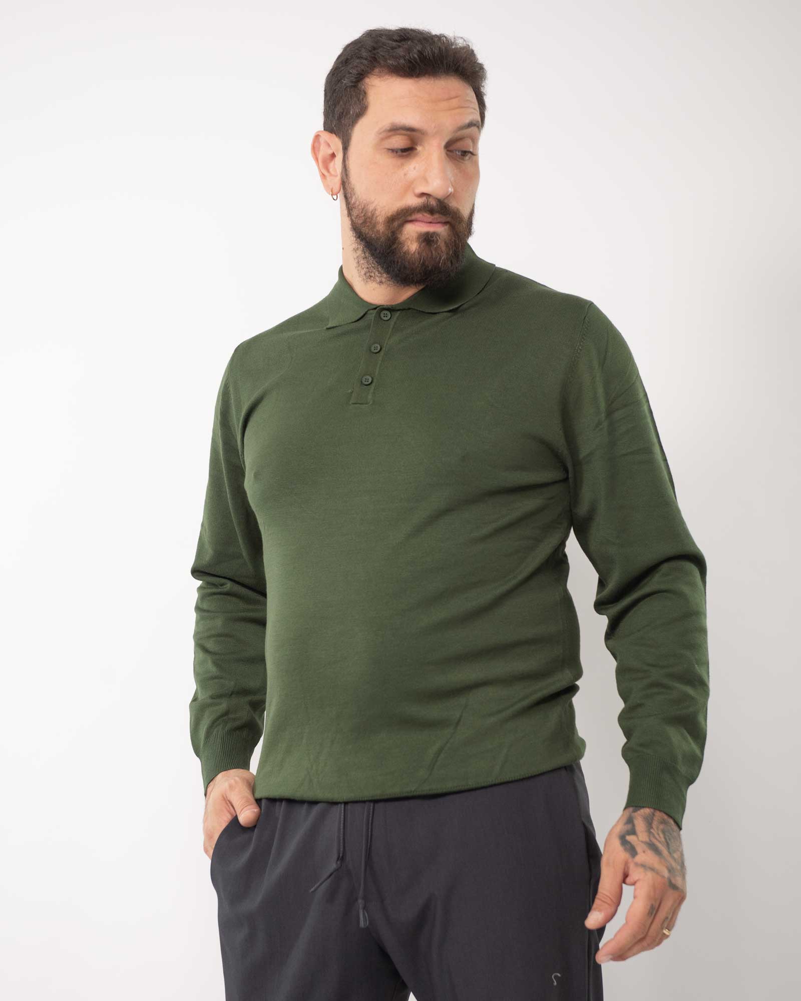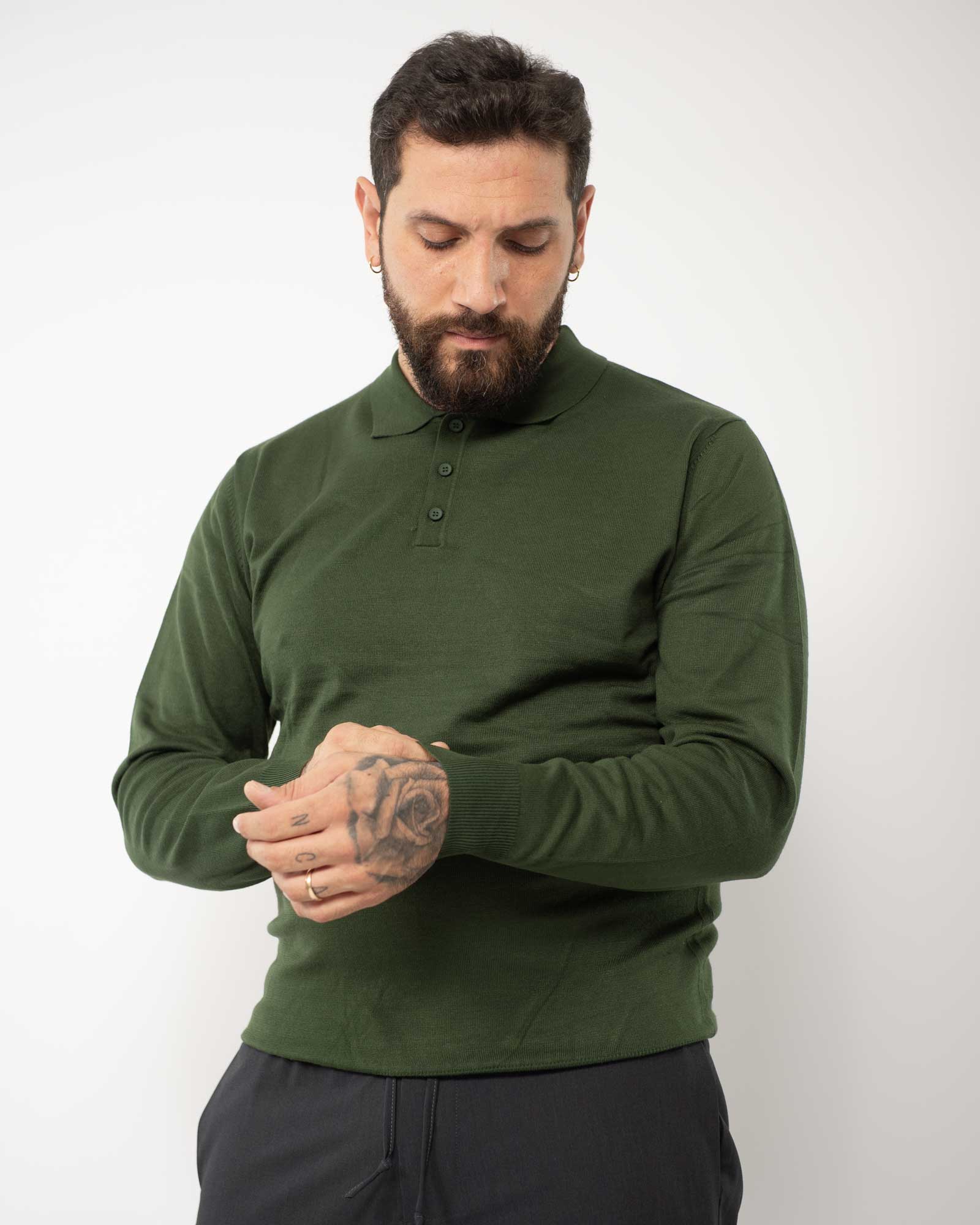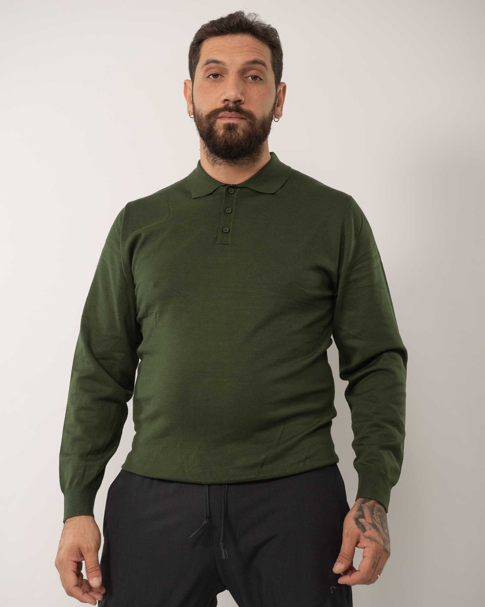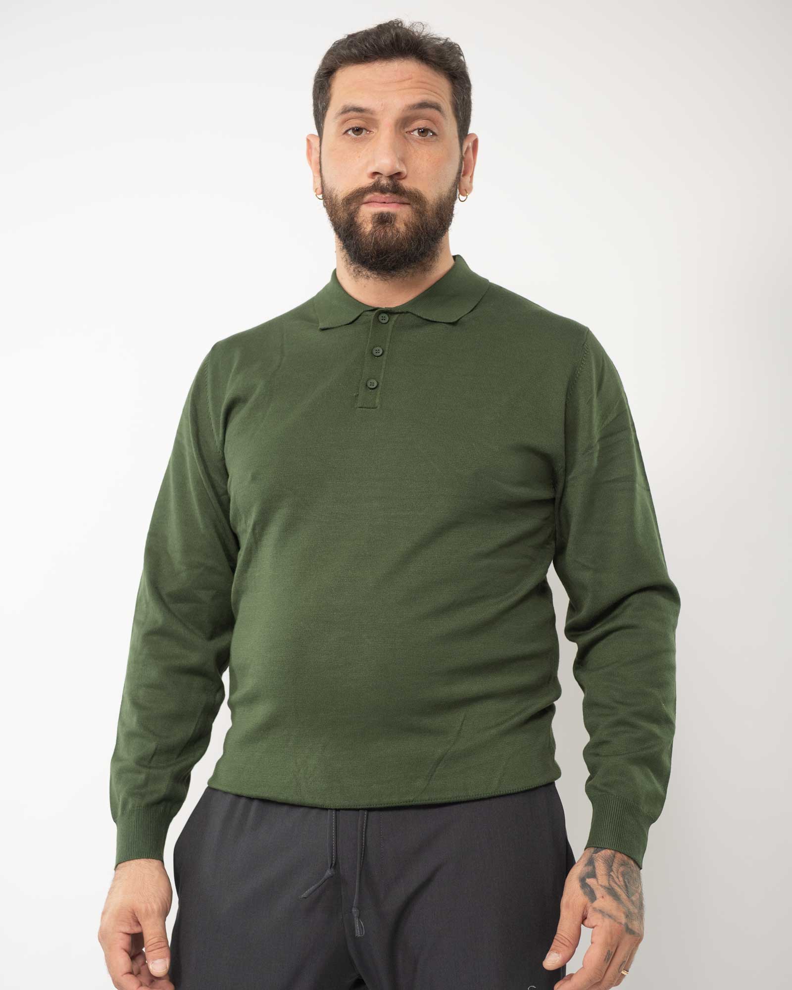 Polo collo camicia con chiusura frontale a bottoni e maniche lunghe. Presenta finiture a coste, in foto è indossata la taglia XXL per altezza 1,85cm e peso 97kg.