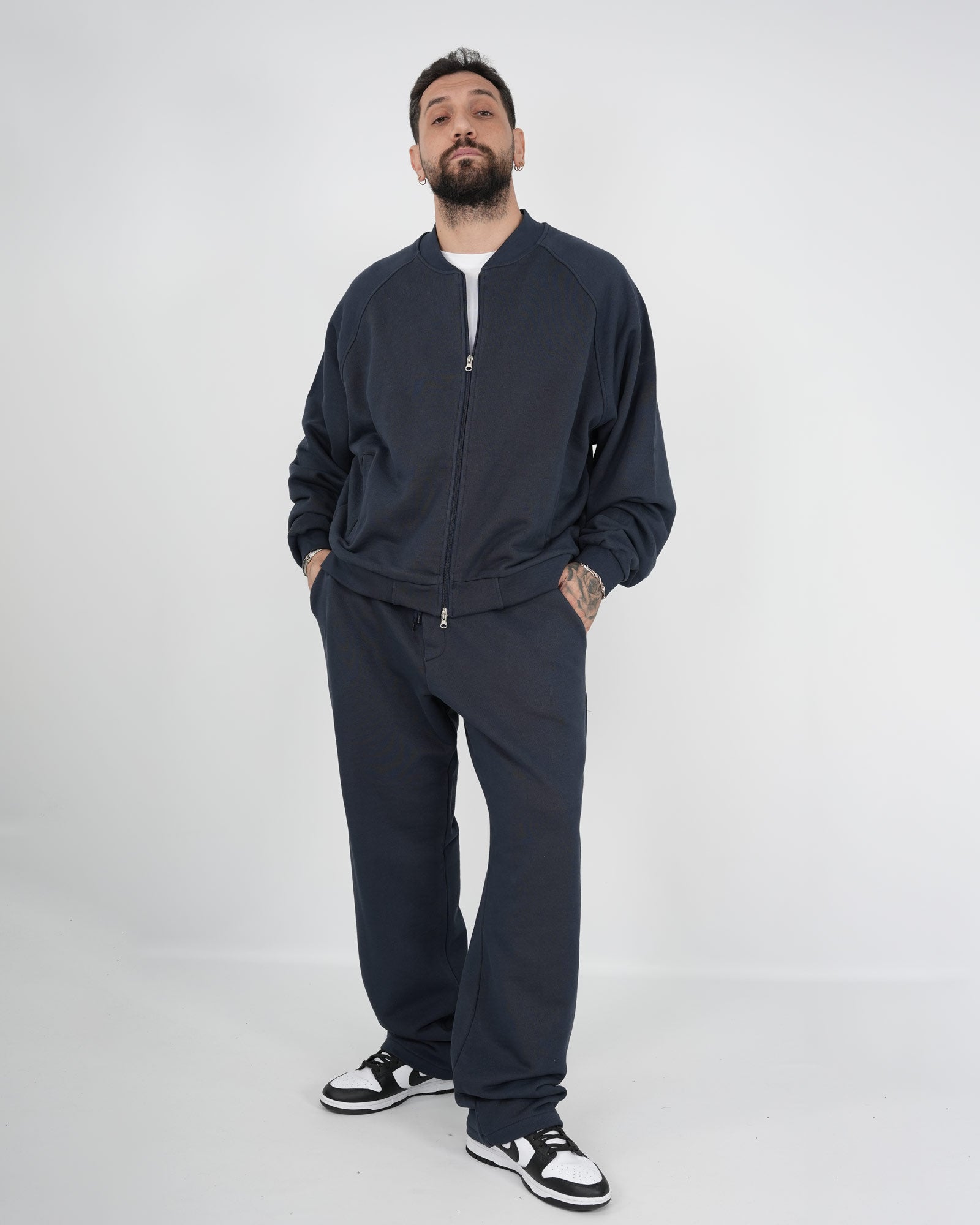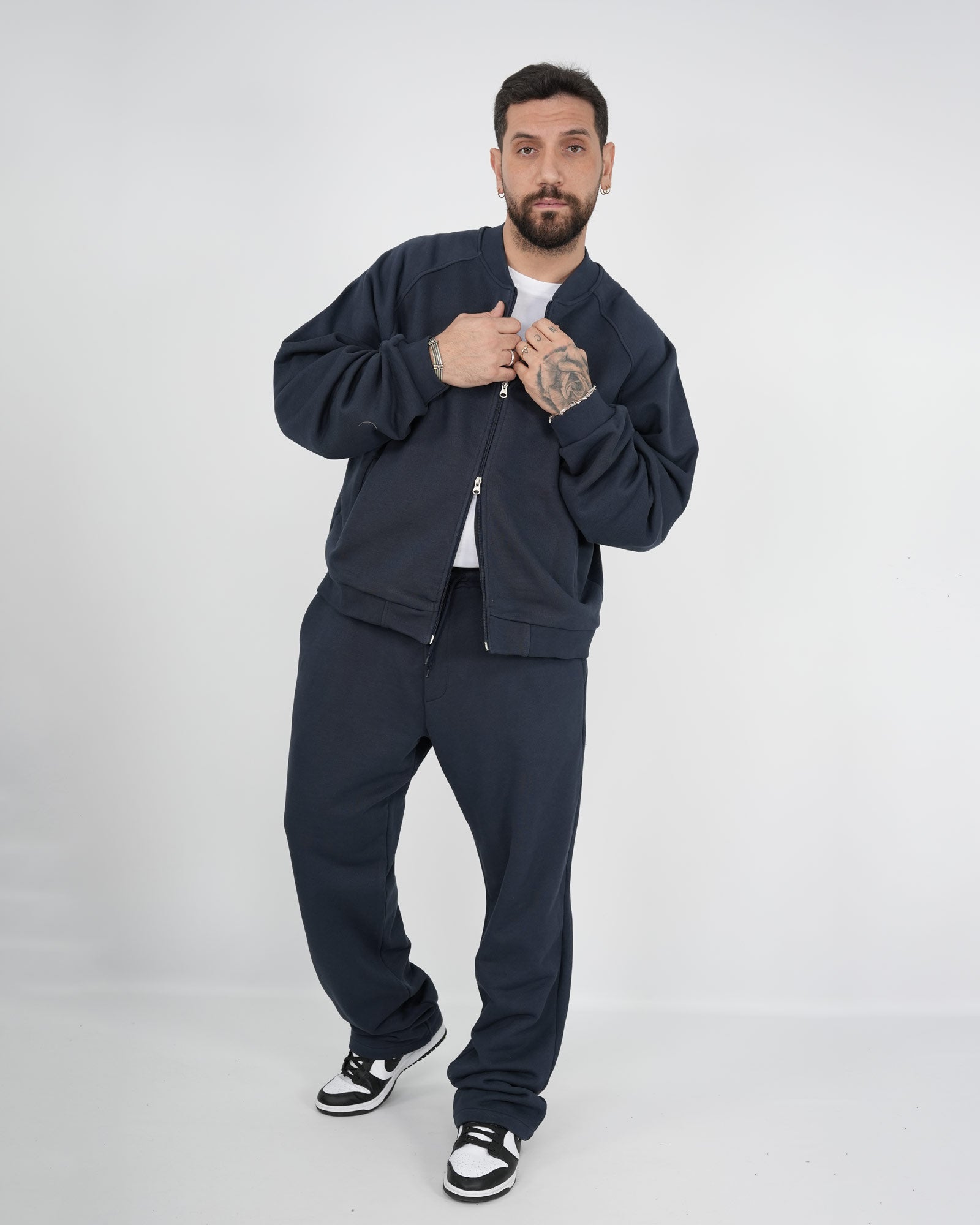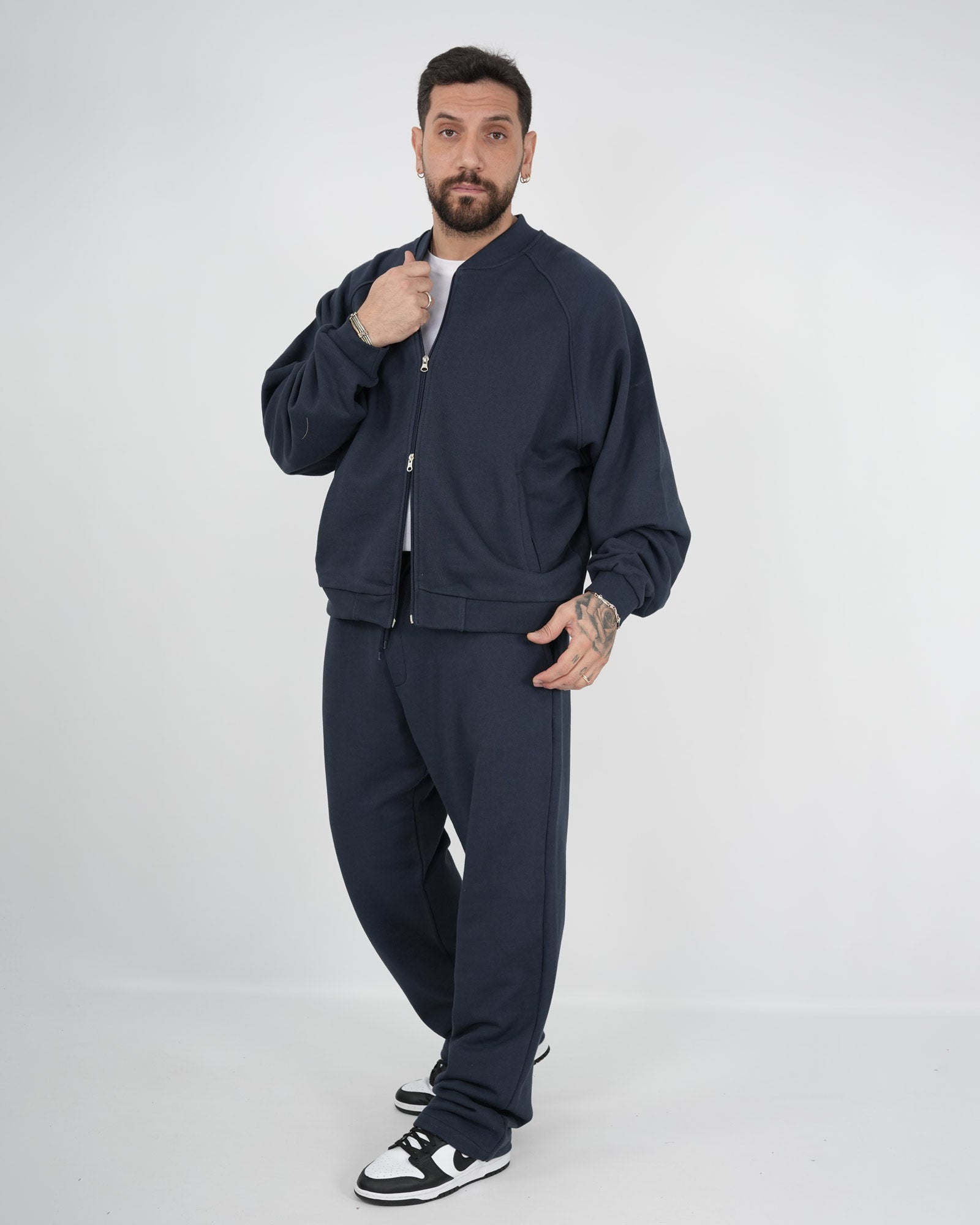 Coordinato tuta composto da felpa girocollo modello college con maniche lunghe e chiusura con zip doppio cursore abbinata al pantatuta fondo largo con vita regolabile con coulisse. In foto è indossata la taglia XL per altezza 1.85cm e peso 97kg.