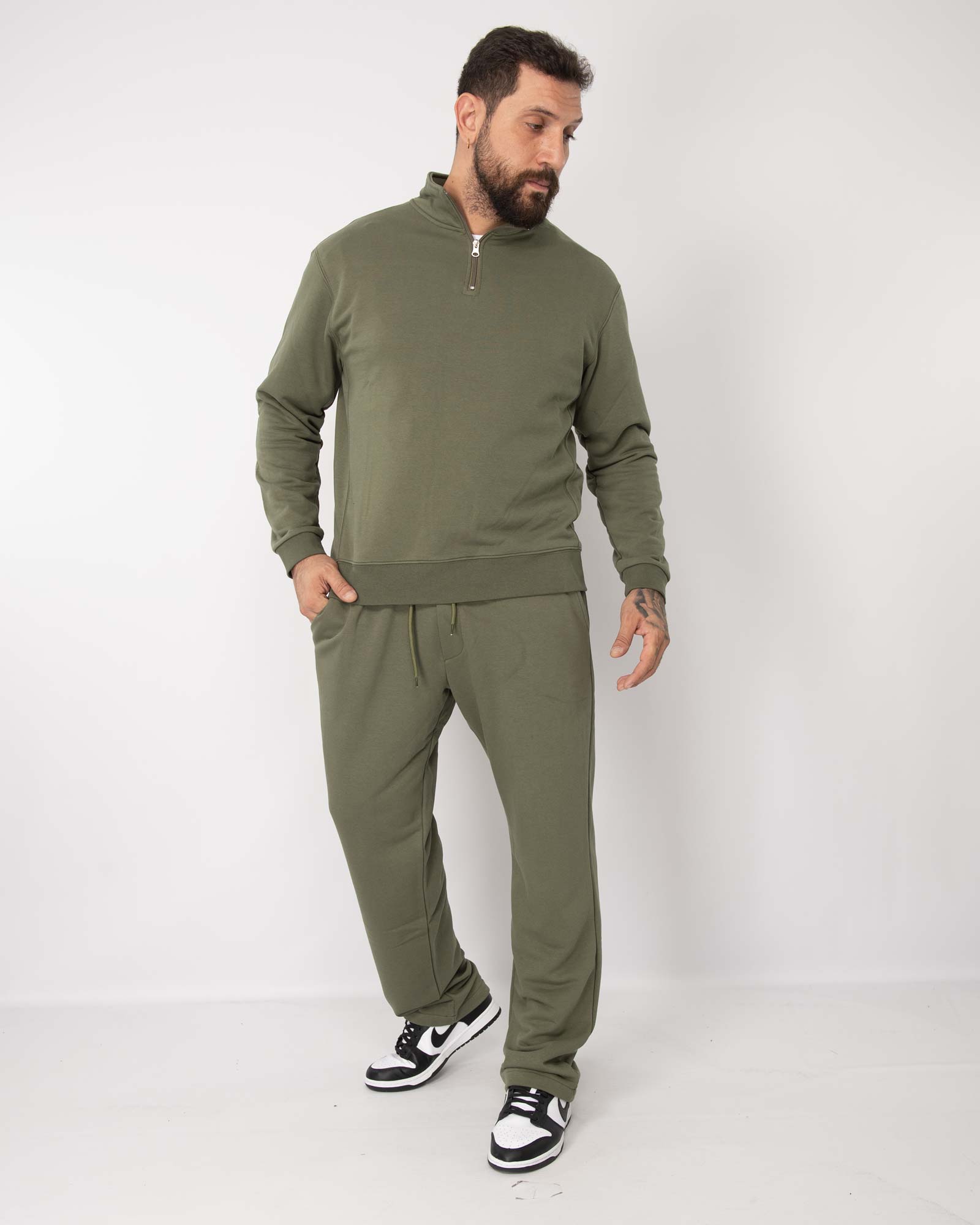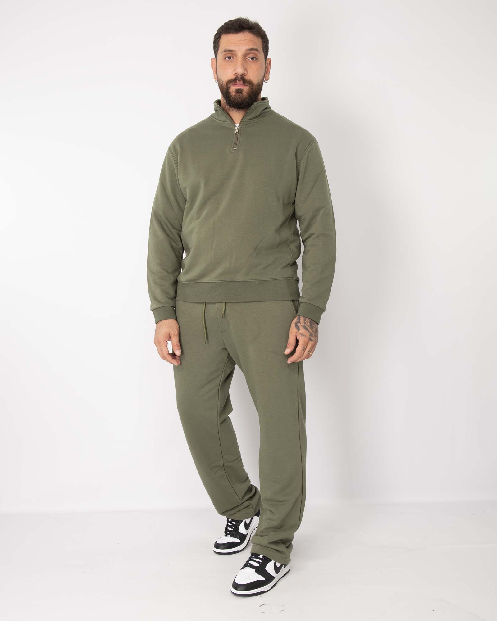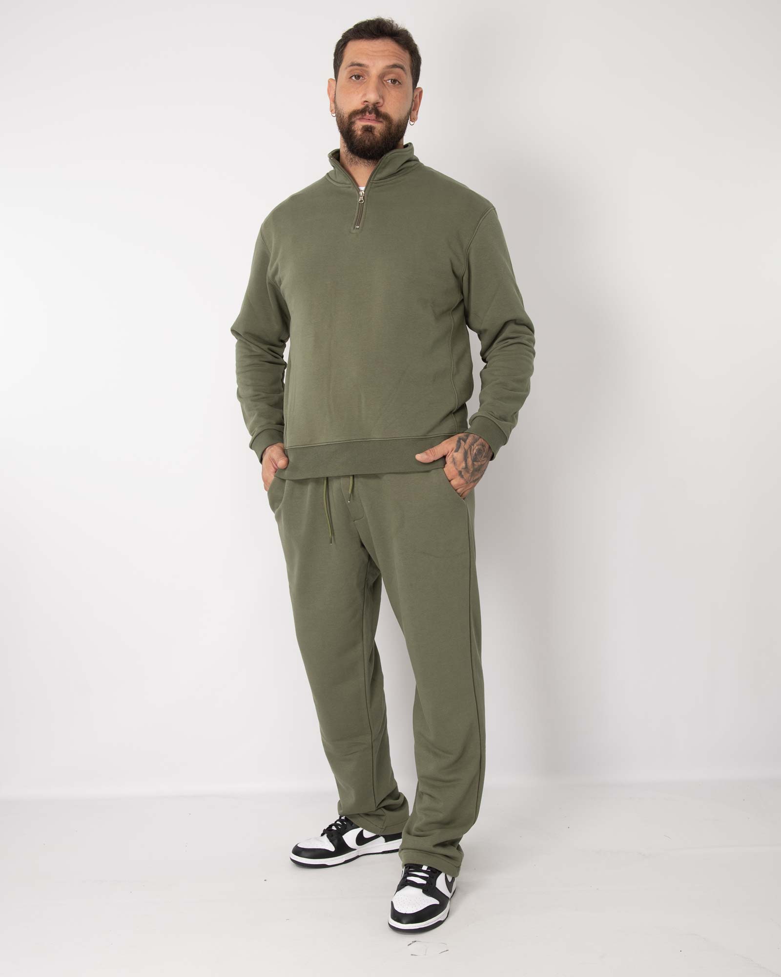 Coordinato tuta composto da felpa mezza zip regular fit con maniche lunghe abbinata al pantatuta fondo ampio con vita regolabile con coulisse. In foto è indossata la taglia XL per altezza 1.85cm e peso 97kg.