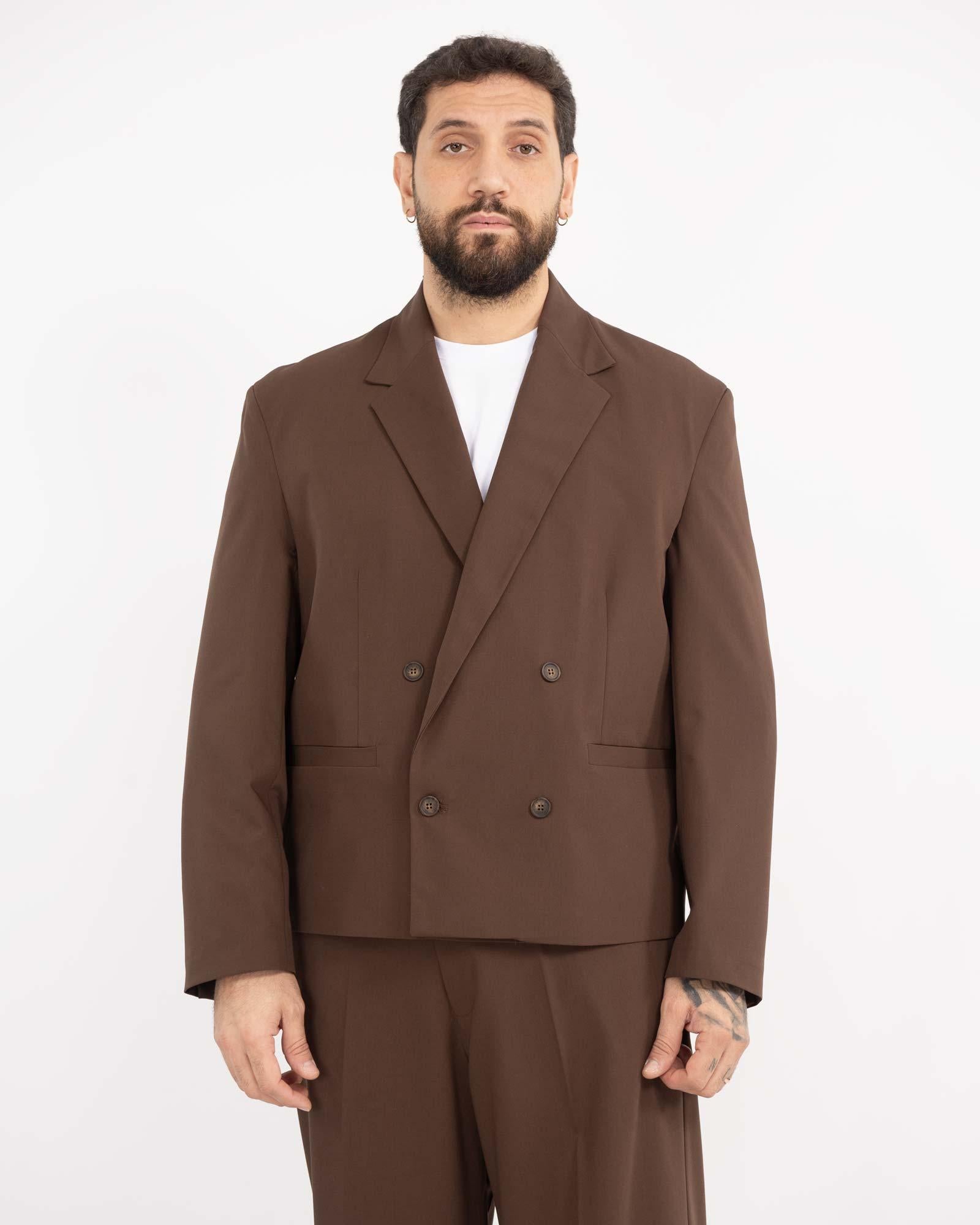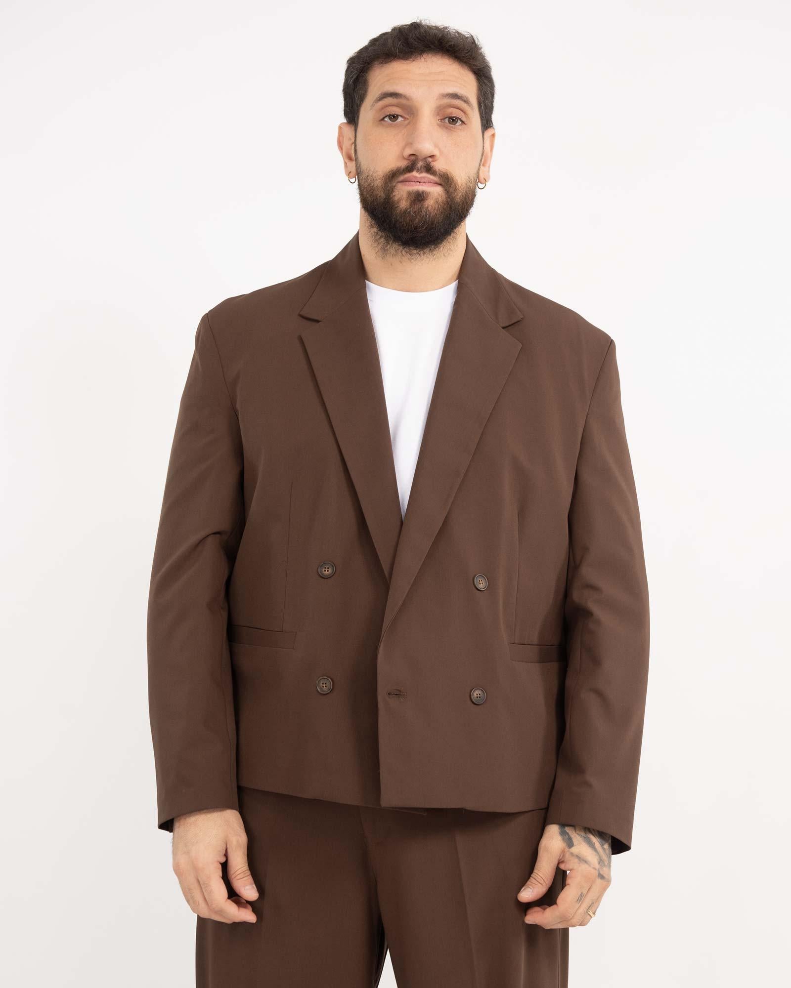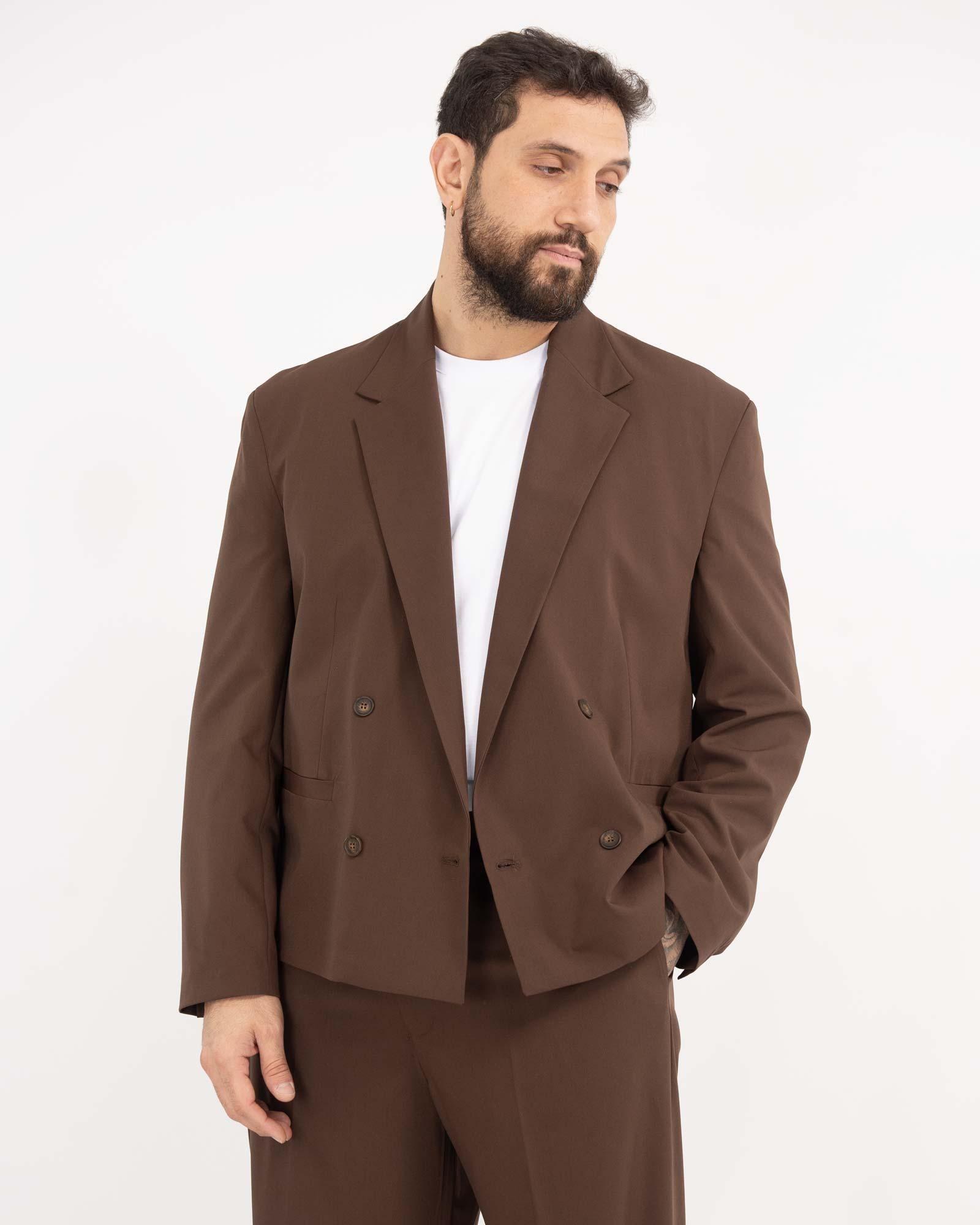 Blazer doppiopetto foderato, presenta spalline e revers ampio con tasche a toppa applicate. Il modello in foto indossa taglia 56 per altezza 1,85cm e peso 97kg.
