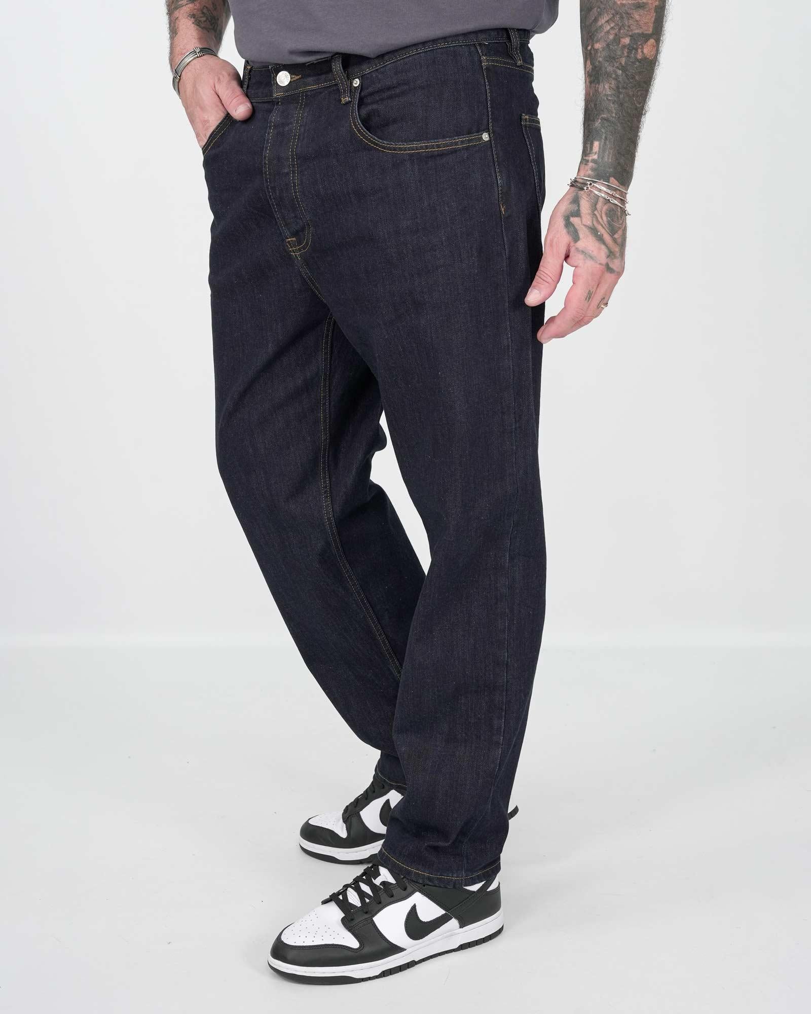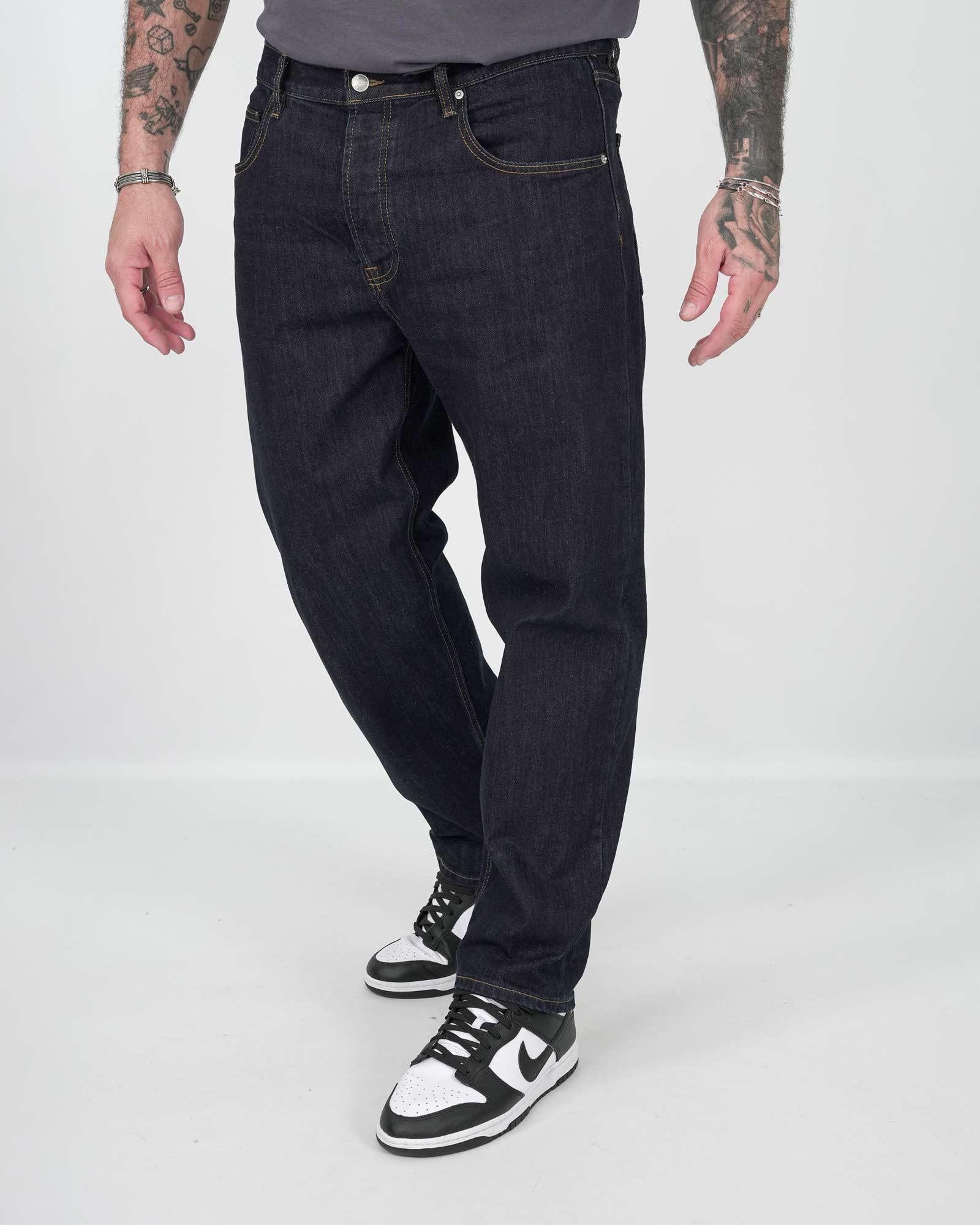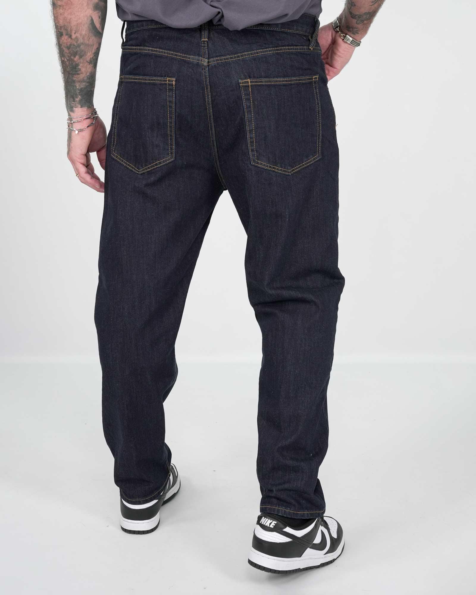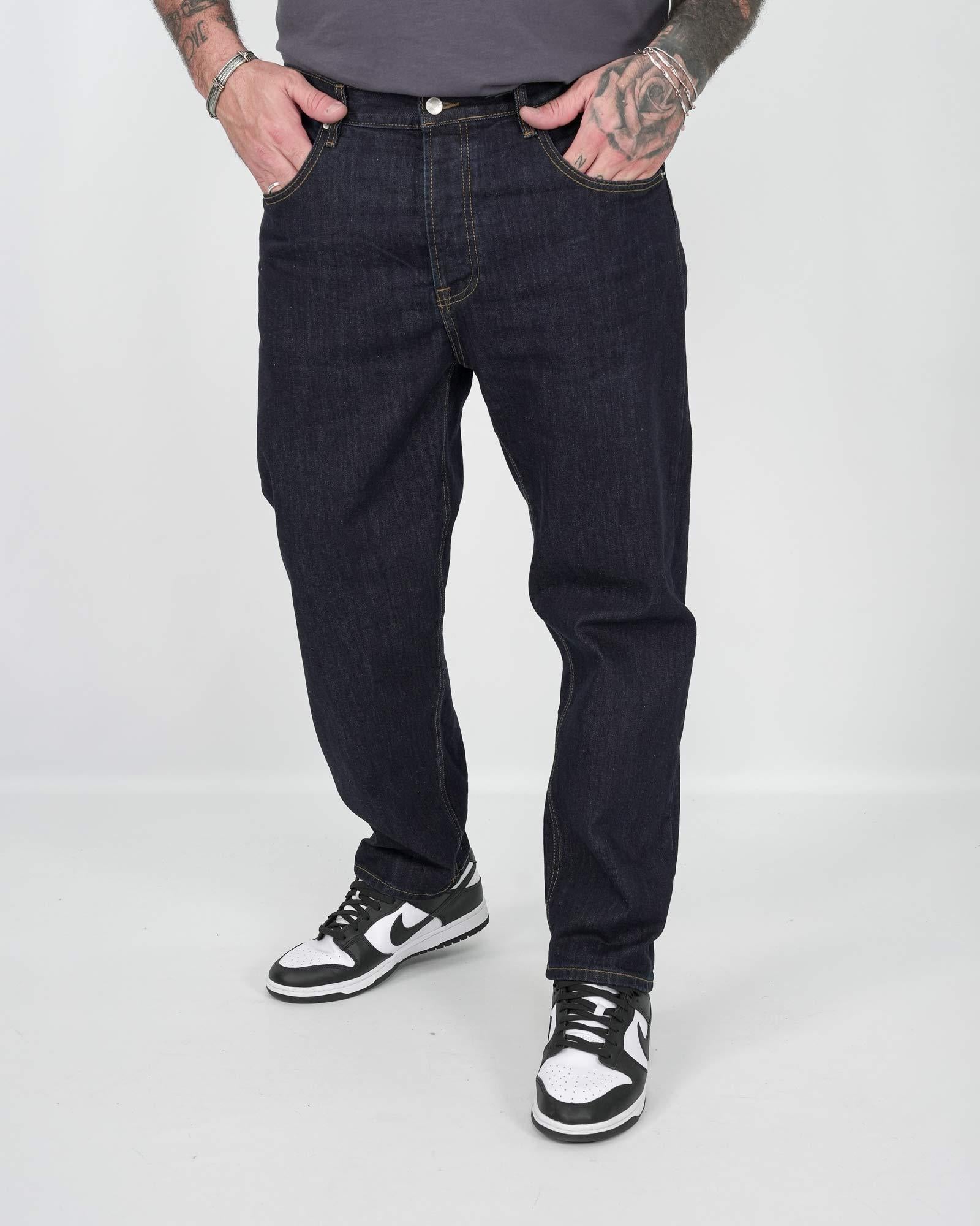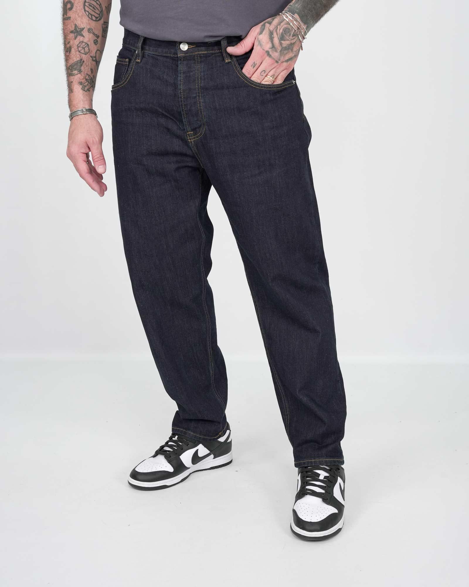 Jeans modello carrot fit, presemta chiusura frontale con bottoni e lunghezza alla caviglia fondo stretto. Tessuto fisso 100% cotone. Il modello in foto indossa una 54 per altezza 1,85cm e peso 97kg.