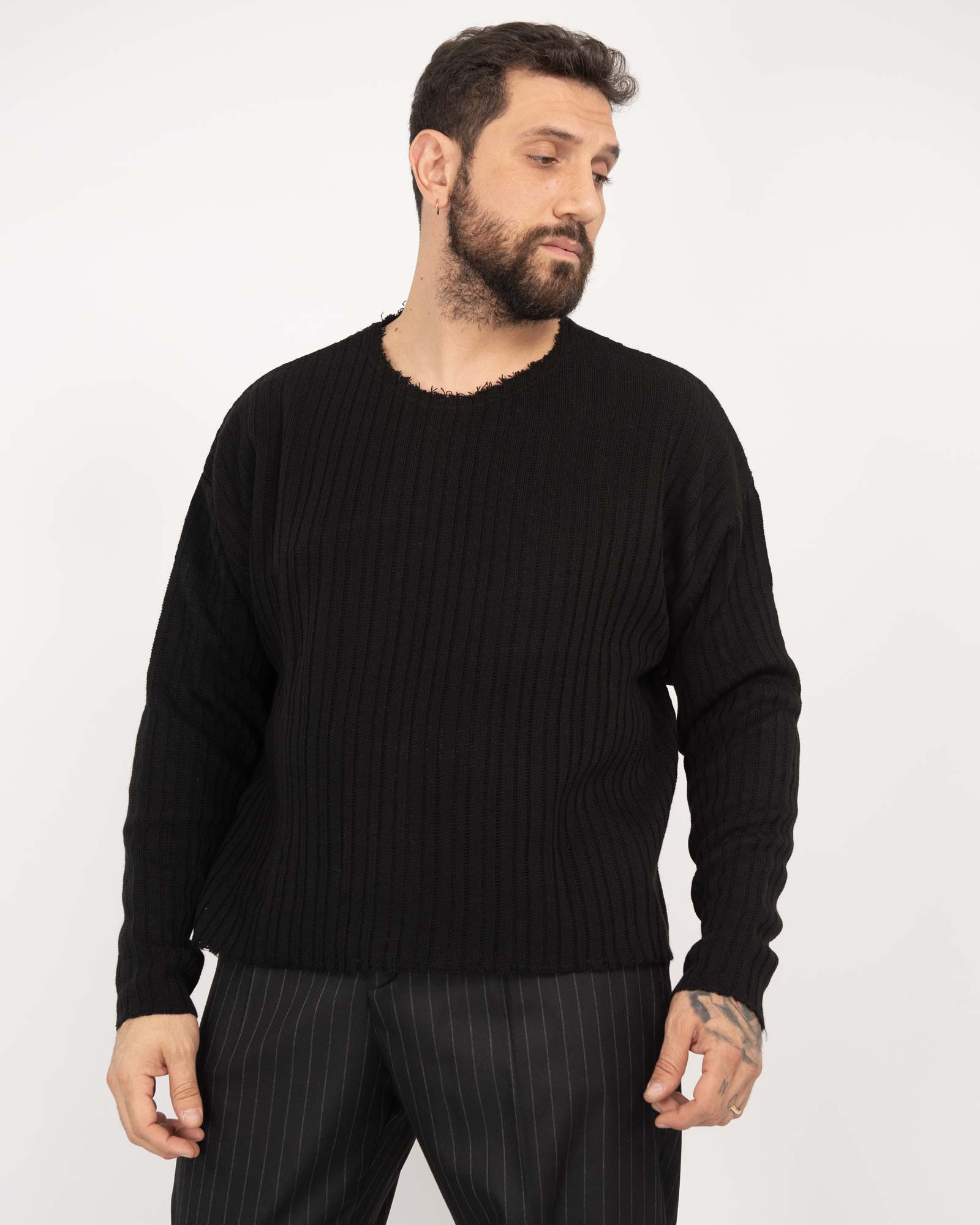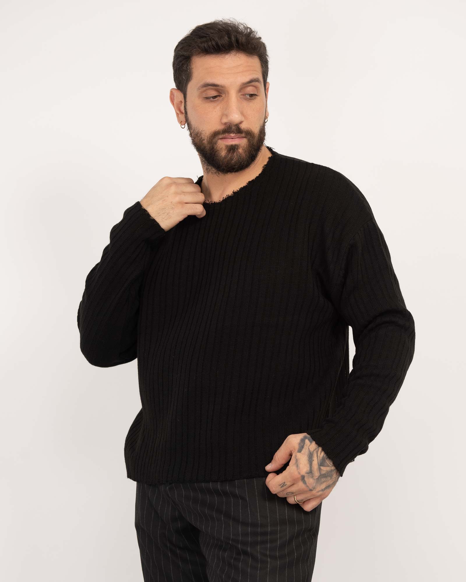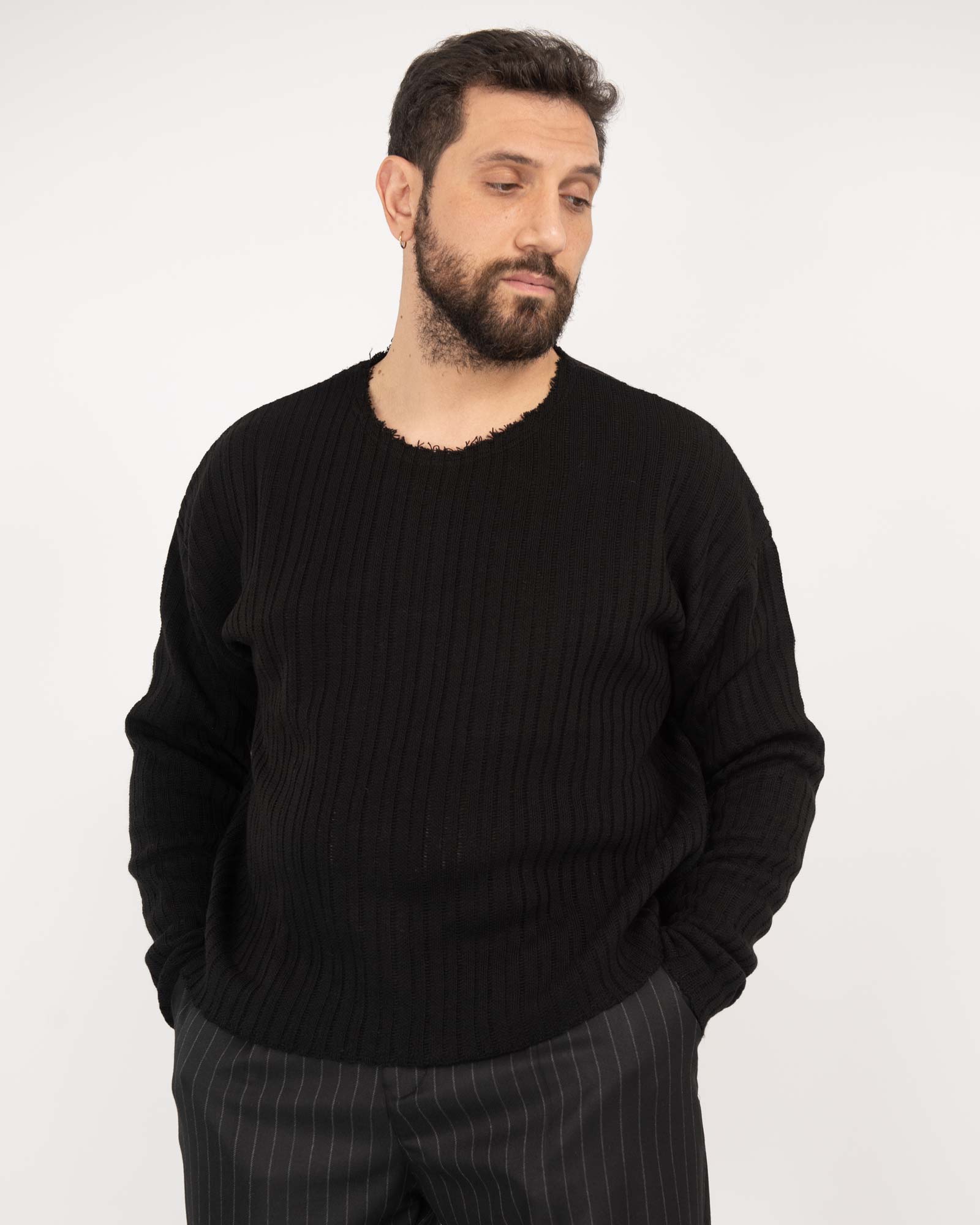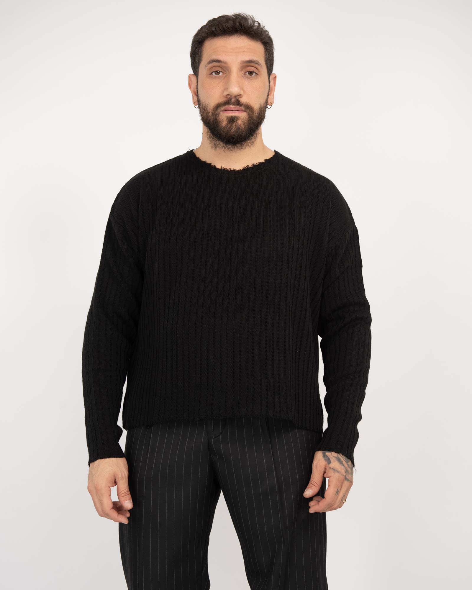 Maglia cropped fit in filato traforato a costine con collo taglio vivo e maniche lunghe. Produzione made in Italy. In foto è indossata taglia XL per altezza 1,85cm e peso 97kg.