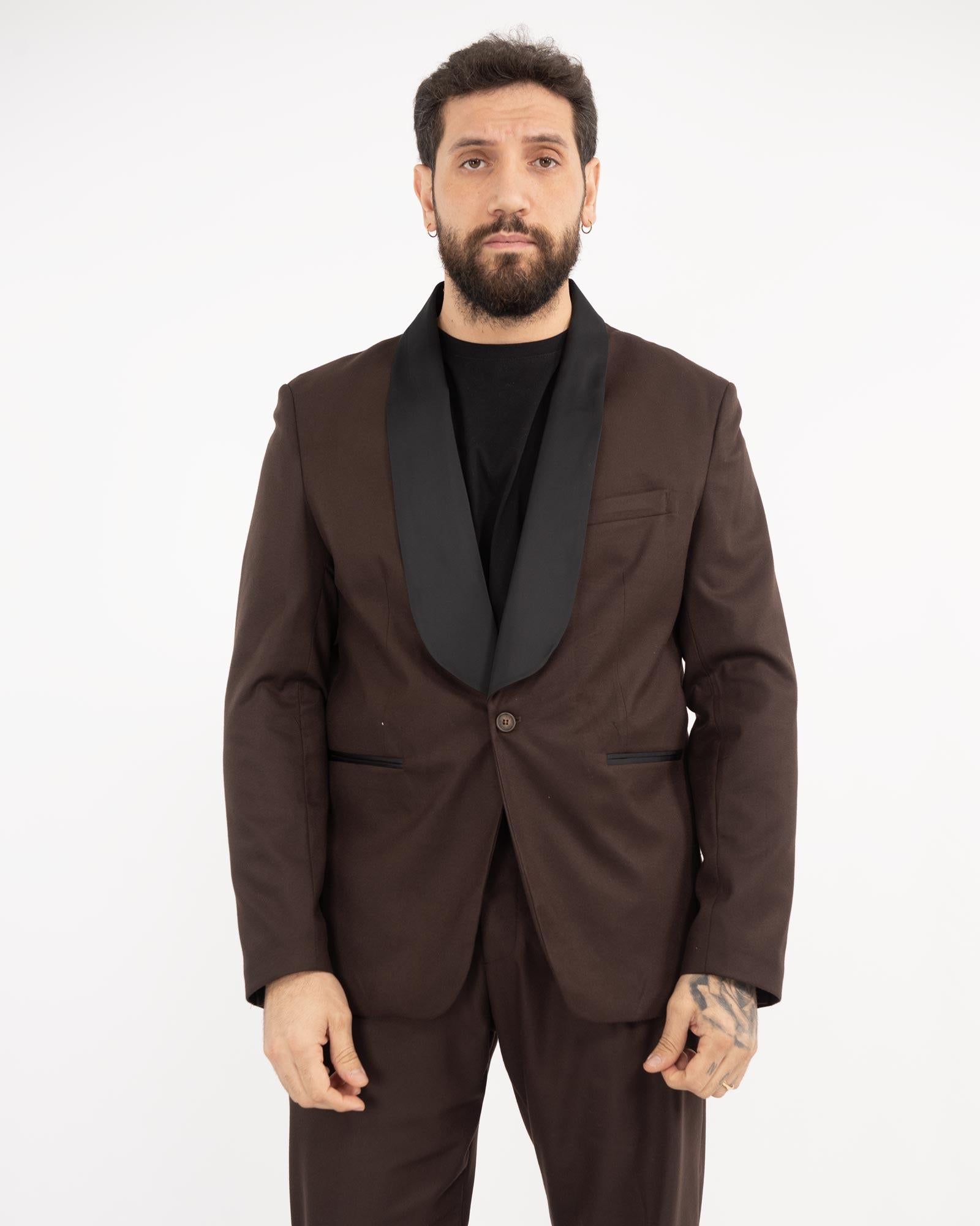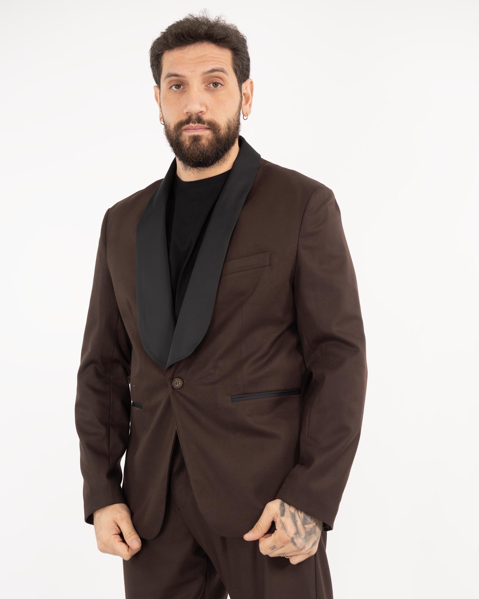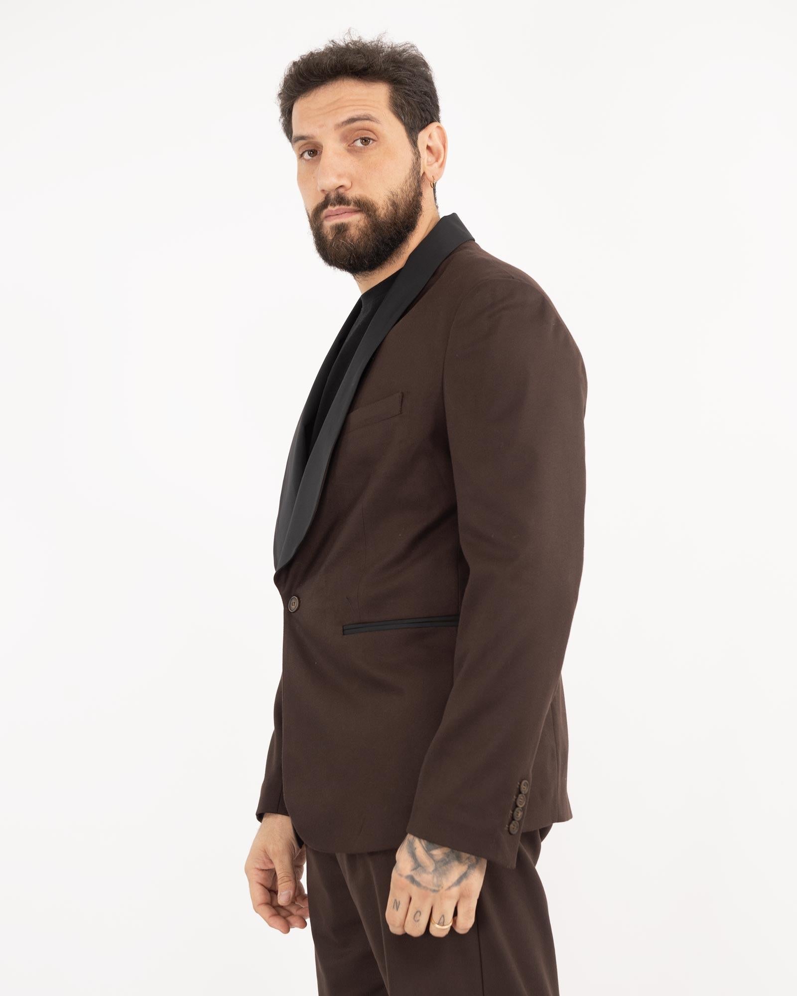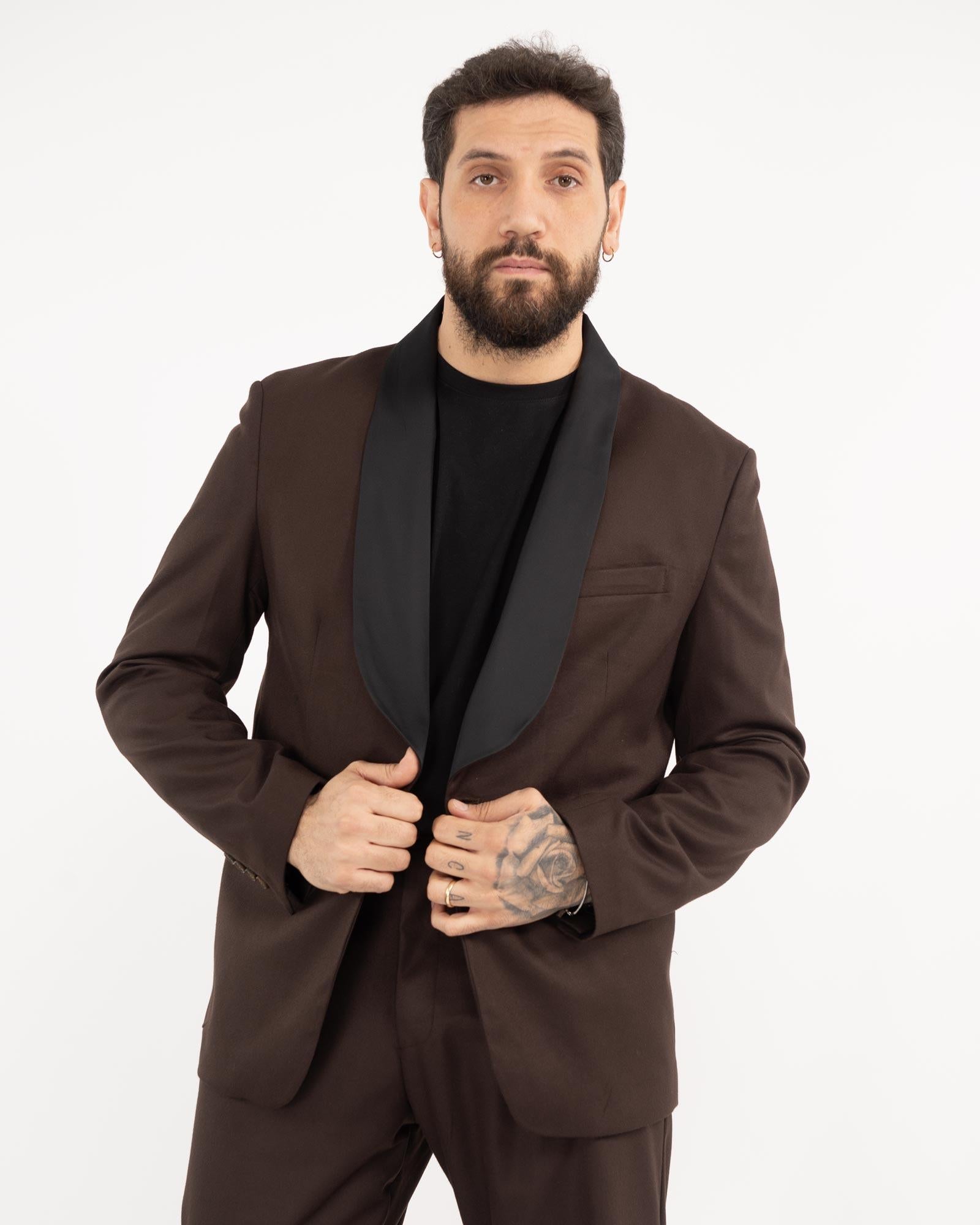 Blazer regular fit realizzato in tessuto misto flanella. Collo con revers a scialle in raso e maniche lunghe con polsini con bottoni. Presenta tasche a filetto combinate a contrasto sul davanti. Dettaglio di taschino interno e fondo con spacco centrale sul retro. In foto è indossata la taglia 56 per altezza 1,85cm e peso 97kg.