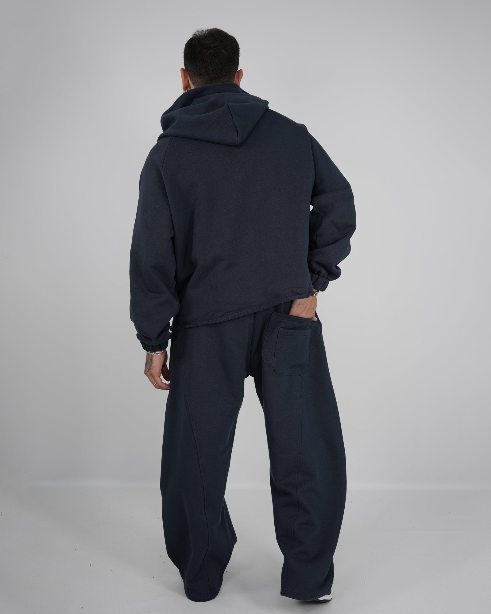 Coordinato tuta composto da felpa cropped taglio vivo con cappuccio e scollo profondo abbinata al pantatuta balloon fit con vita regolabile con coulisse. In foto è indossata la taglia XL per altezza 1.85cm e peso 97kg.