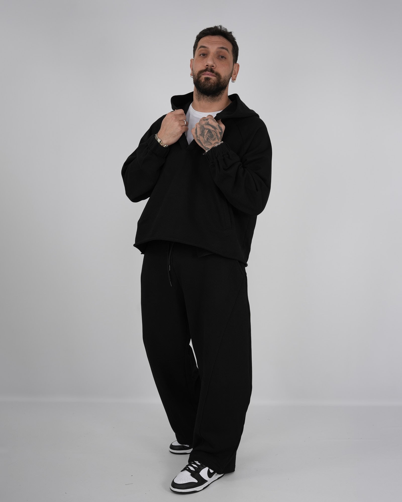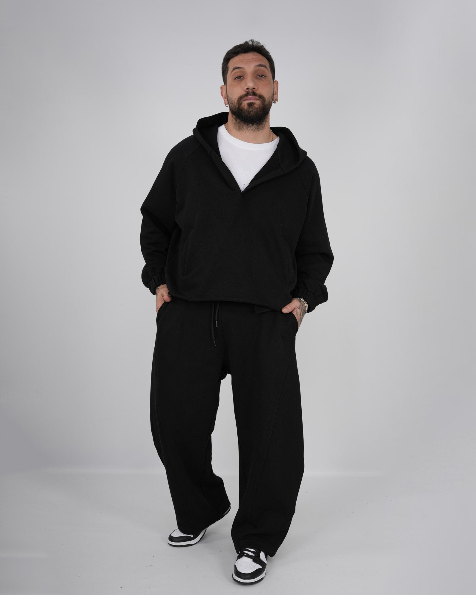 Coordinato tuta composto da felpa cropped taglio vivo con cappuccio e scollo profondo abbinata al pantatuta balloon fit con vita regolabile con coulisse. In foto è indossata la taglia XL per altezza 1.85cm e peso 97kg.