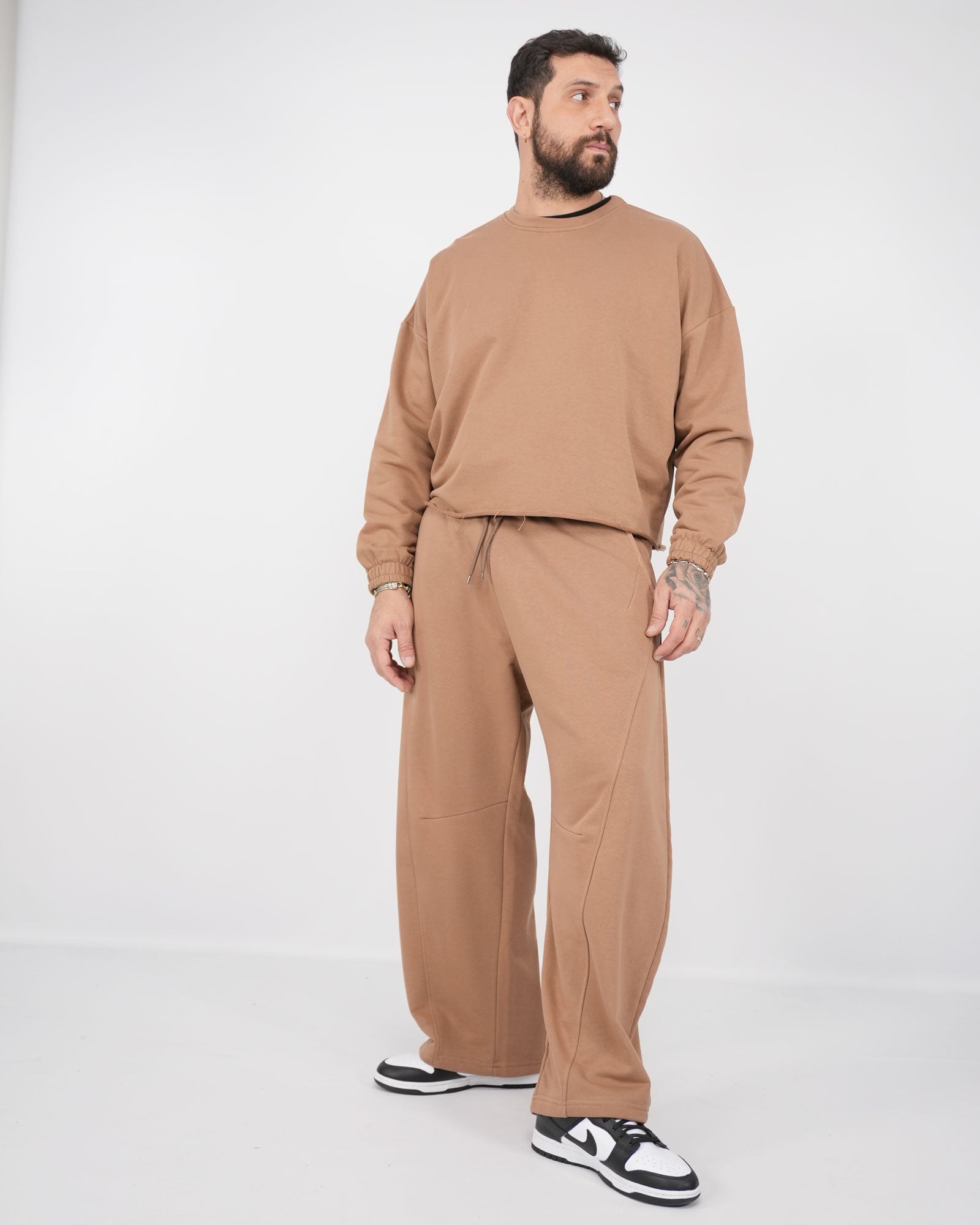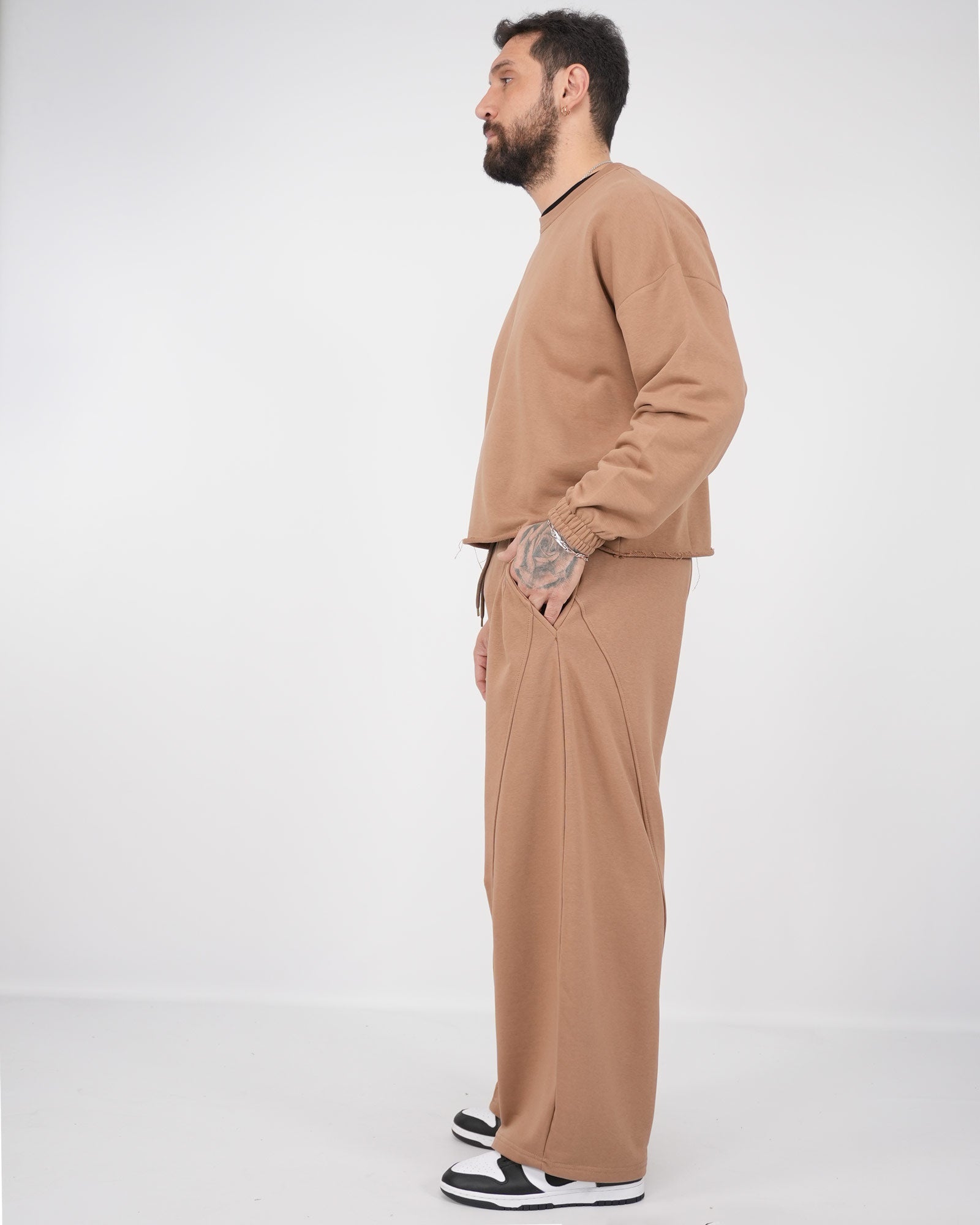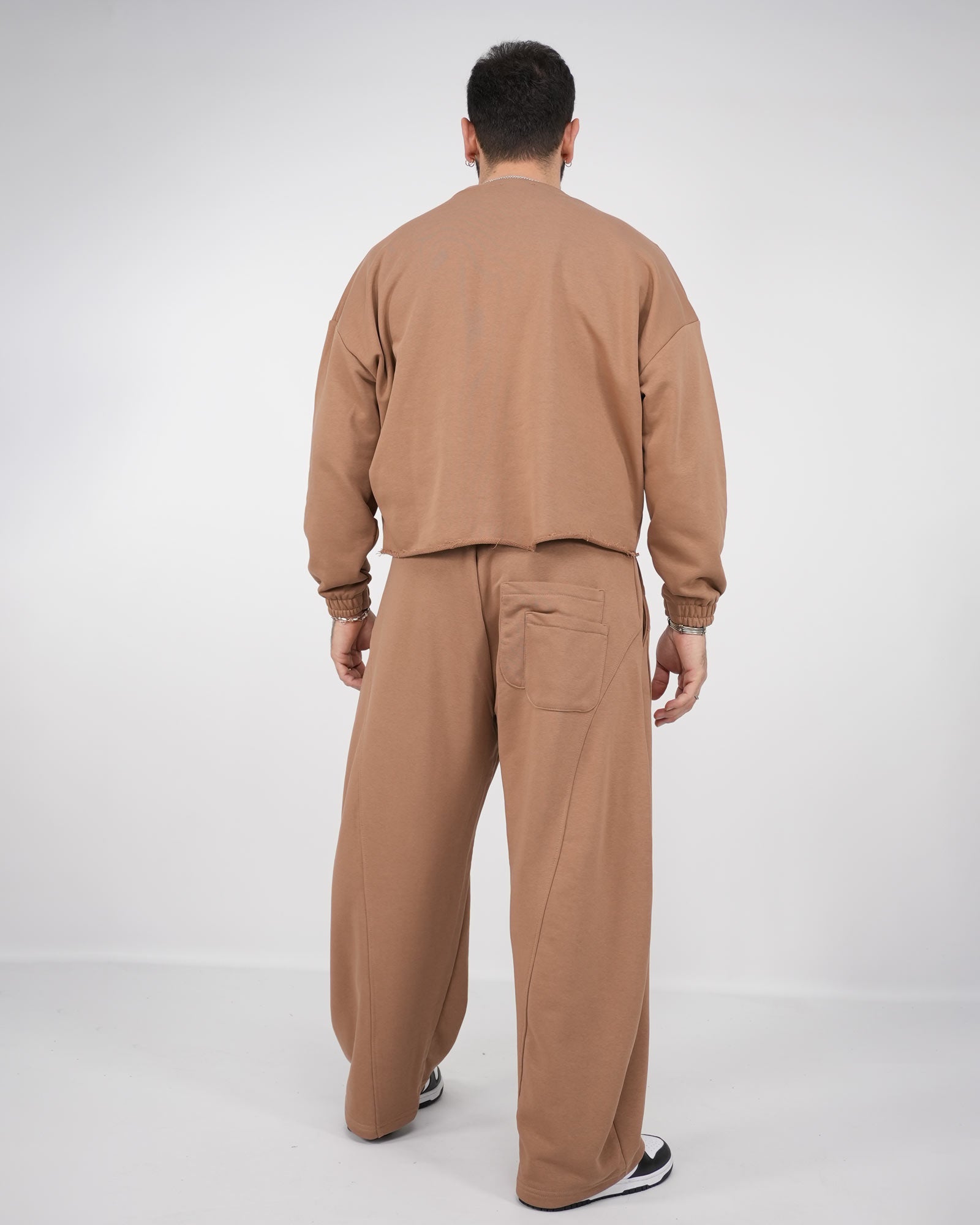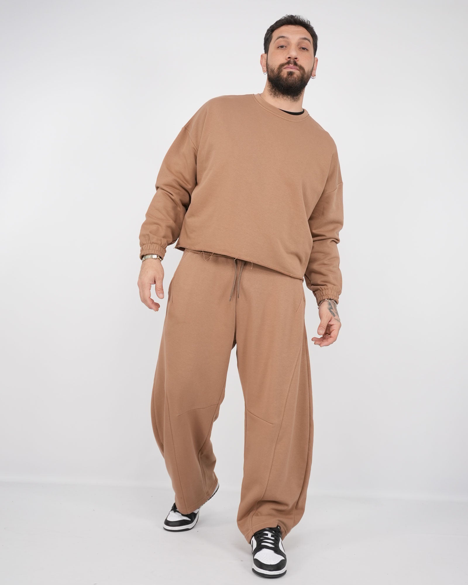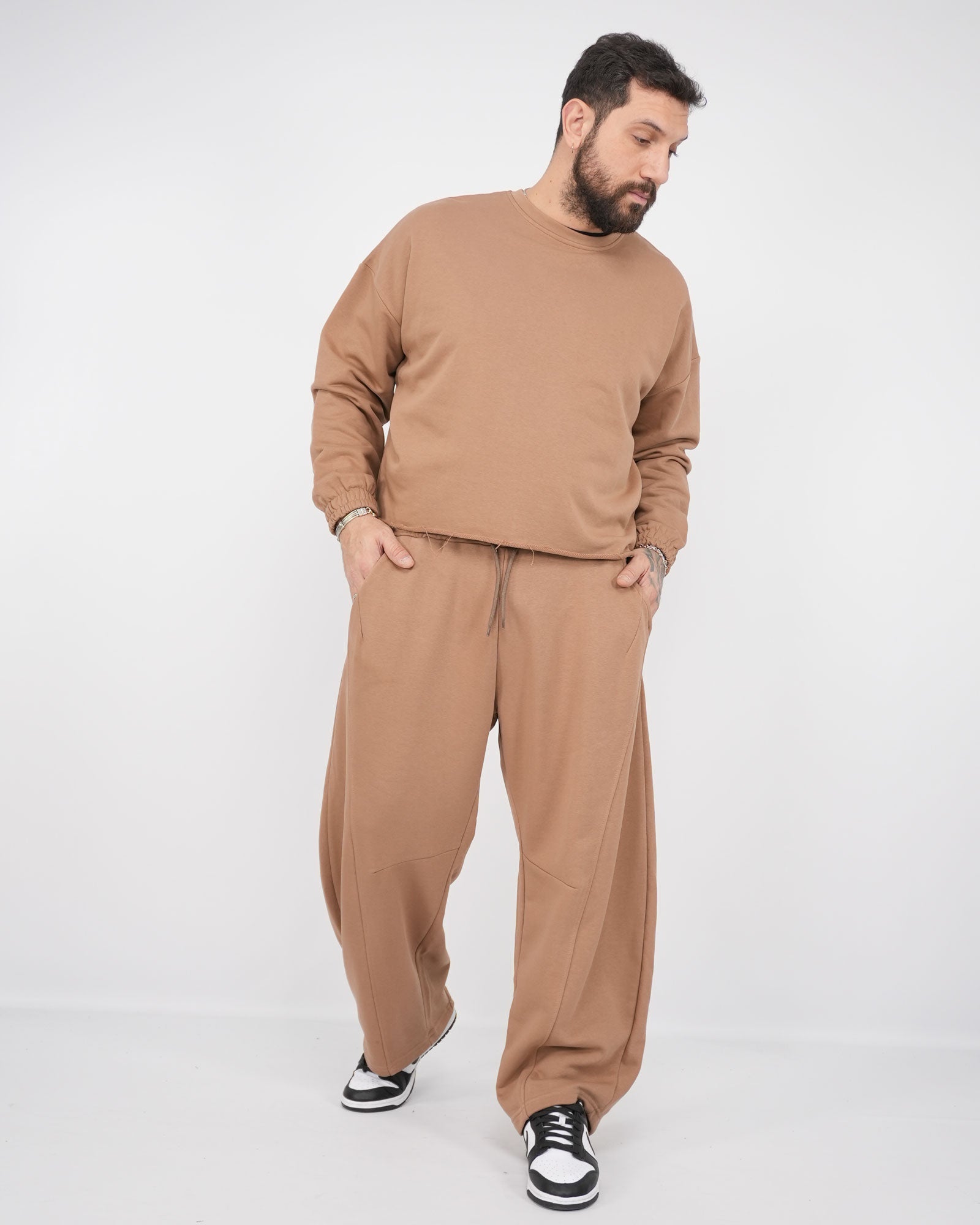 Coordinato tuta composto da felpa con girocollo cropped in cotone con taglio vivo e maniche lunghe abbinata al pantatuta balloon fit e vita regolabile con coulisse. In foto è indossata la taglia XL per altezza 1.85cm e peso 97kg.