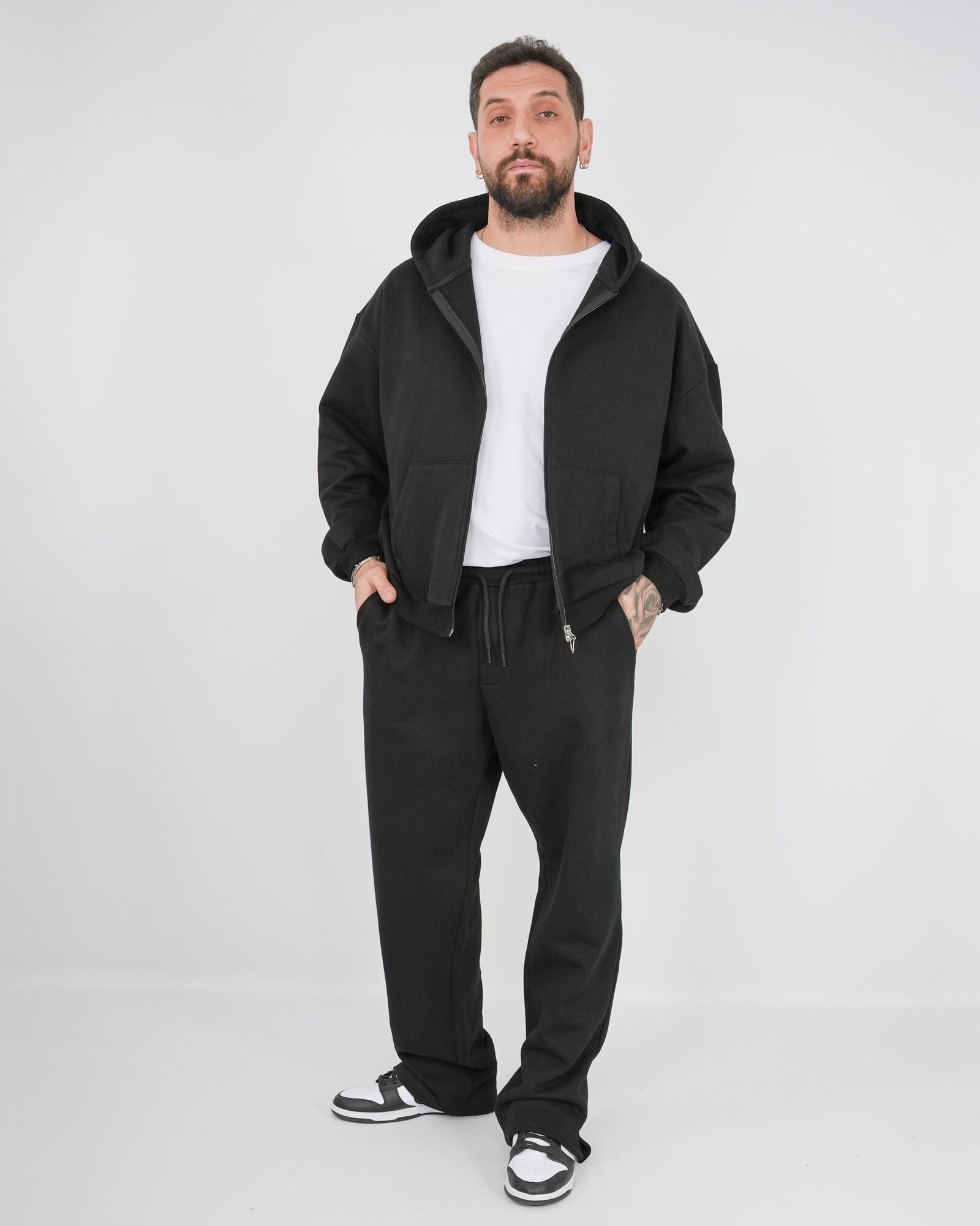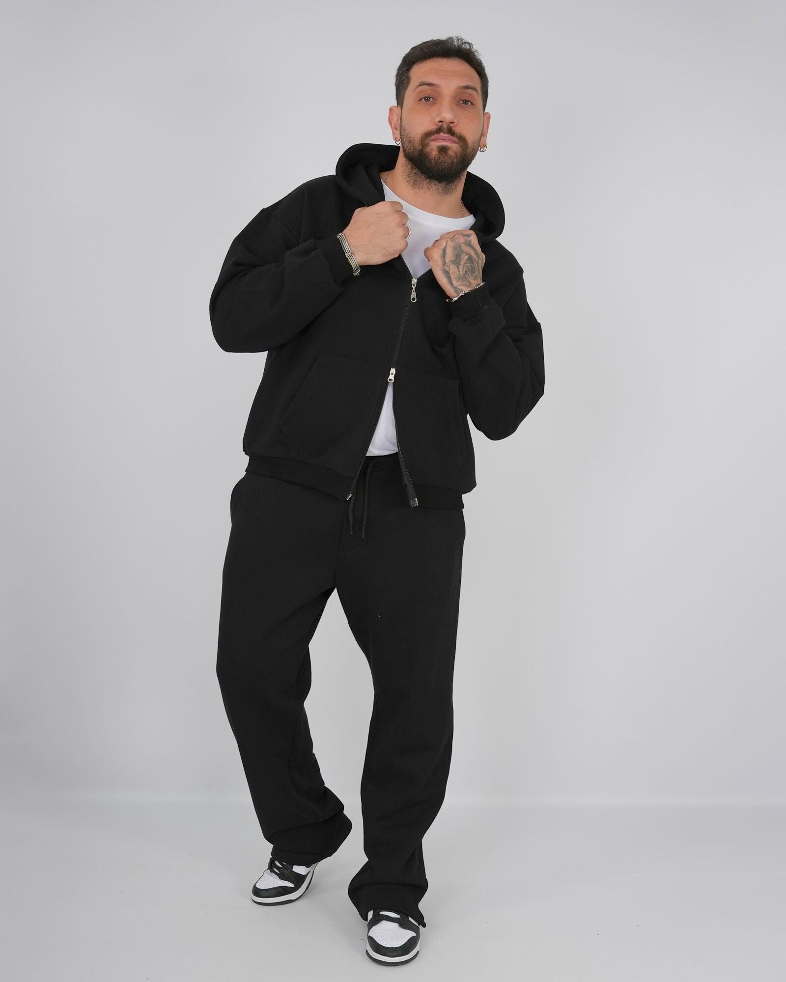 Coordinato tuta composto da felpa con cappuccio cropped in cotone con zip doppio cursore e maniche lunghe abbinata al pantatuta fondo largo con spacchetto sul fondo e vita regolabile con coulisse. In foto è indossata la taglia XL per altezza 1.85cm e peso 97kg.