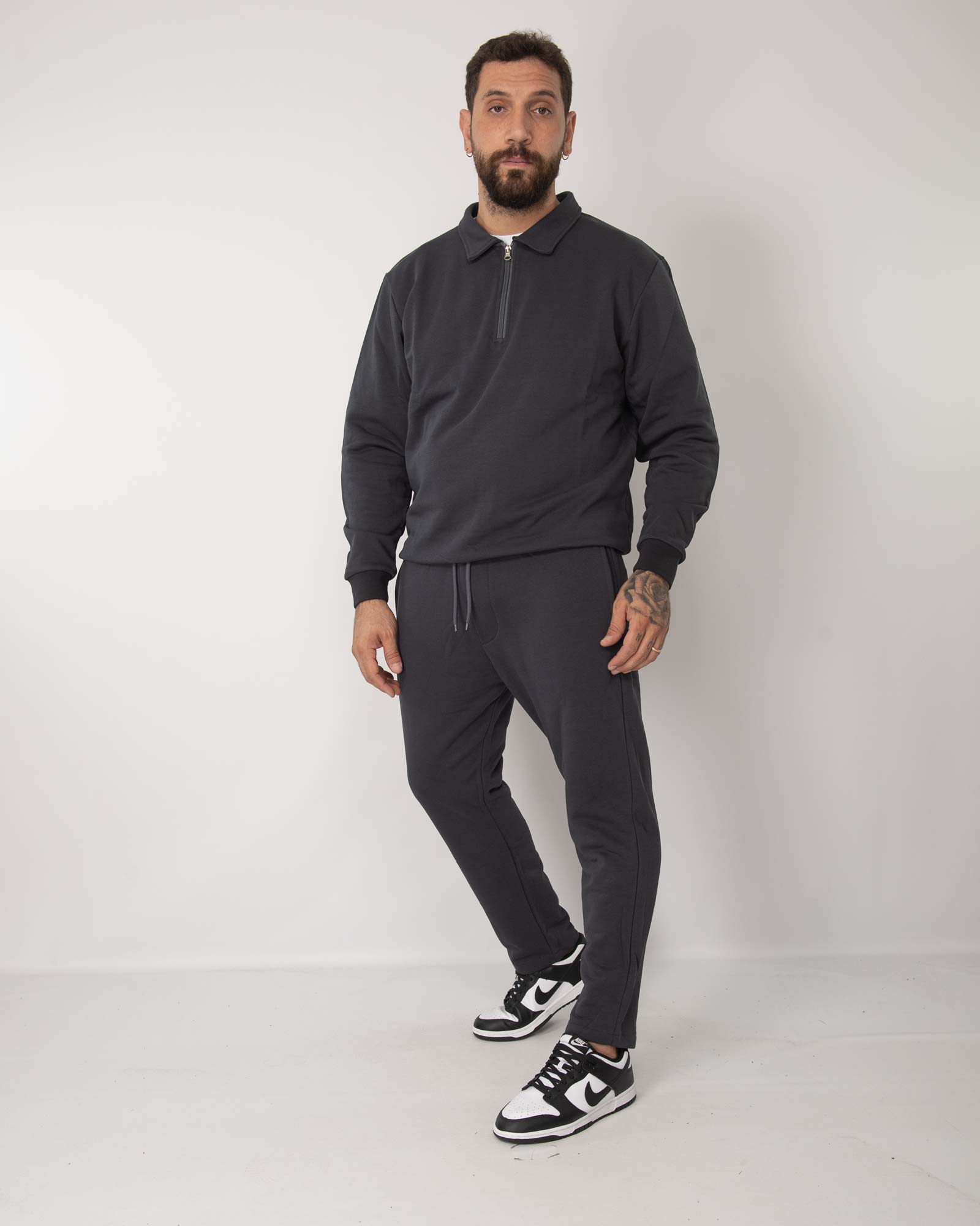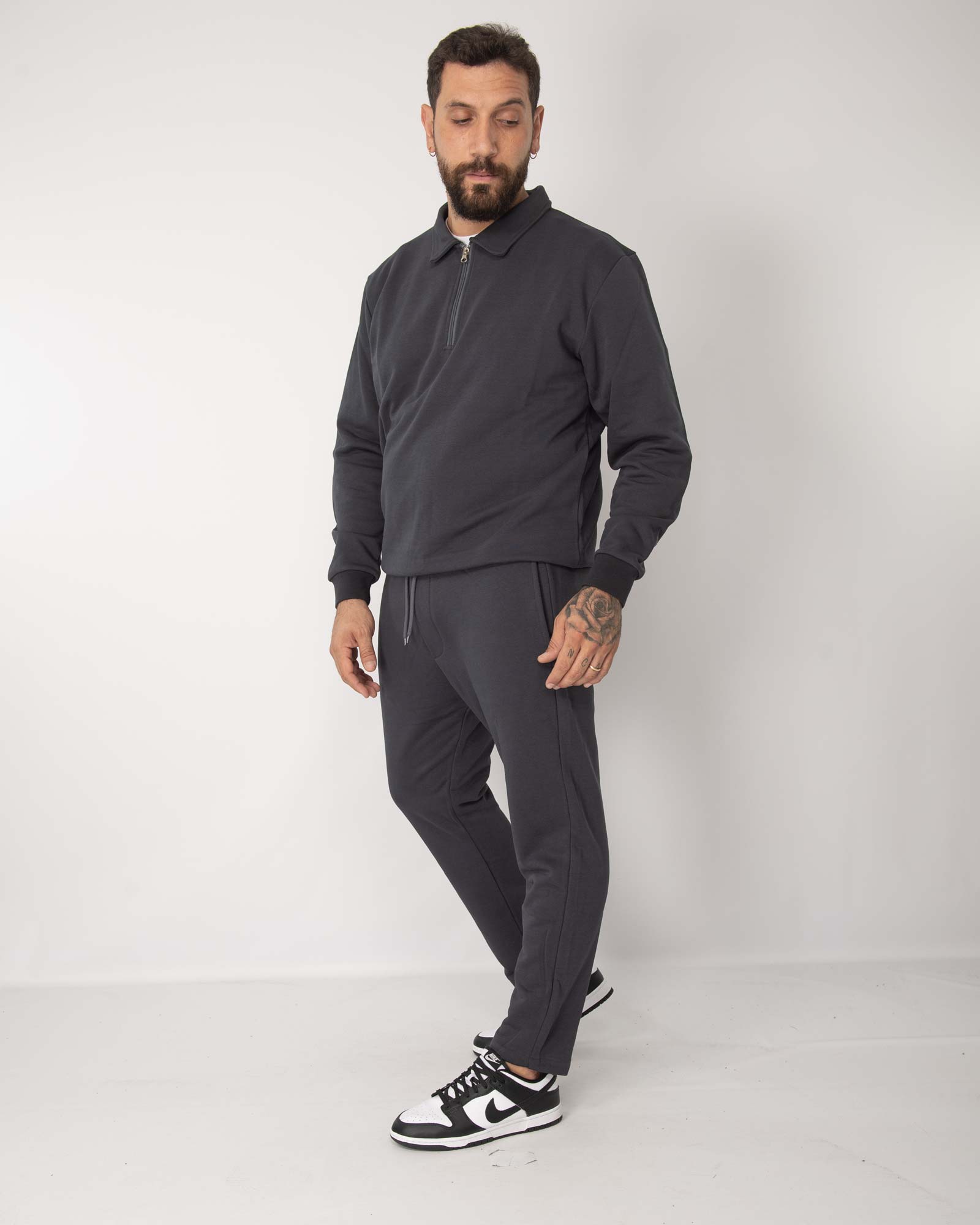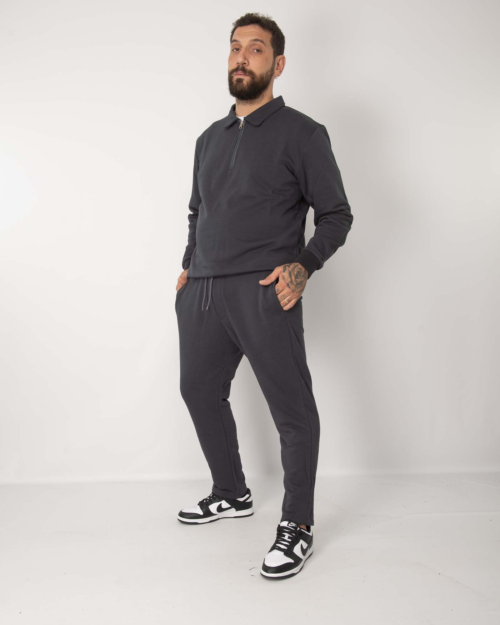 Coordinato tuta composto da felpa modello polo regular fit con maniche lunghe abbinata al pantatuta fondo stretto con vita regolabile con coulisse. In foto è indossata la taglia XL per altezza 1.85cm e peso 97kg.