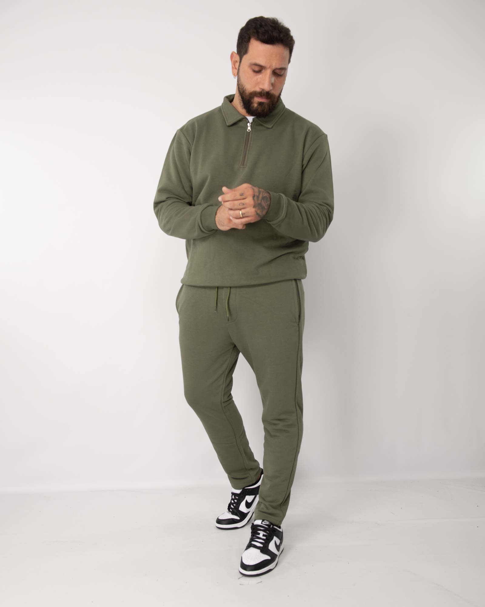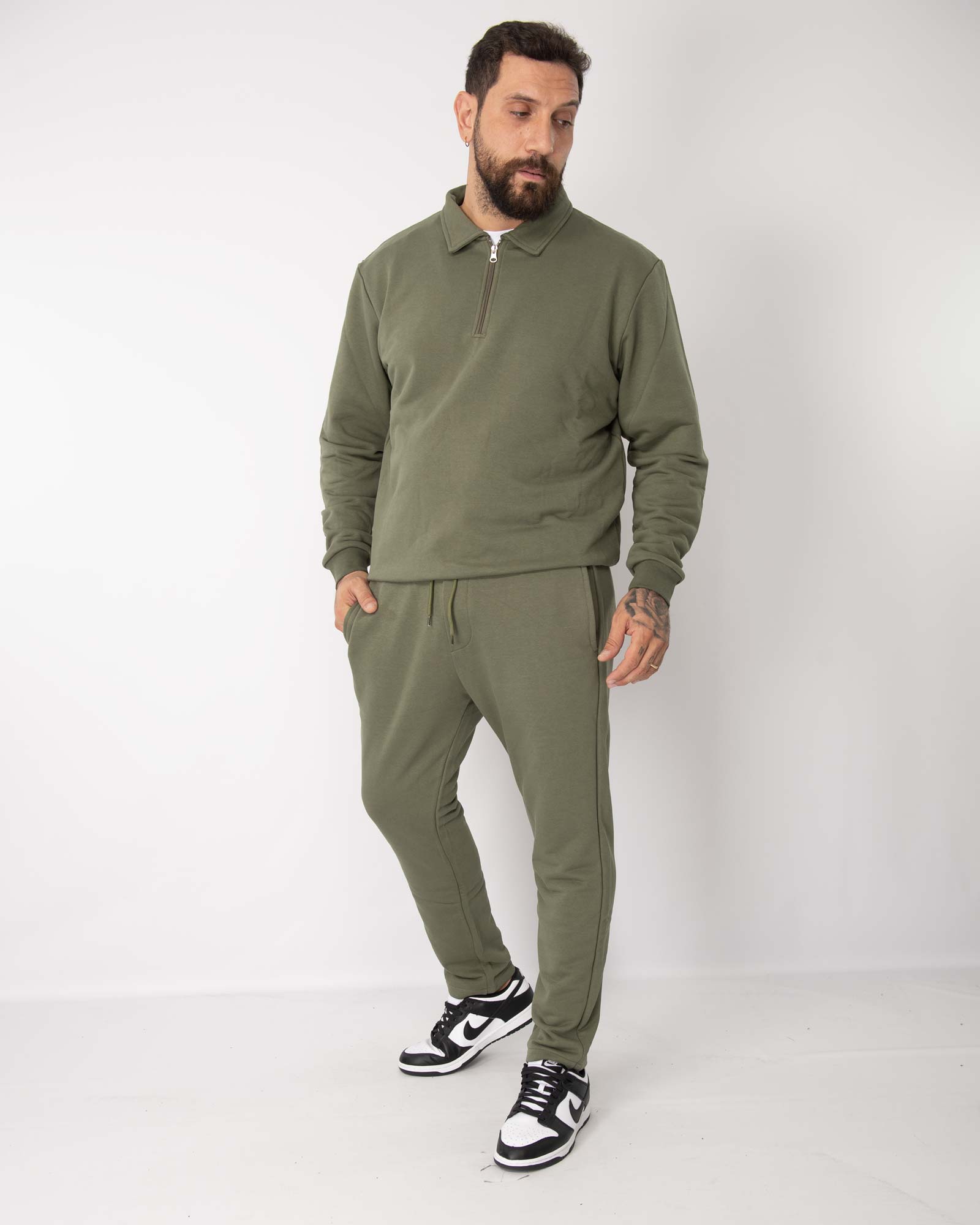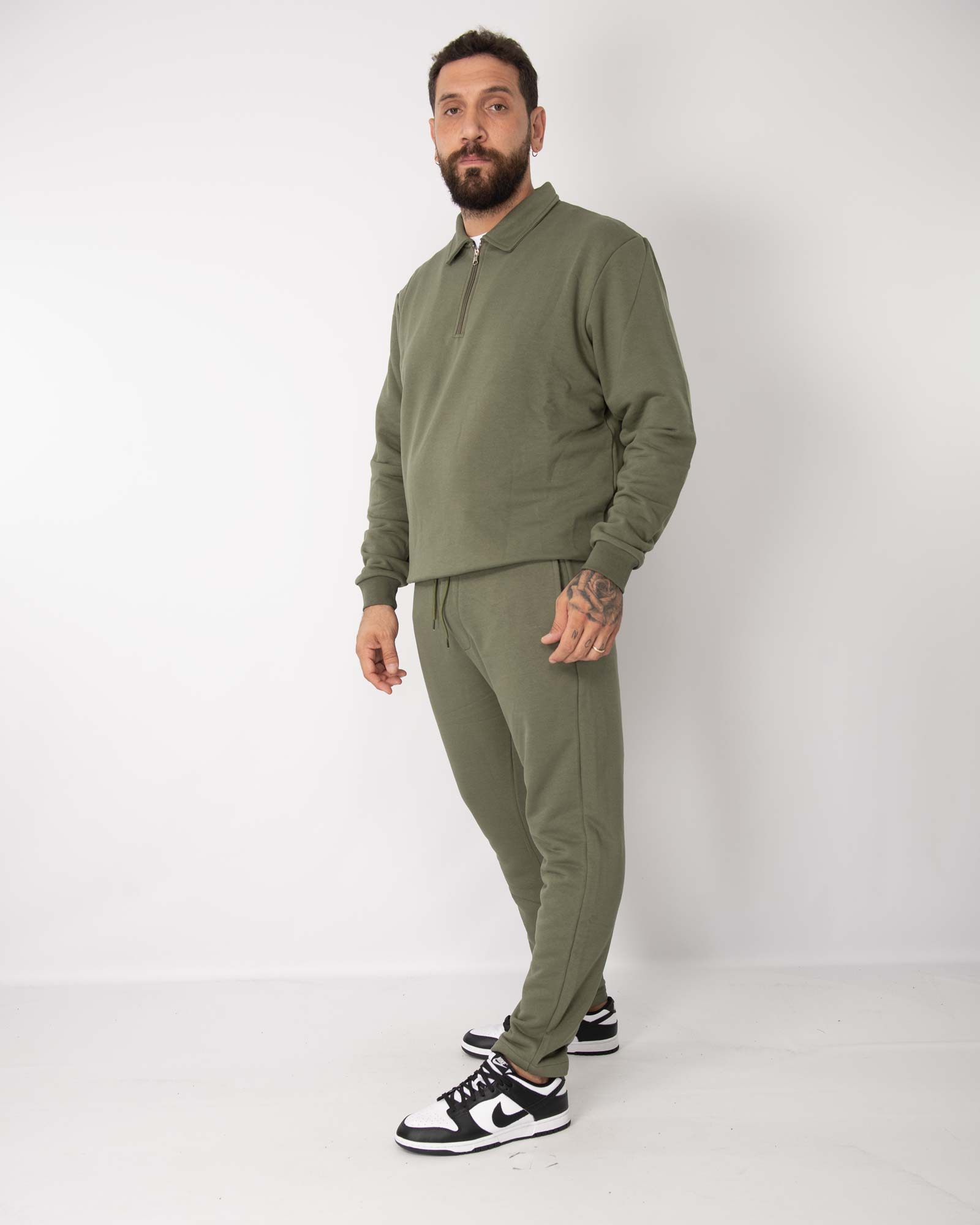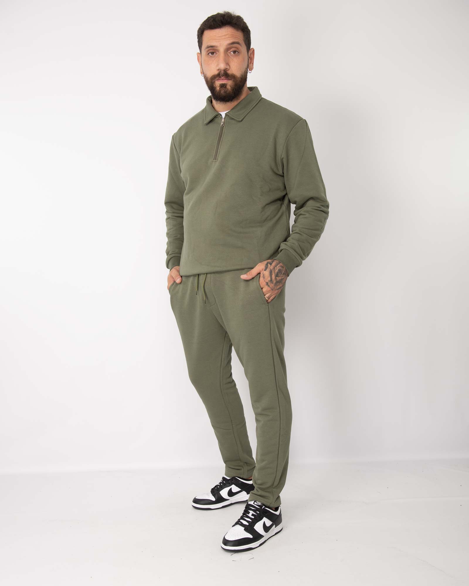 Coordinato tuta composto da felpa modello polo regular fit con maniche lunghe abbinata al pantatuta fondo stretto con vita regolabile con coulisse. In foto è indossata la taglia XL per altezza 1.85cm e peso 97kg