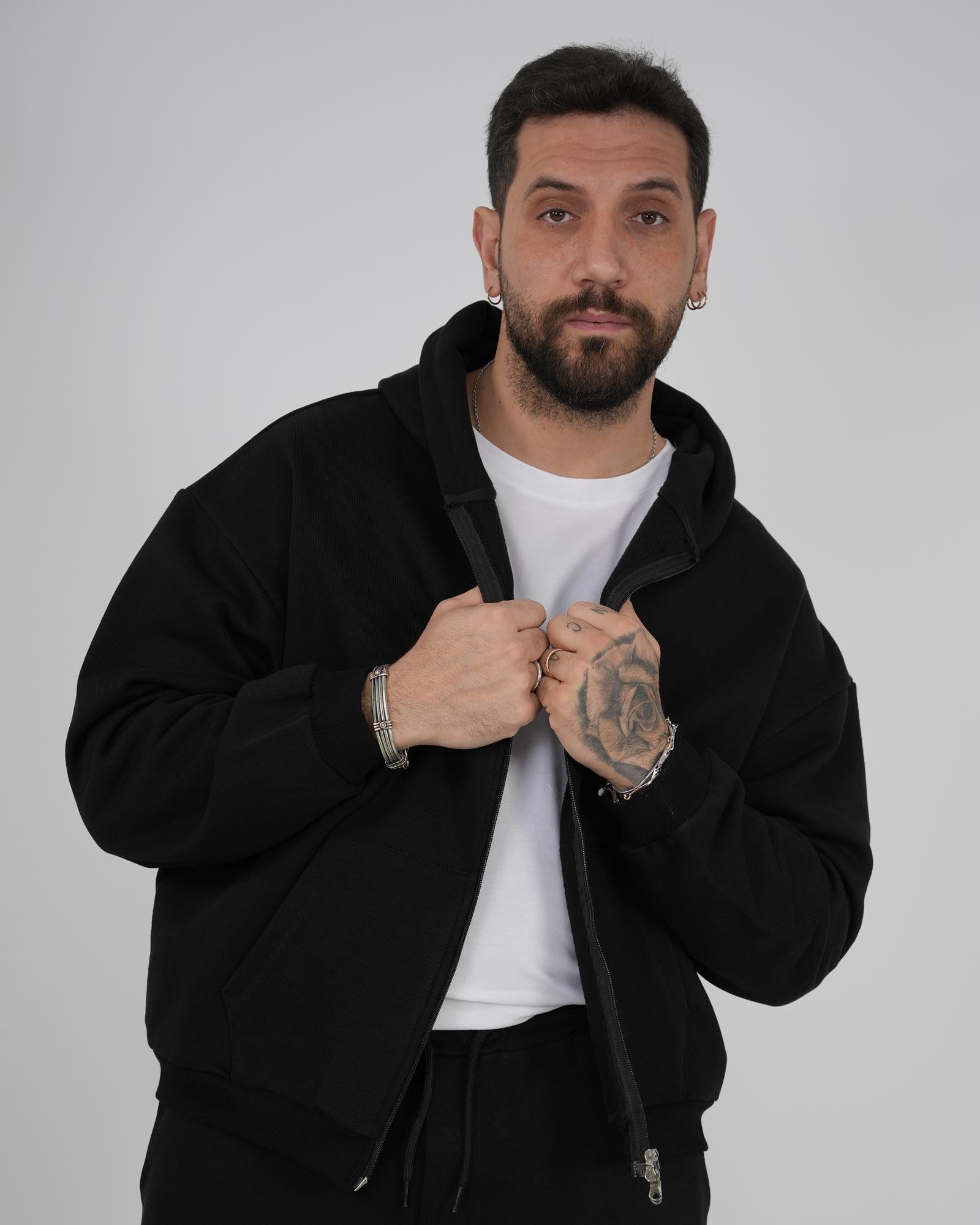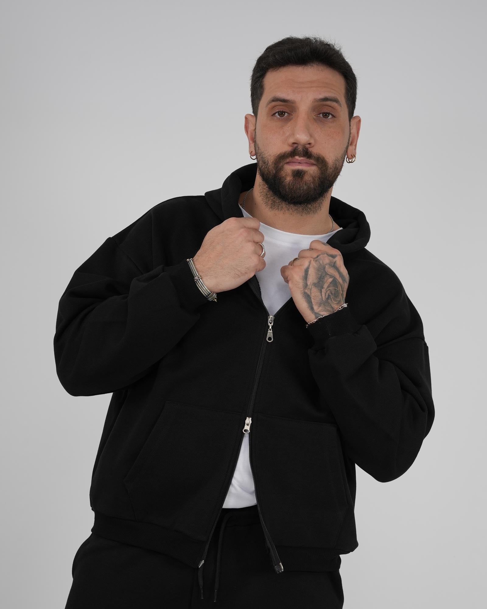 Felpa con cappuccio cropped in cotone, collo con cappuccio, zip con doppio cursore e maniche lunghe. Presenta tasche anteriori a marsupio con finitura a coste. Il modello indossa taglia XL è alto 1,85cm e pesa 97kg.