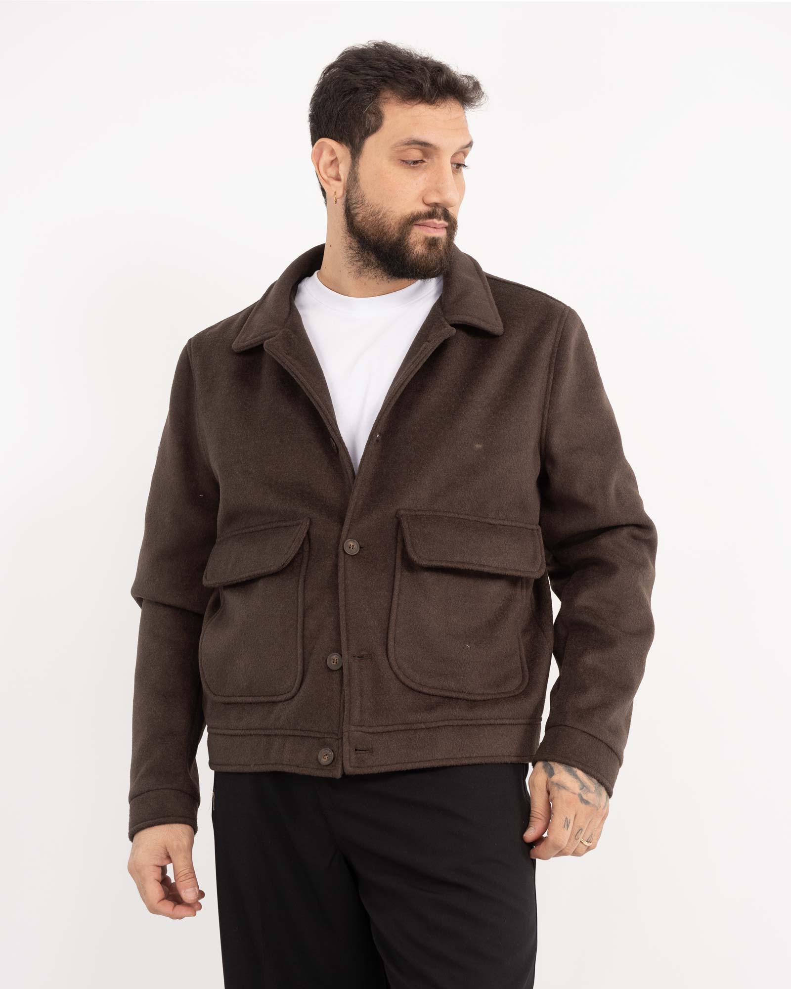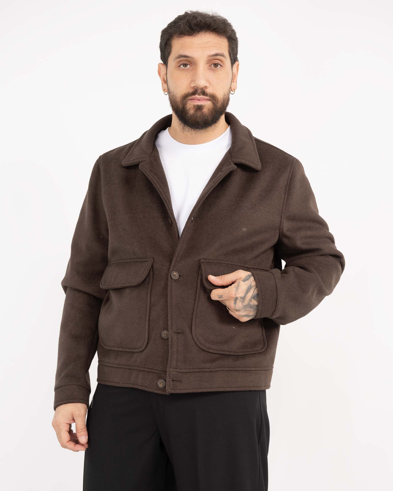 Cappotto corto in panno con abbottonatura frontale a bottoni e tasconi applicati sul davanti. La vestibilità regular fit offre una linea comoda e pulita, perfetta per completare diversi tipi di outfit. Il modello in foto è alto 1,85 m, pesa 97 kg e indossa la taglia XXL. Produzione Made in Italy.