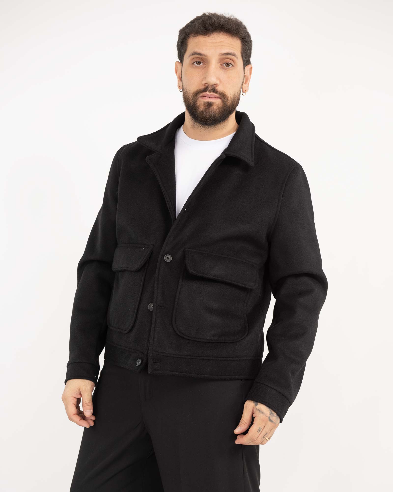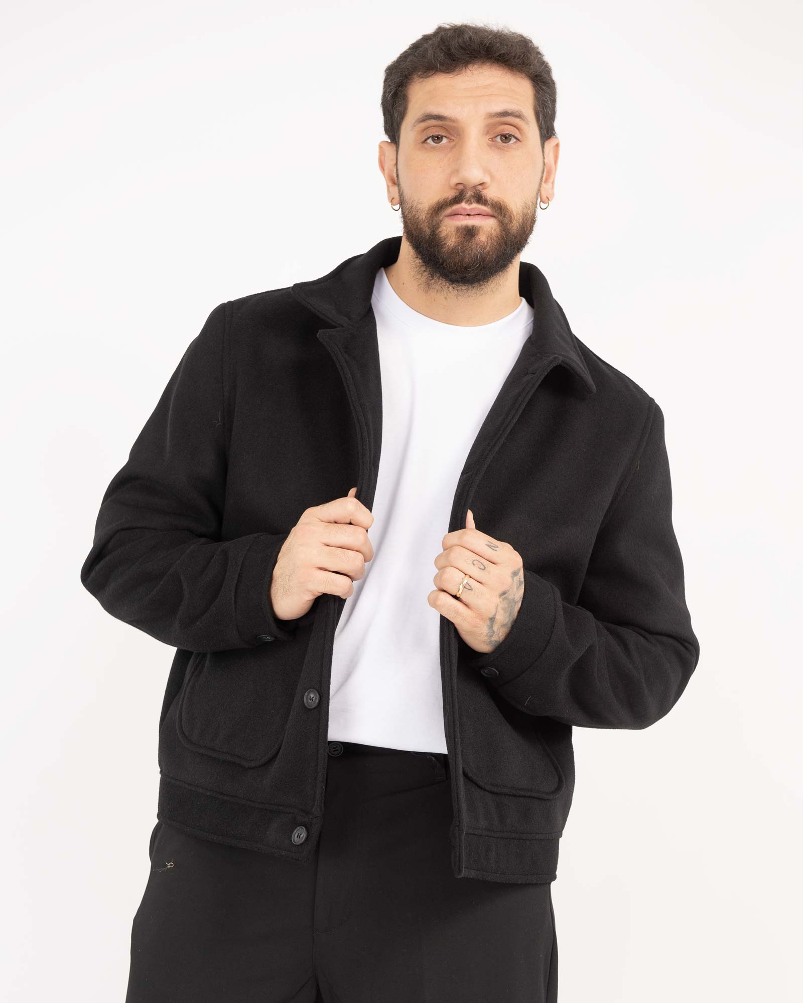 Cappotto corto in panno con abbottonatura frontale a bottoni e tasconi applicati sul davanti. La vestibilità regular fit offre una linea comoda e pulita, perfetta per completare diversi tipi di outfit. Il modello in foto è alto 1,85 m, pesa 97 kg e indossa la taglia XXL. Produzione Made in Italy.