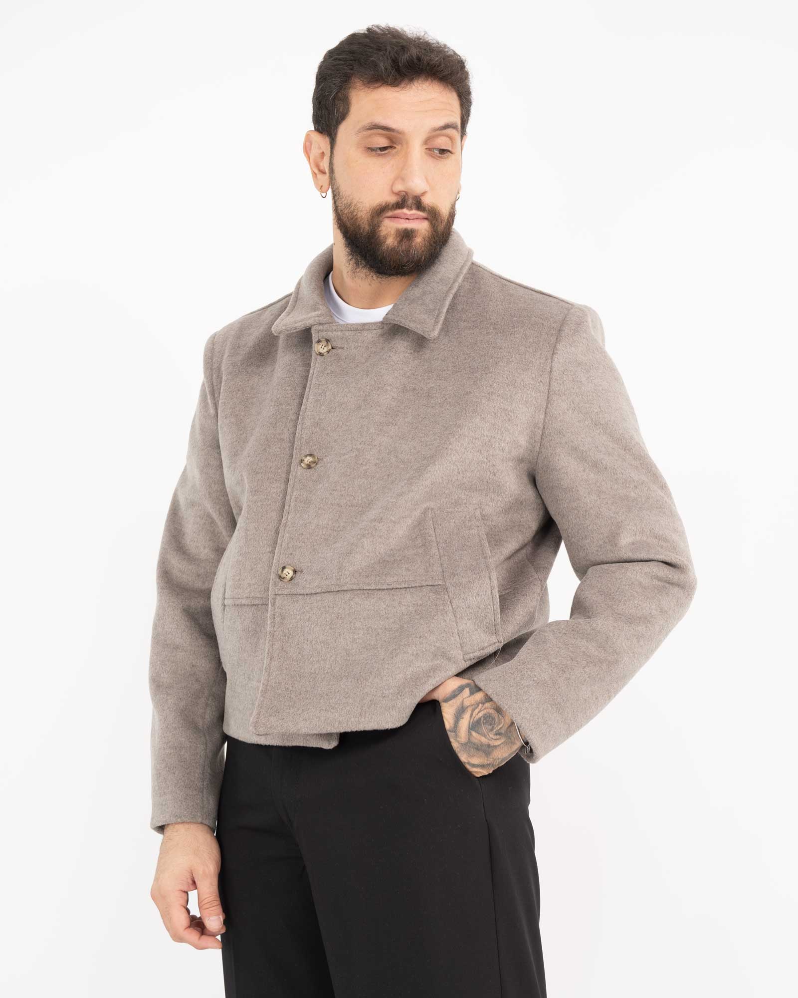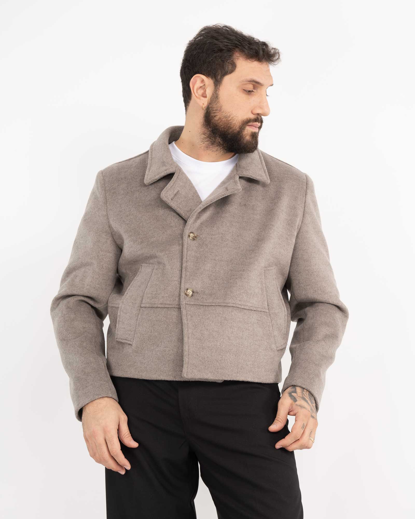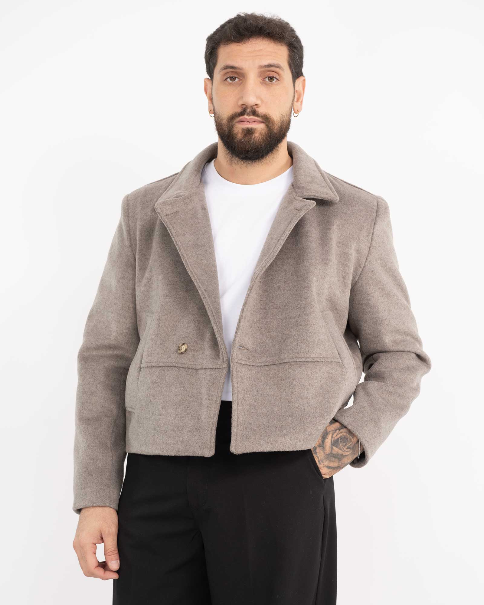 Cappotto cropped fit con abbottonatura frontale a bottoni, tasche laterali e colletto classico. La vestibilità corta dona un look moderno e deciso, mantenendo una linea pulita e versatile. Il modello in foto è alto 1,85 m, pesa 97 kg e indossa la taglia XXL. Produzione Made in Italy.
