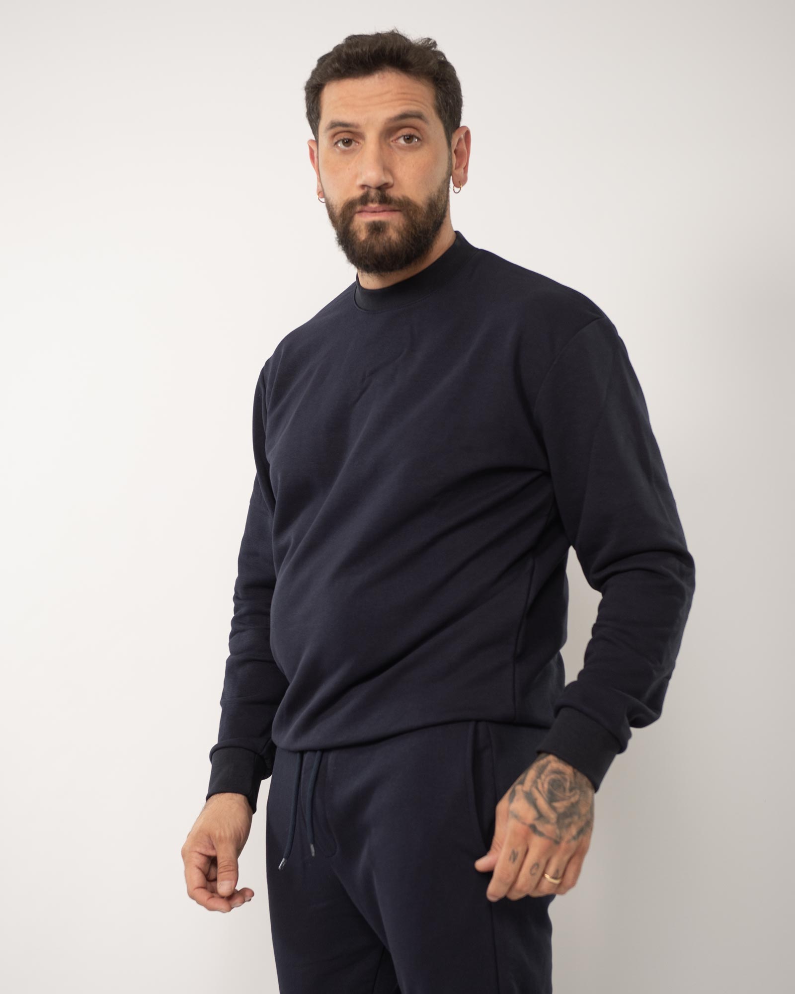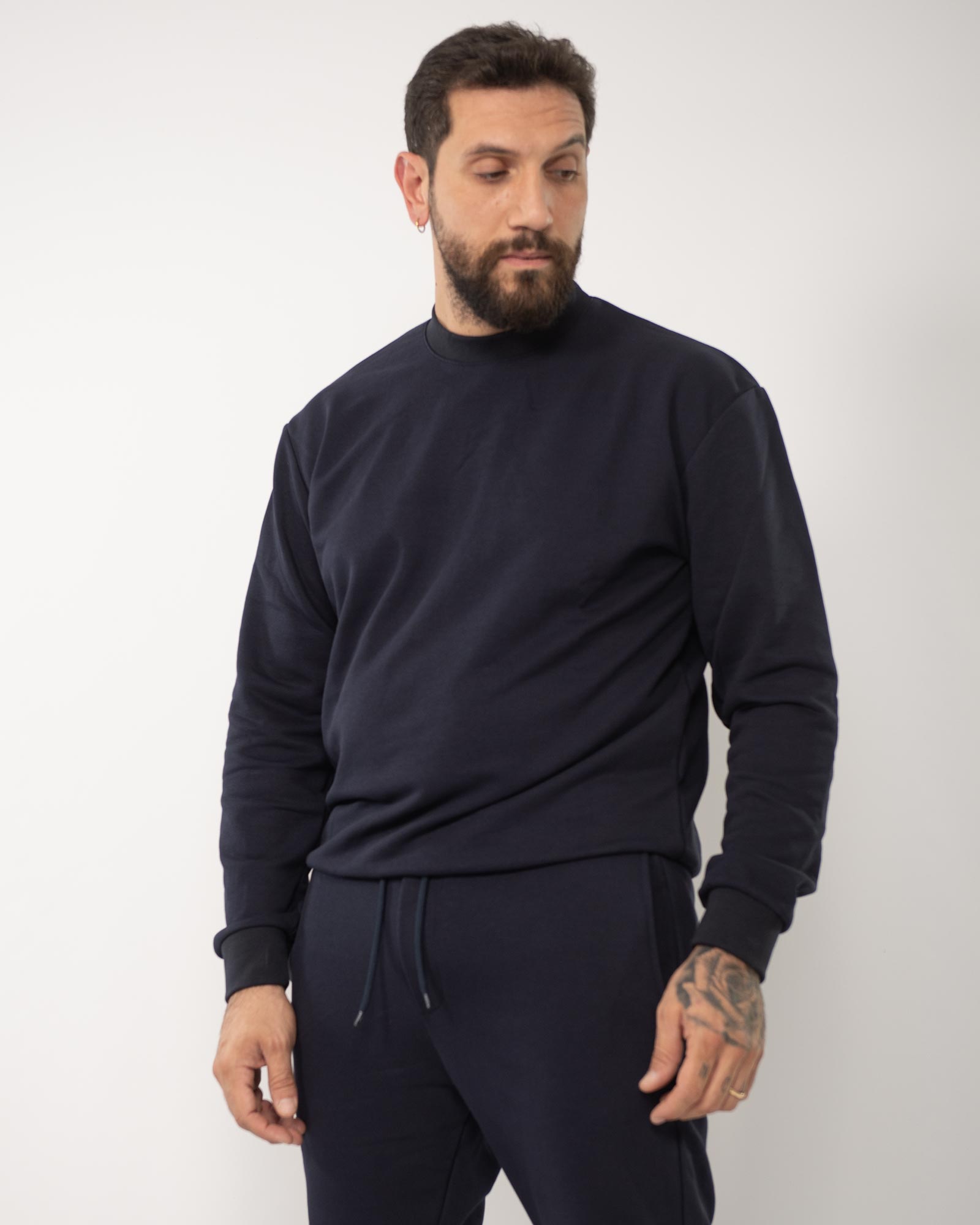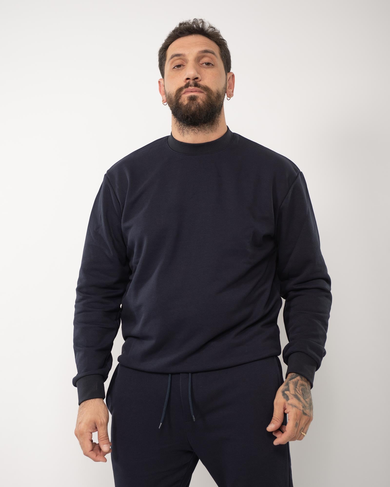 Felpa regular fit con collo rotondo e maniche lunghe, presenta finiture a coste. In foto è indossata taglia XL per altezza 1,85cm e peso 97kg.