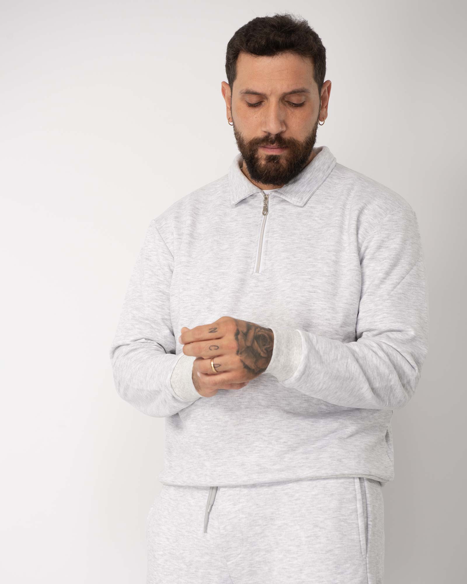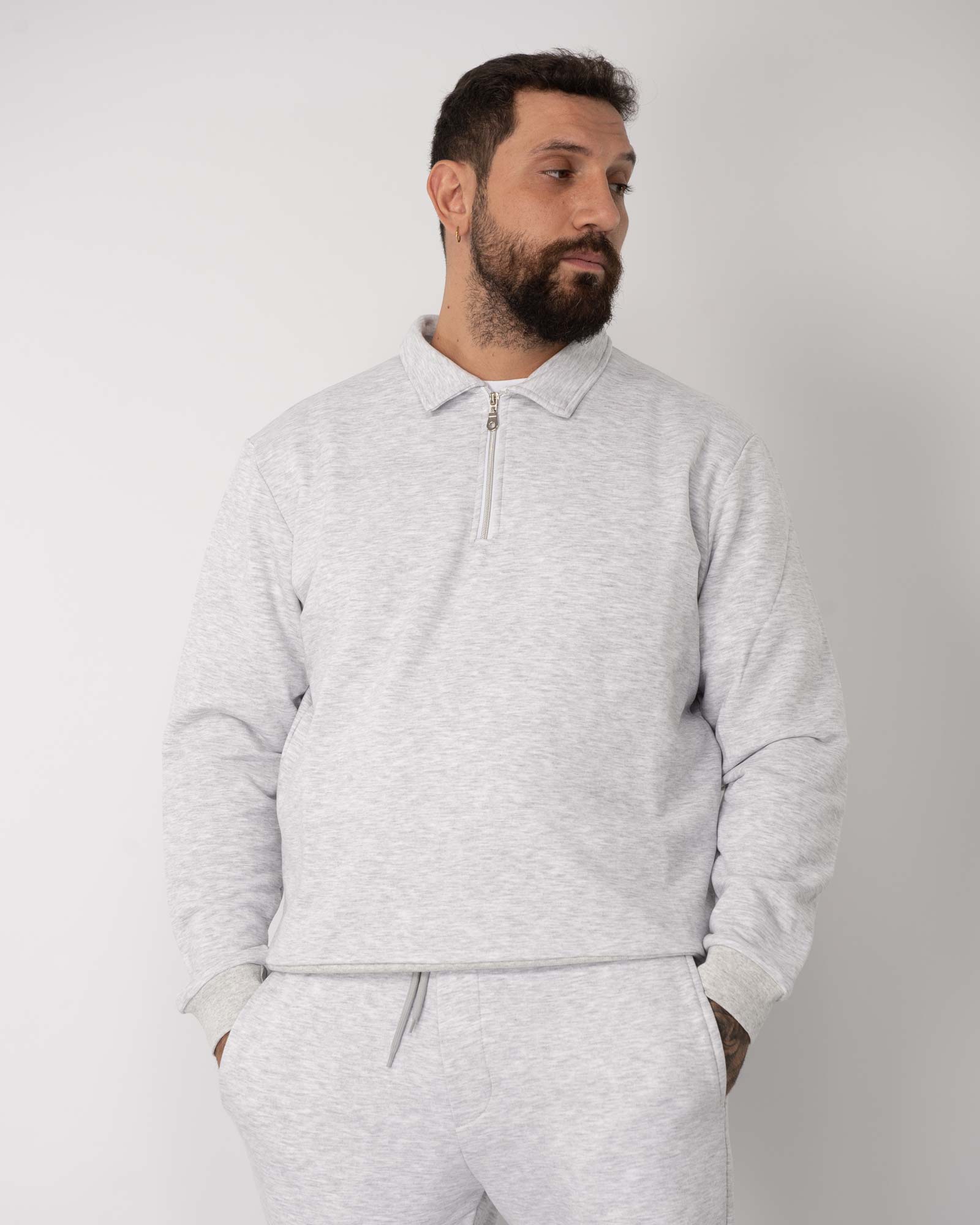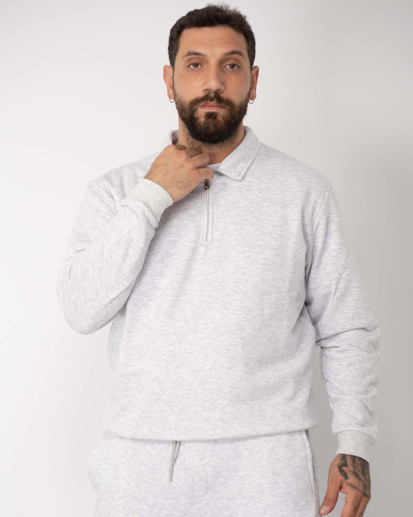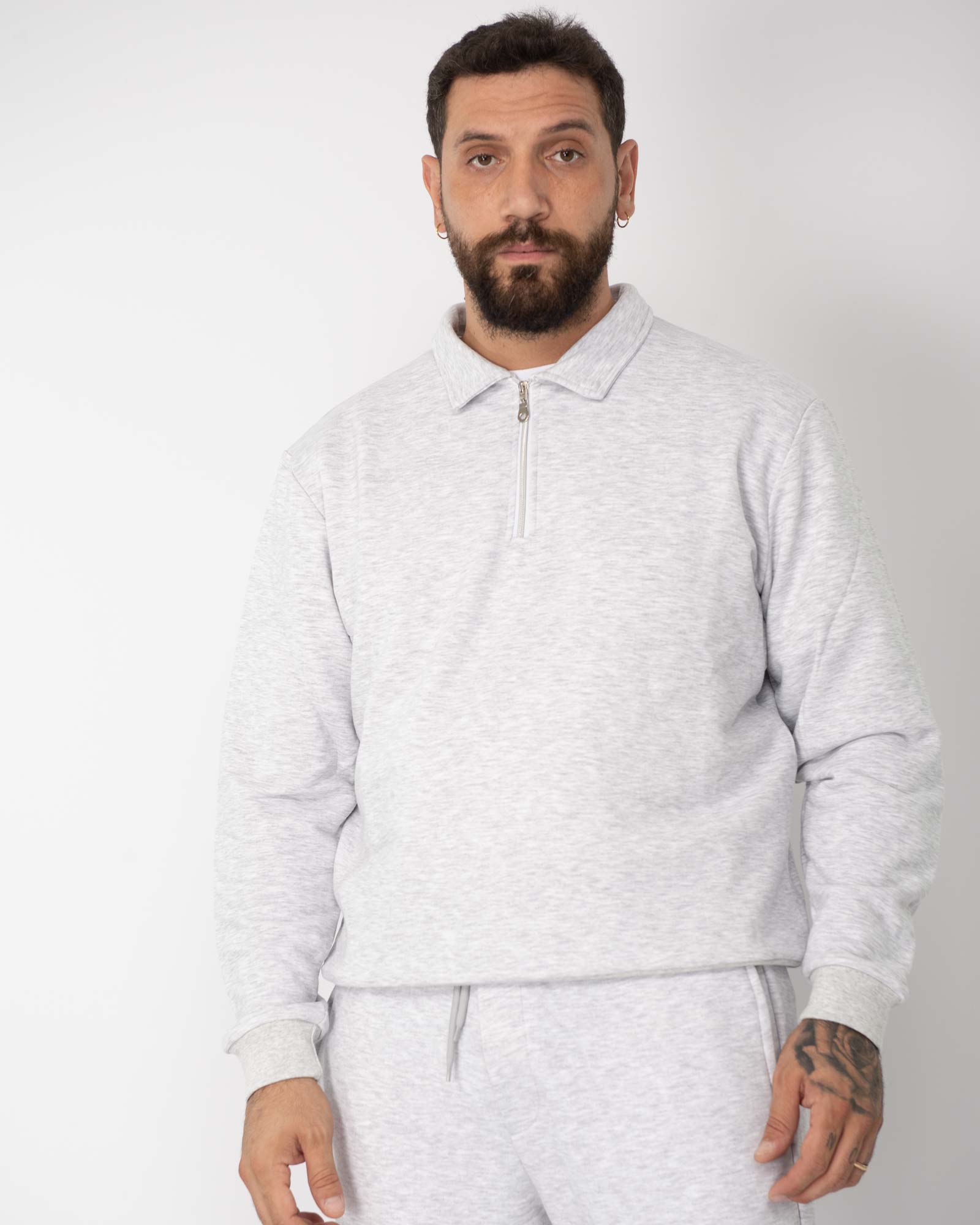 Felpa regular fit modello polo con chiusura frontale con zip, maniche lunghe e finiture a coste. In foto è indossata la taglia XL per altezza 1,85cm e peso 97kg.