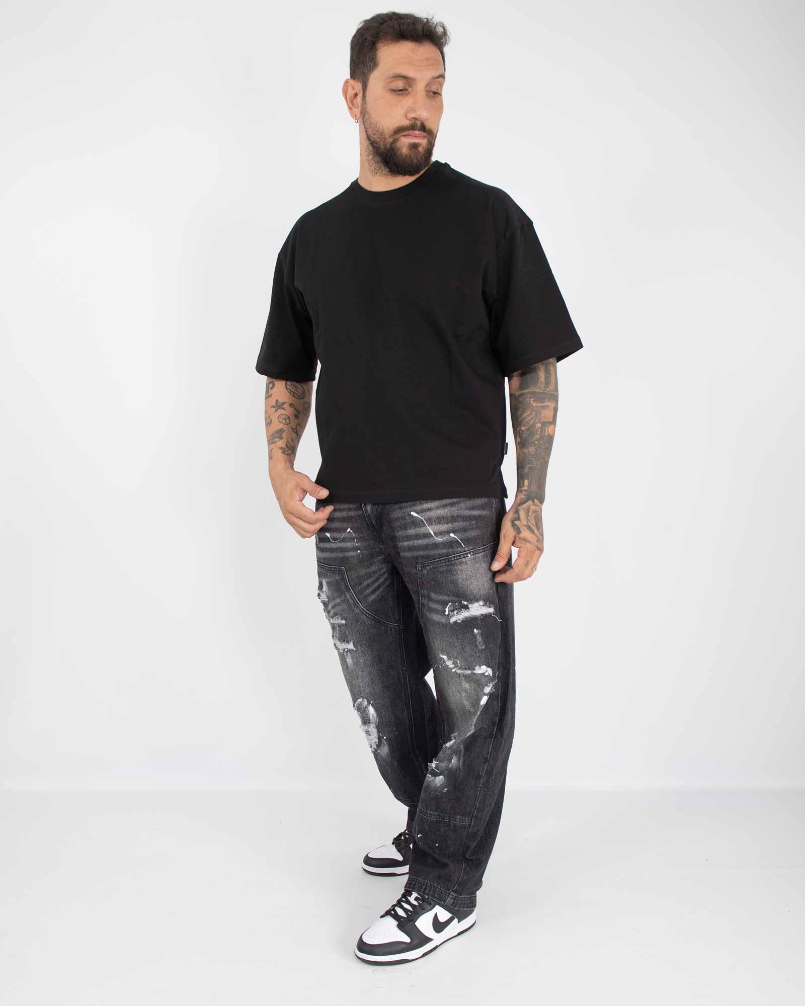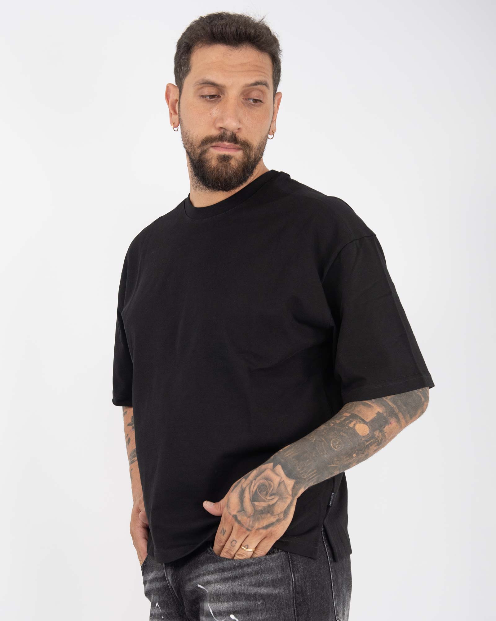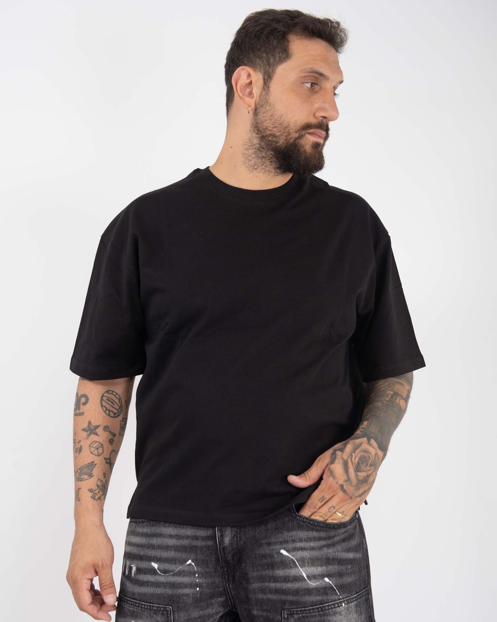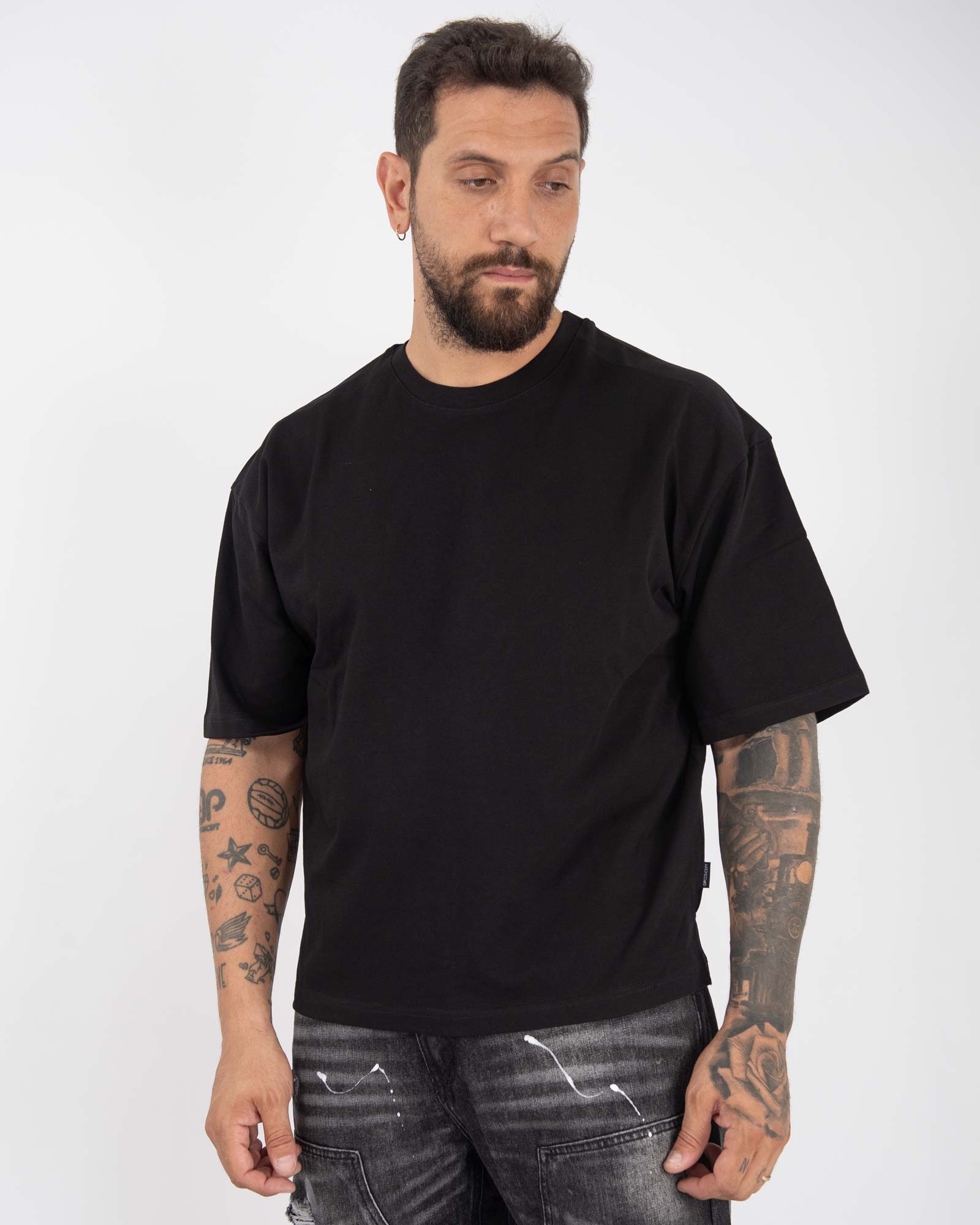 T-shirt cropped in cotone peso 300gr, presenta spalla scesa e manica ampia con spacchi laterali sul fondo. In foto è indossata taglia XL per altezza 1,85cm e peso 97kg.