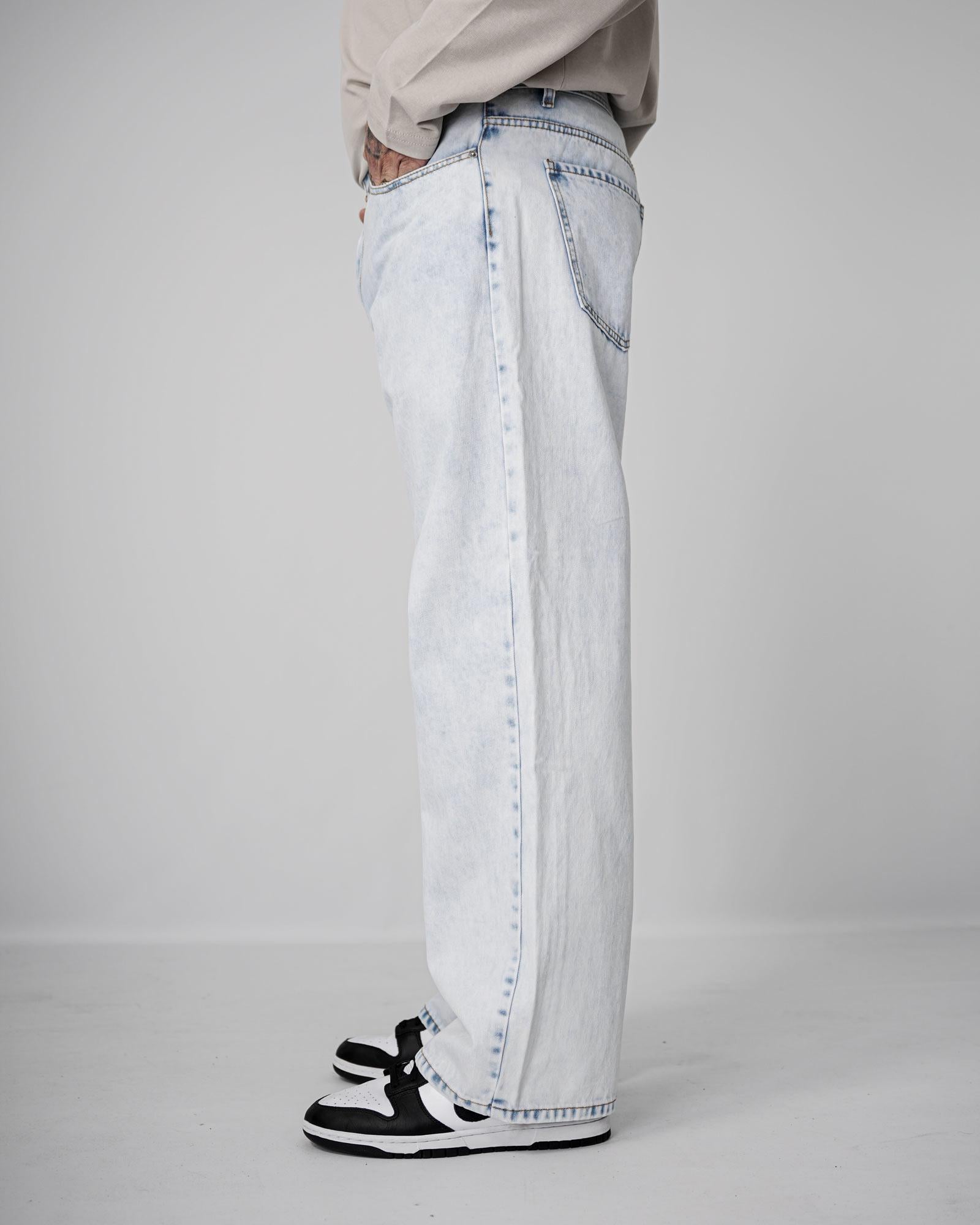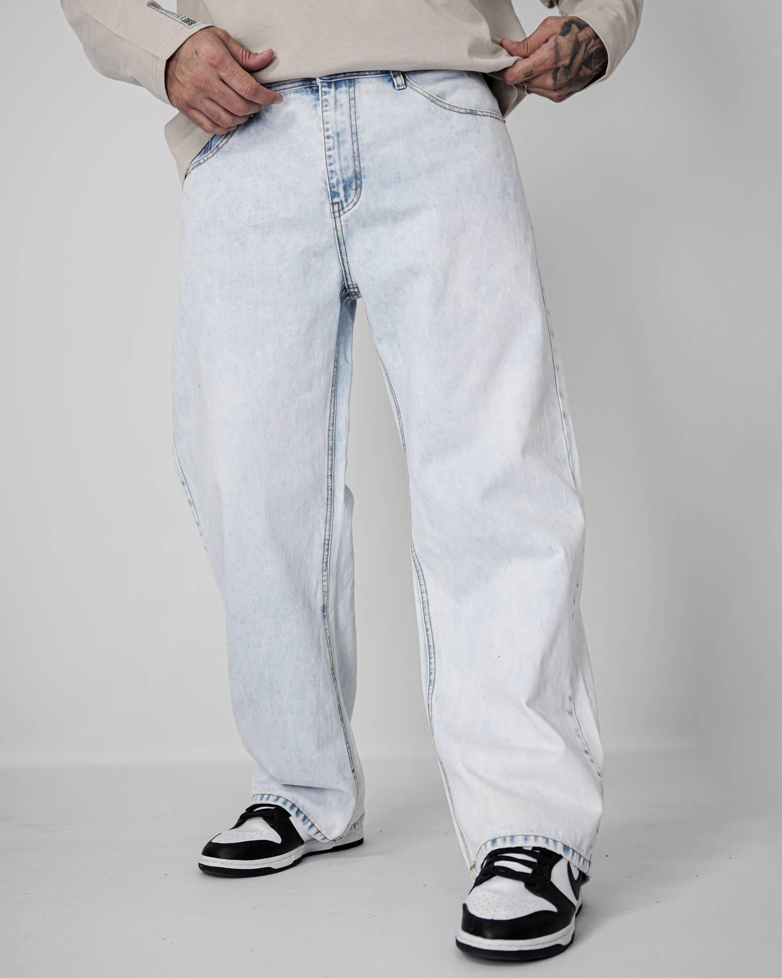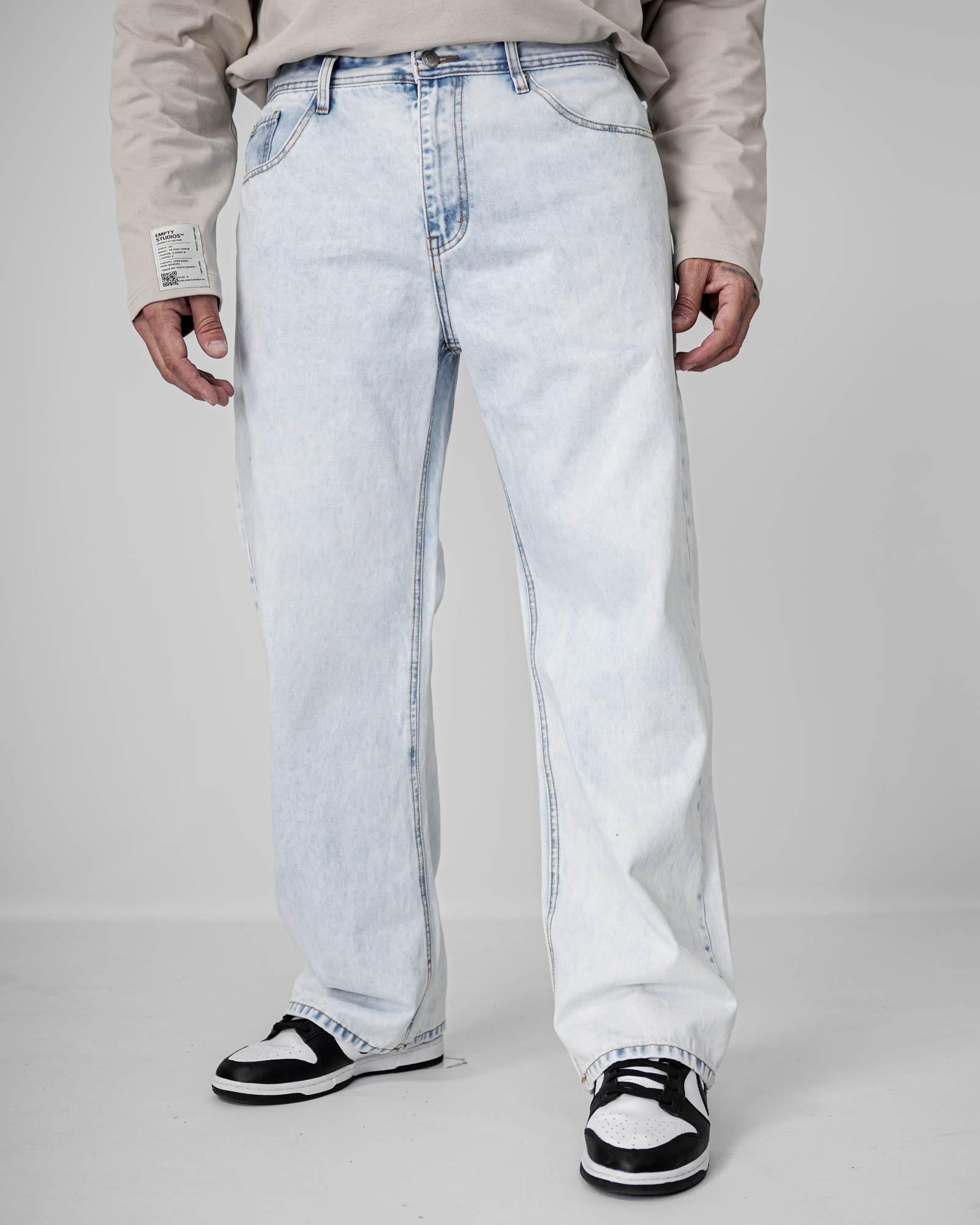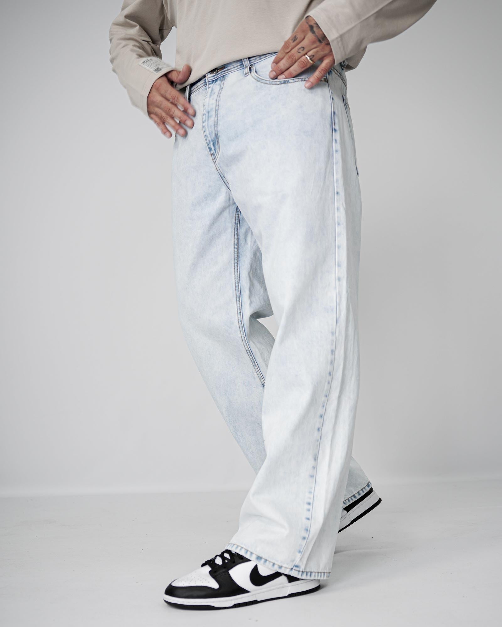 Jeans modello baggy fit in denim di cotone, cinque tasche e chiusura frontale con bottone e cerniera. Presenta effetto marmorizzato. In foto è indossata la taglia 52 per altezza 1,85cm e peso 97kg.
