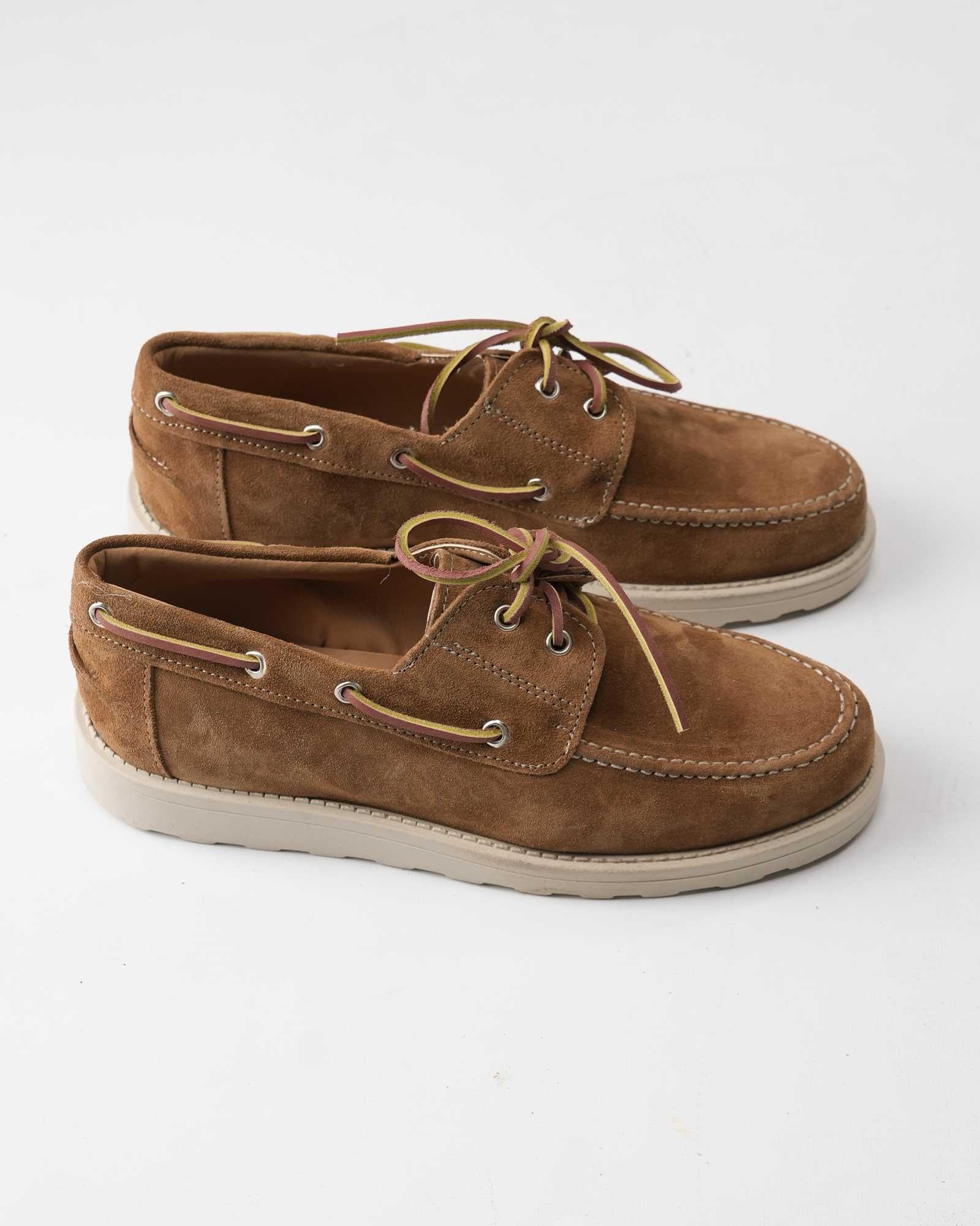 Mocassino modello barca realizzato in vera pelle scamosciata, presenta lacci bicolor a contrasto e cuciture a vista. Il fondo chiaro, leggero e resistente, assicura comfort e durata, mentre la calzata comoda e regolare.