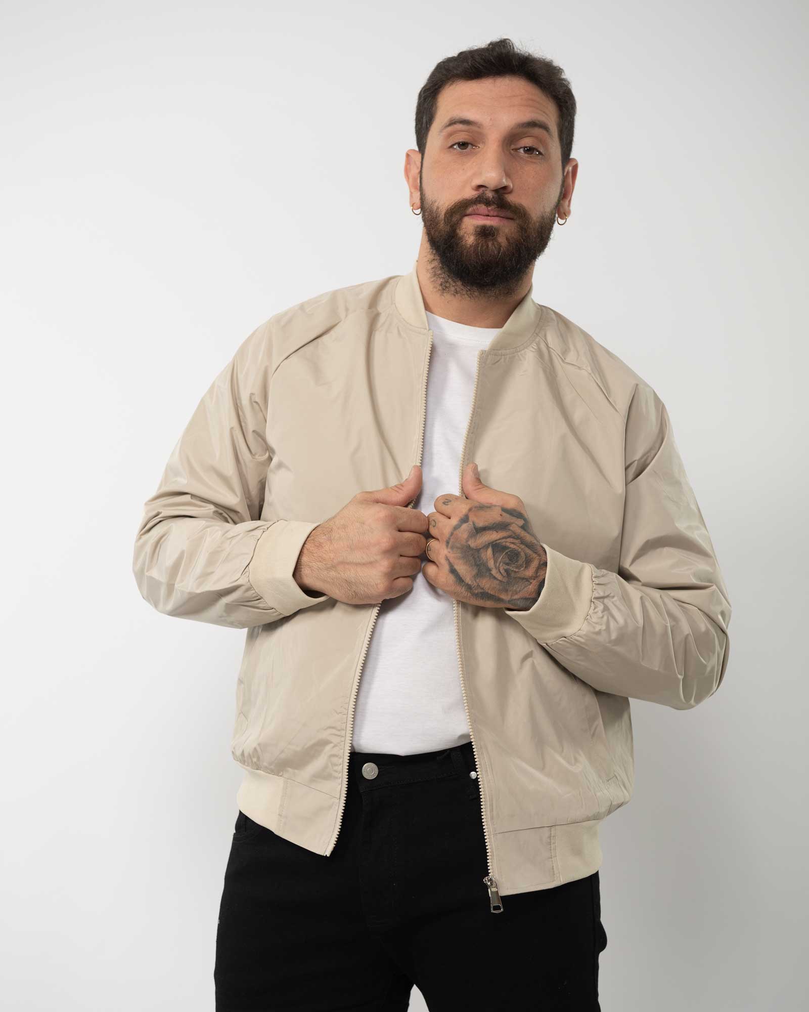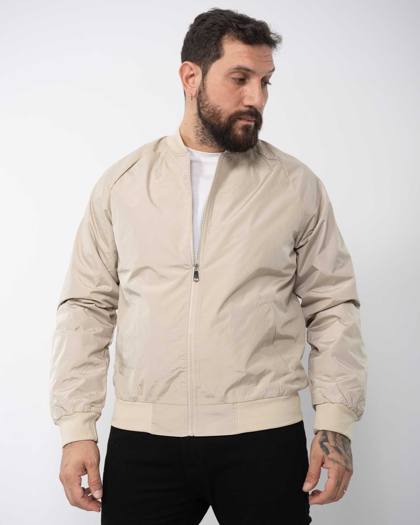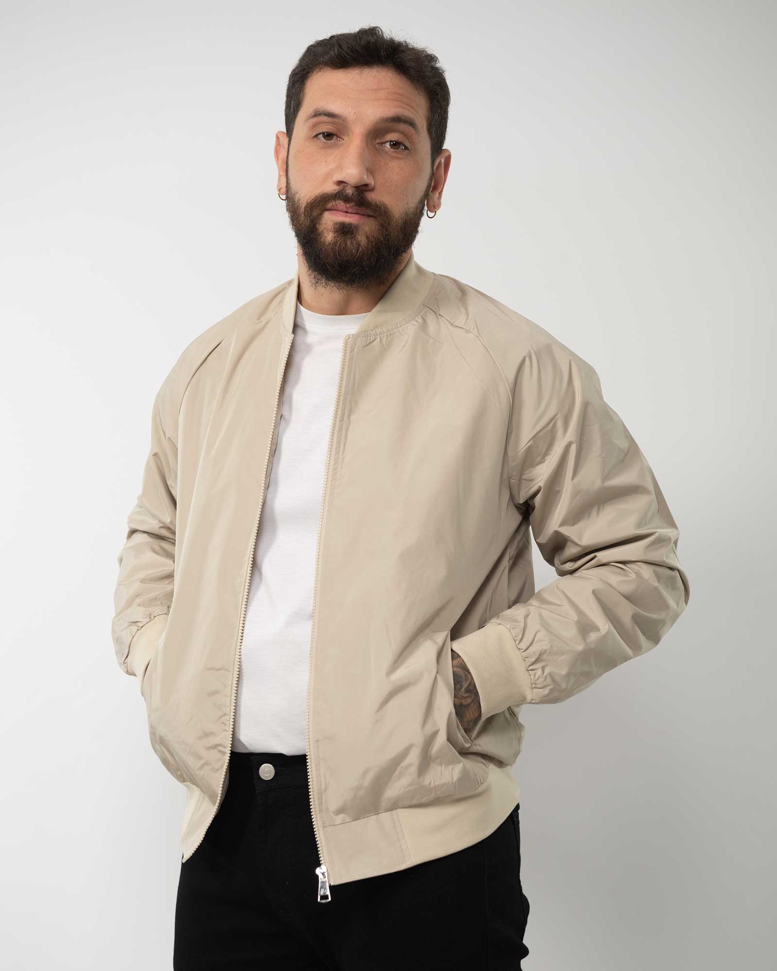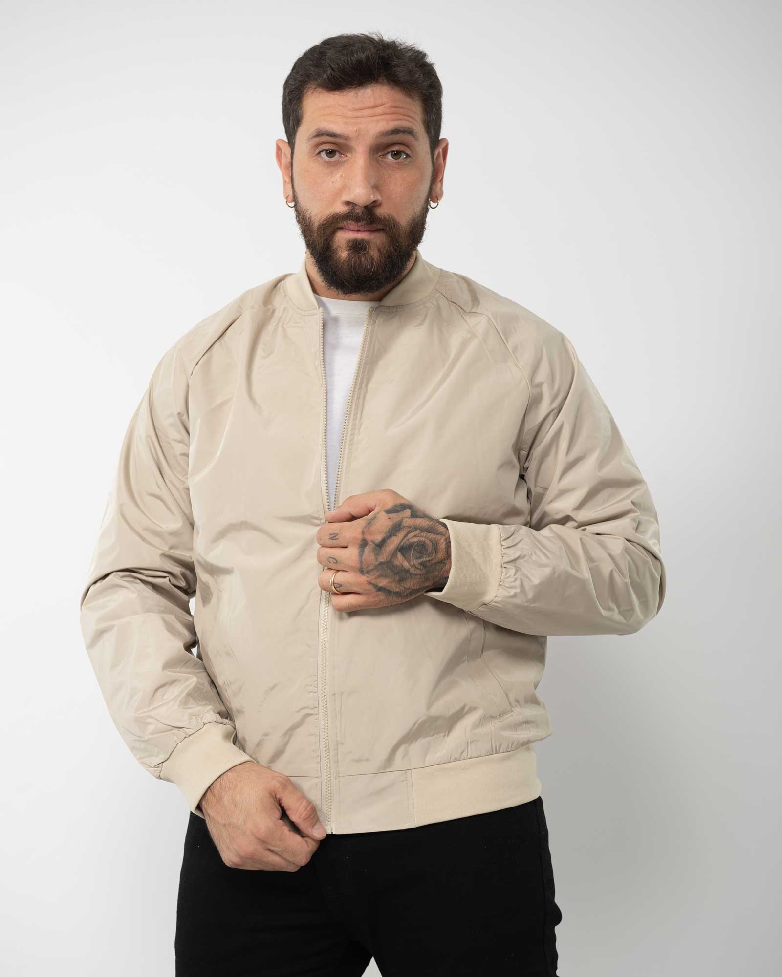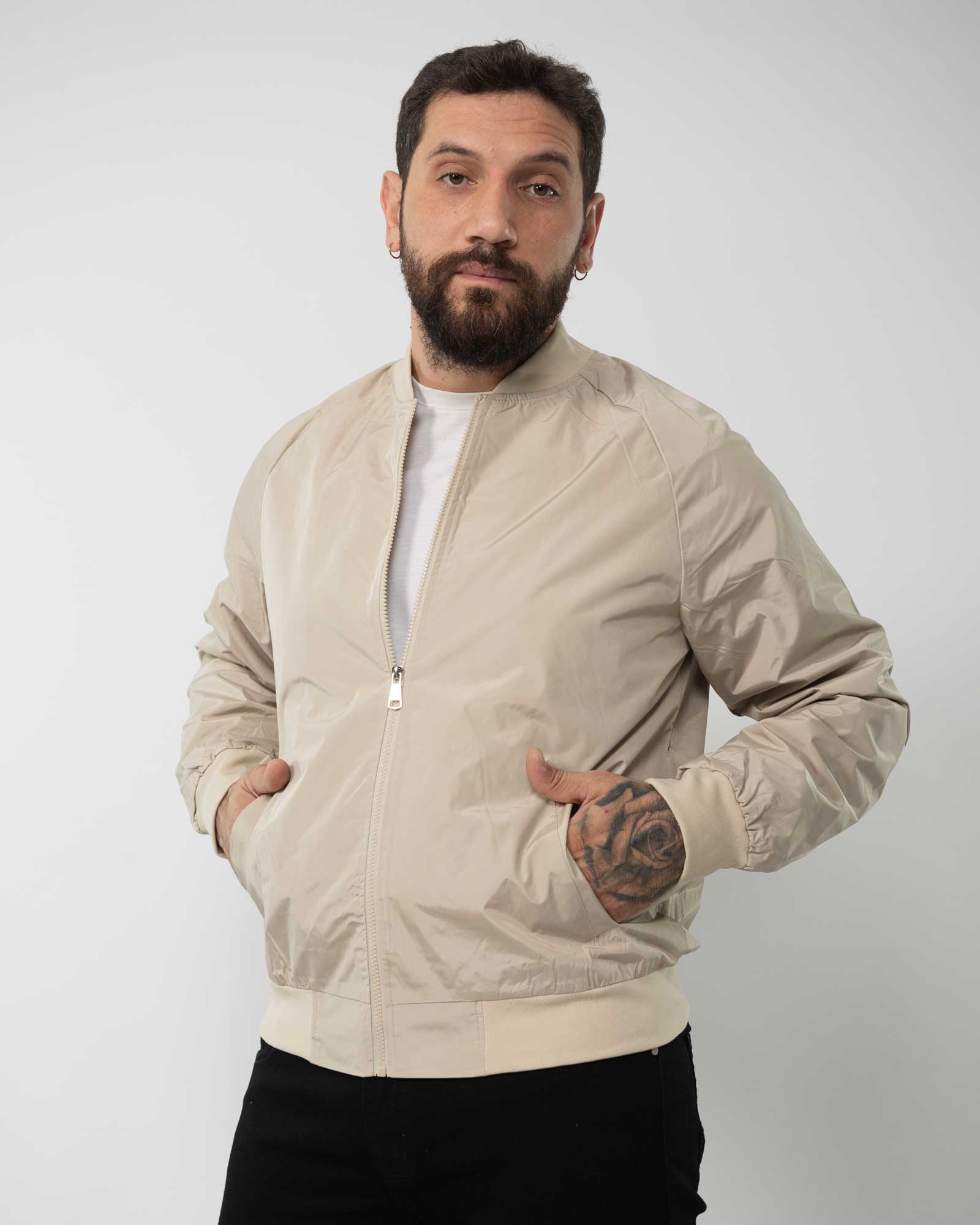 Giubbino in tessuto tecnico con collo in costine elastiche e maniche lunghe. Presenta tasche sui fianchi e orlo con finiture elastiche in tinta unita. Il modello in foto indossa taglia 54 è alto 1,85cm e pesa 97kg.