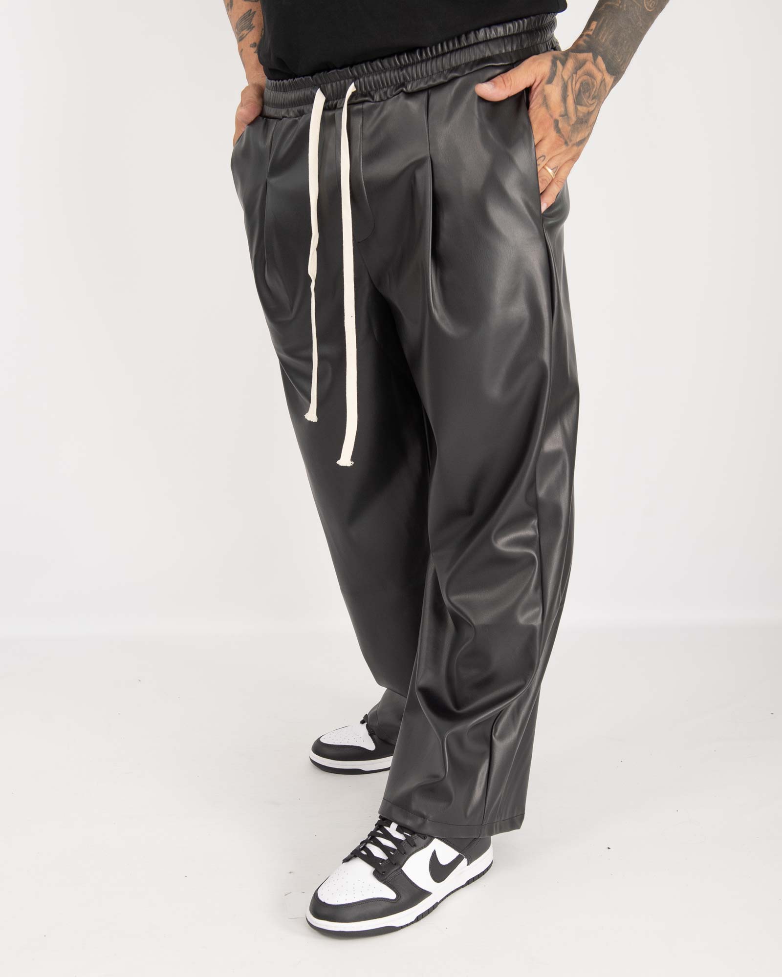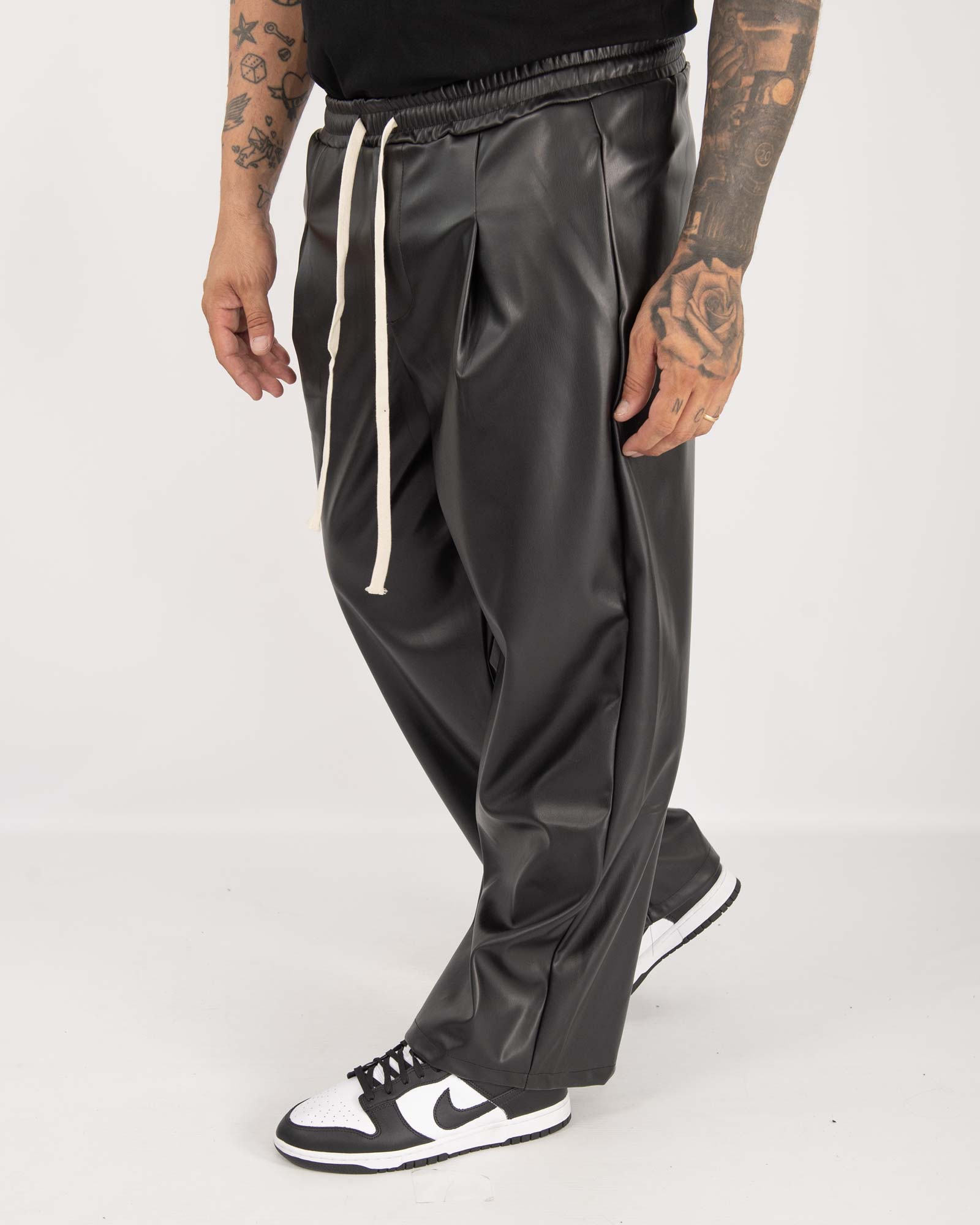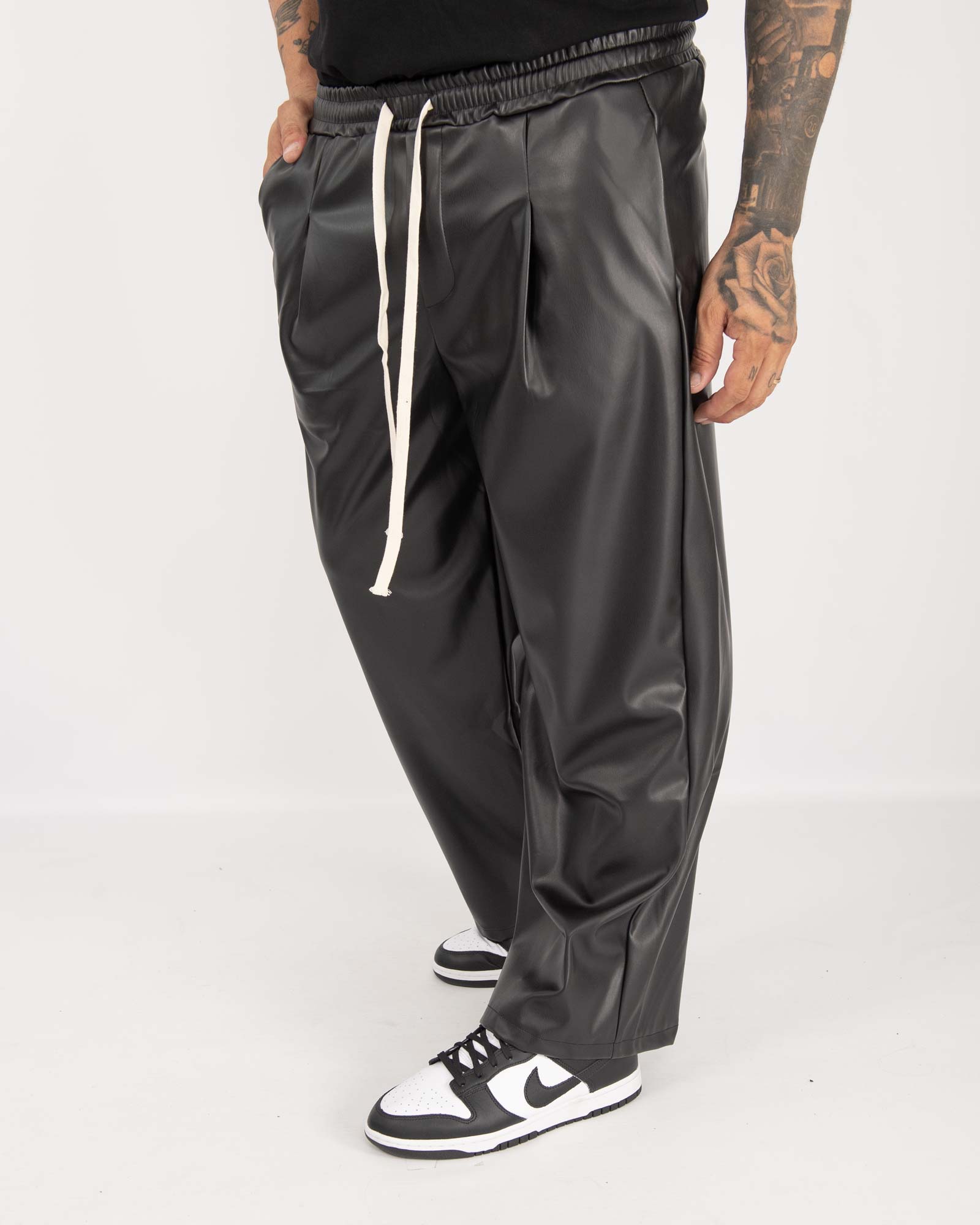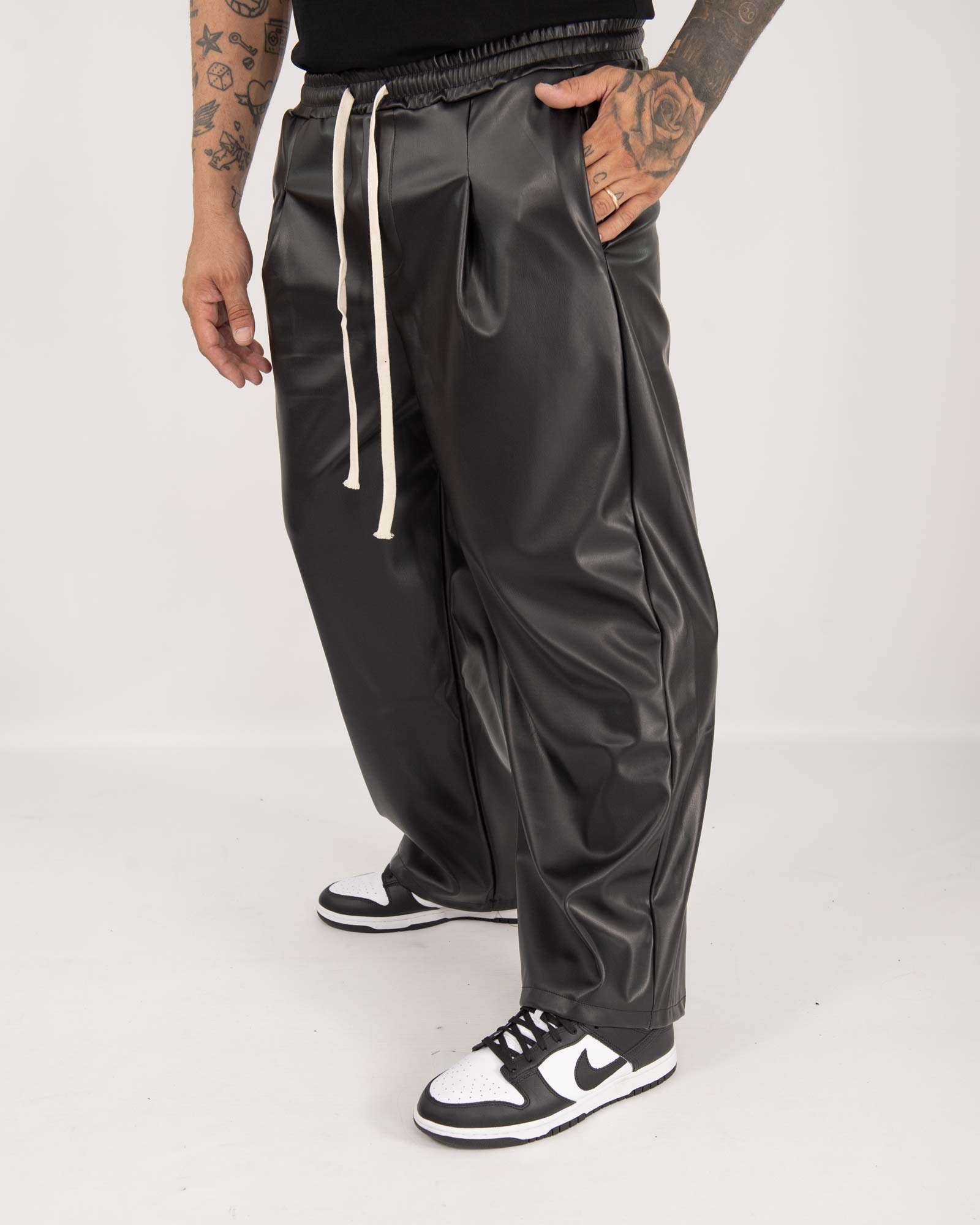 Pantalaccio in ecopelle con fondo ampio con vita elasticizzata regolabile con coulisse a contrasto. Presenta pinces sul davanti e tasche laterali. In foto è indossata la taglia XL per altezza 1.85cm e peso 97kg.