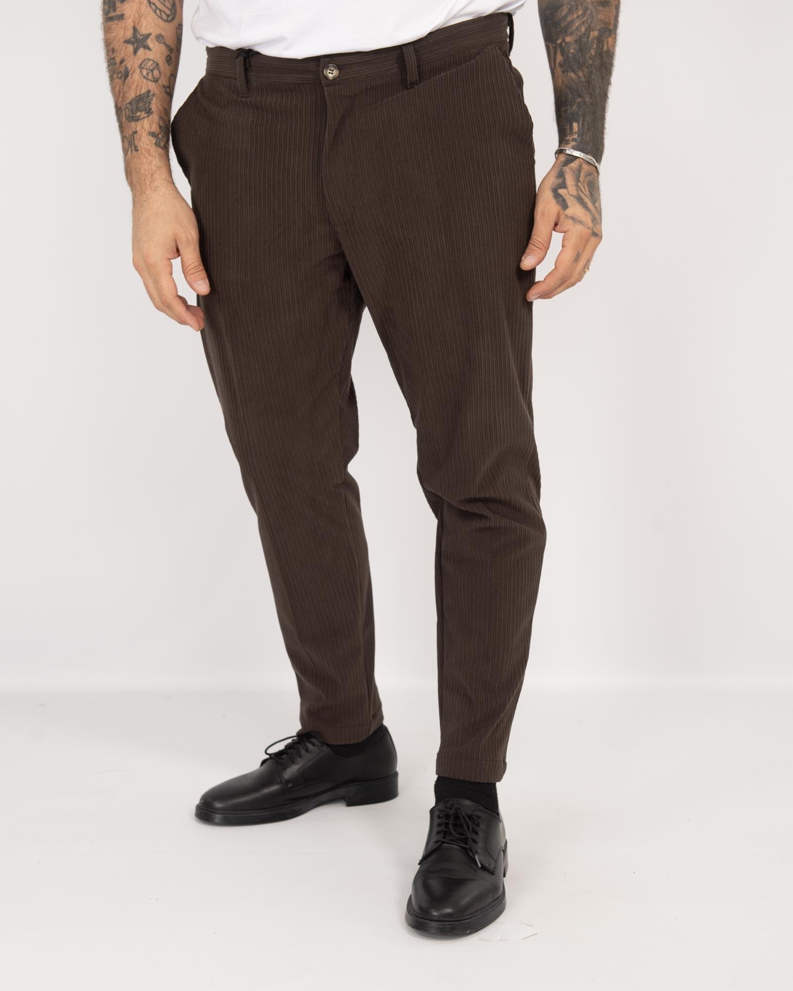 Pantalone fit sartoriale realizzato in velluto 100% cotone, presenta chiusura con bottone e zip e dettaglio di tasca laterale e tasche a filetto sul retro, produzione made in Italy. In foto è indossa taglia 54 per altezza1,85cm e peso 97kg.