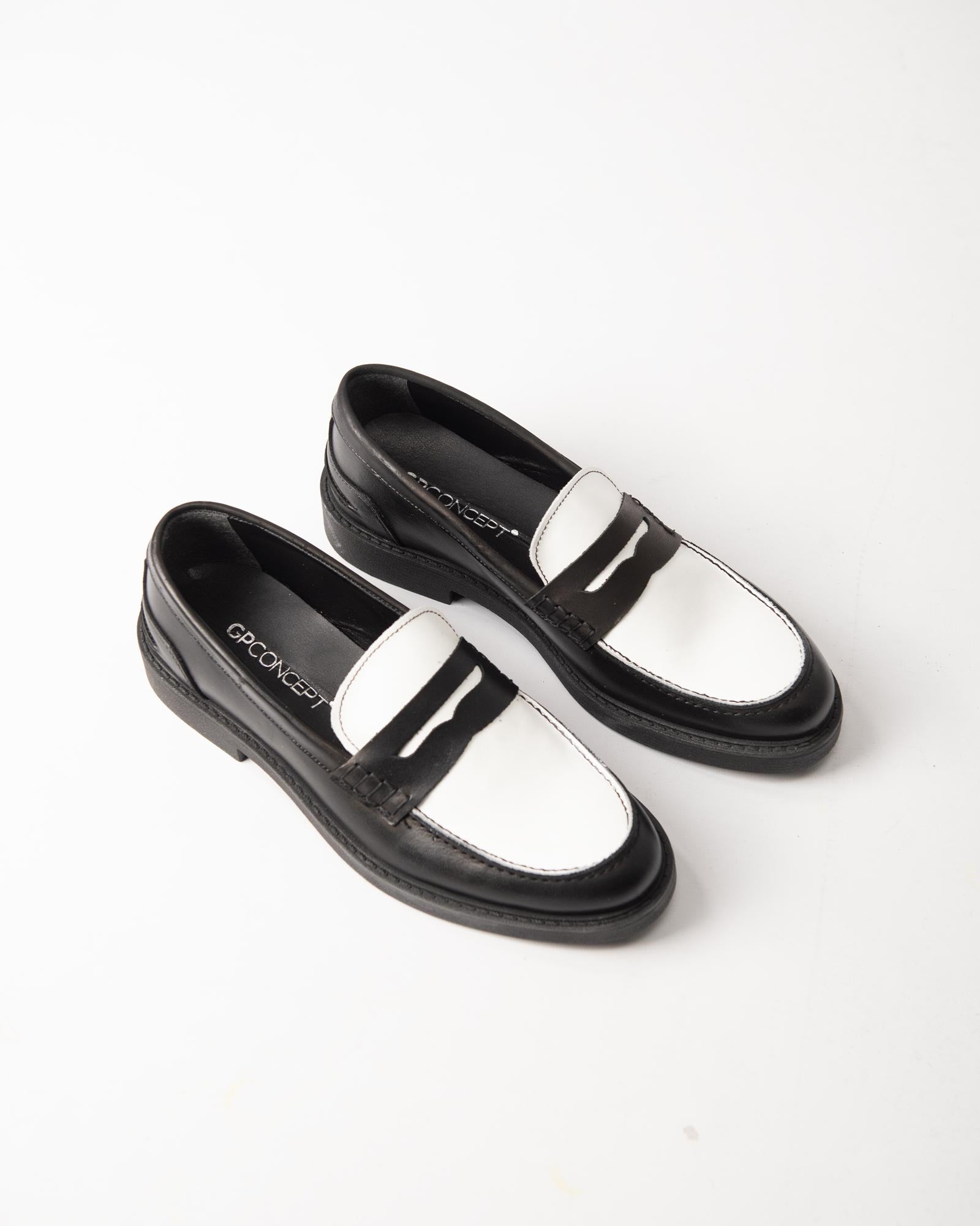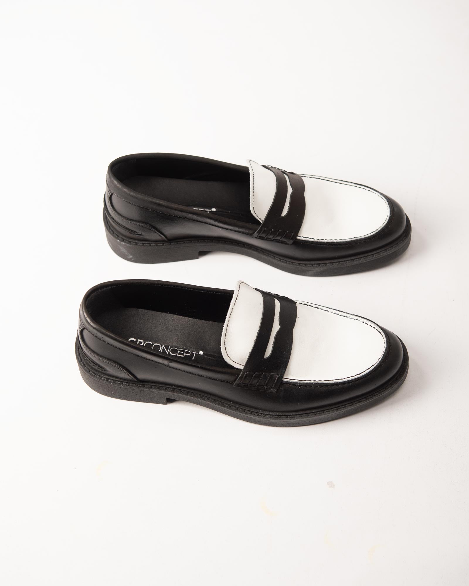 Mocassino in vera pelle con fascetta e tomaia con contrasto di colori. Forma rotonda e suola in gomma antiscivolo.