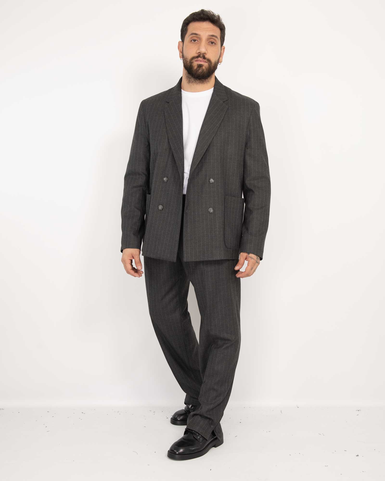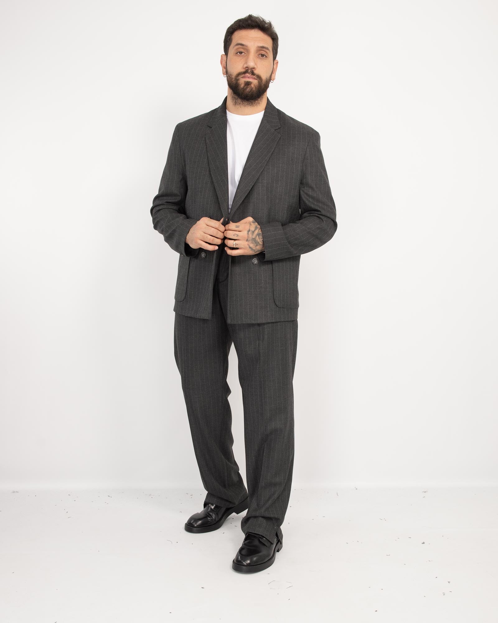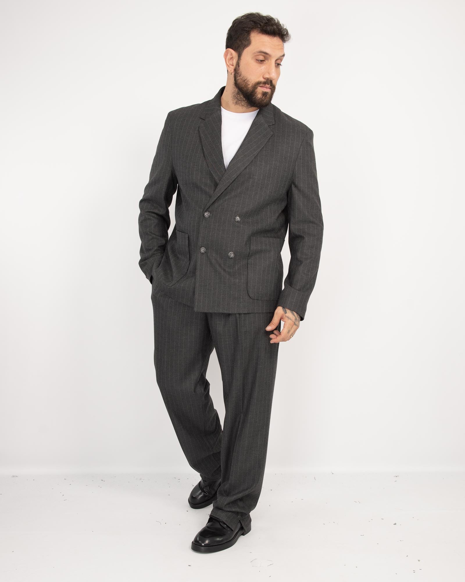 Abito doppiopetto in flanella light gessata con giacca semi over con tasche a toppa sul davanti e pantalone fondo ampio con spacchetto sul fondo, presenta abbottonatura frontale con bottone e cerniera. In foto è indossata la taglia 54 per altezza 1,85cm e peso 97kg.