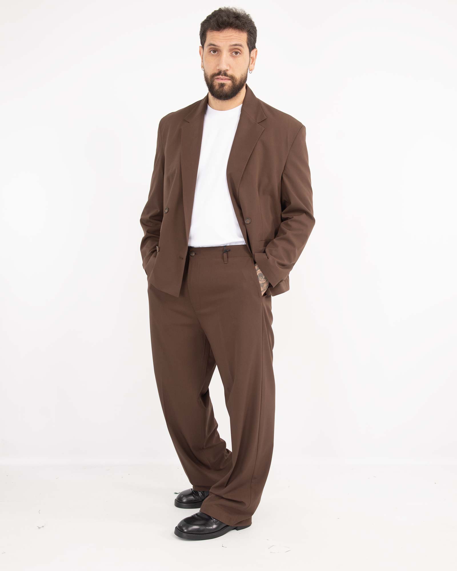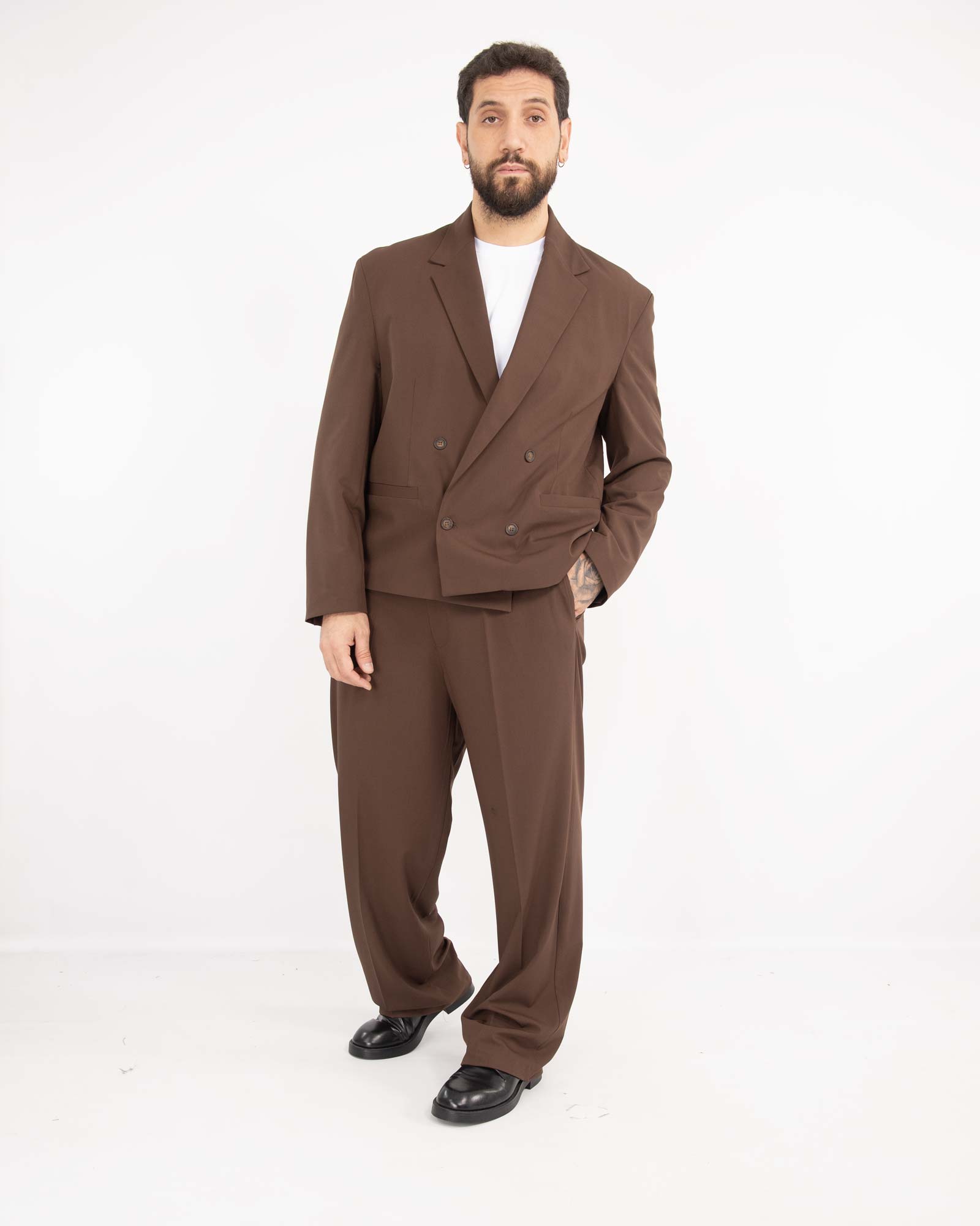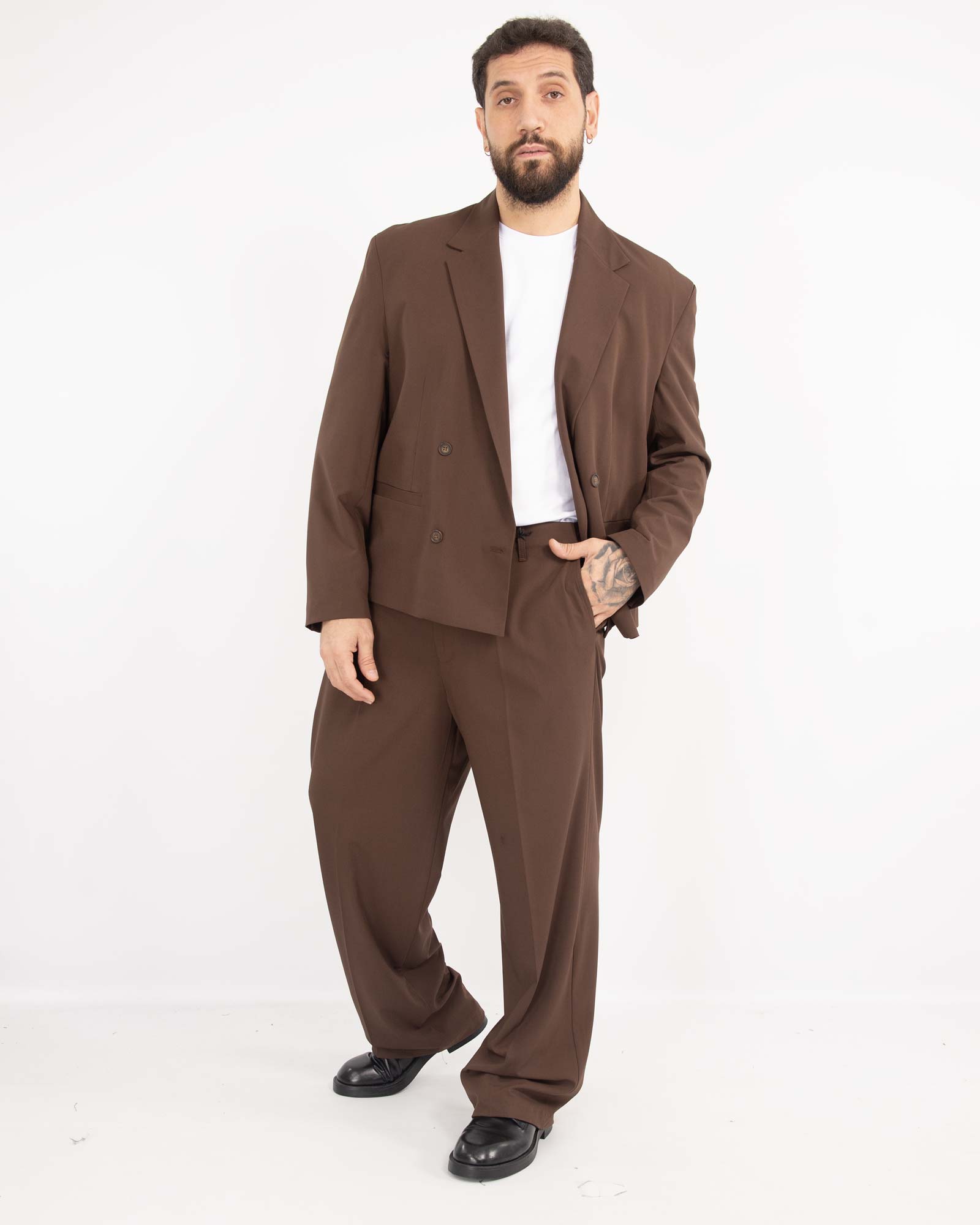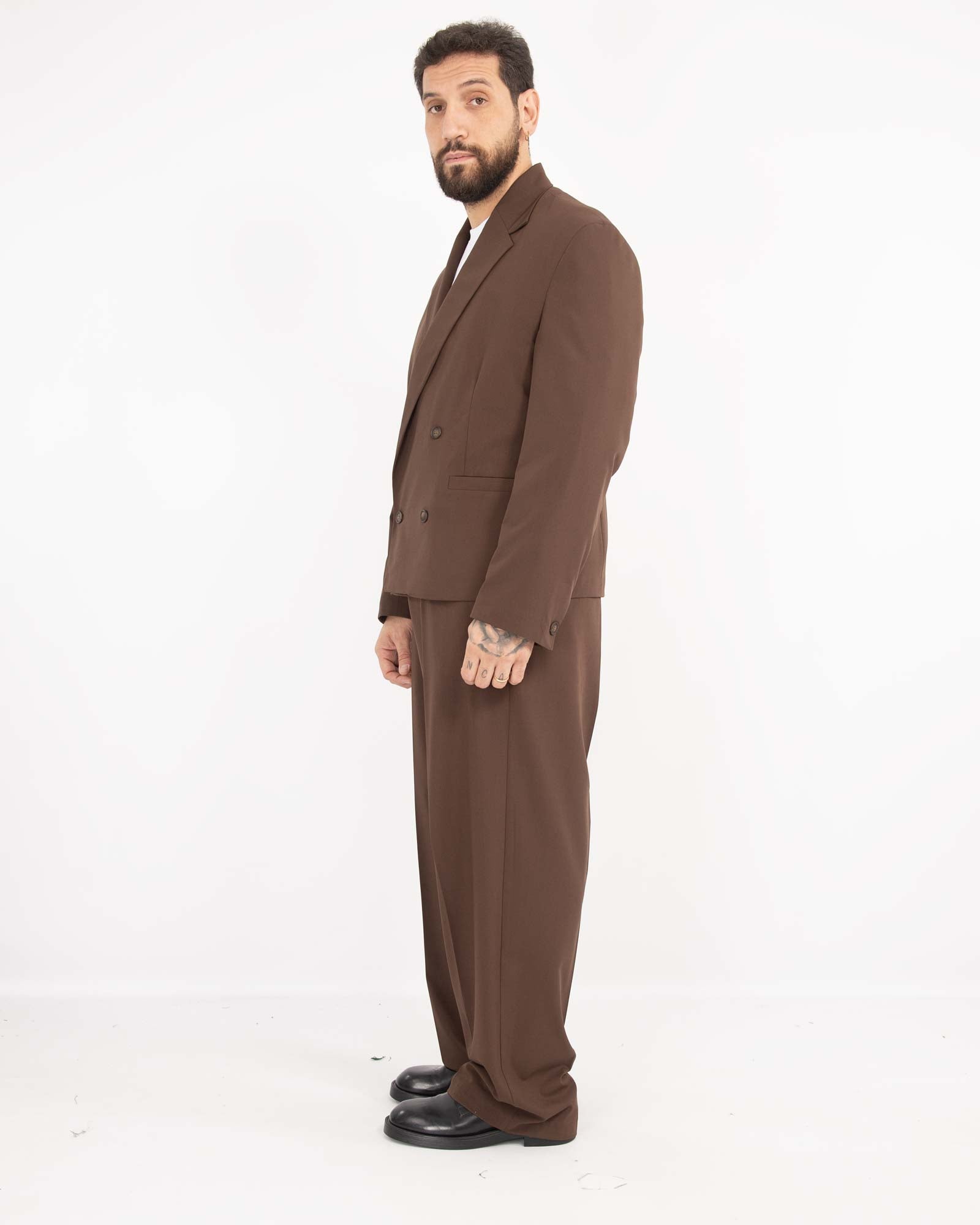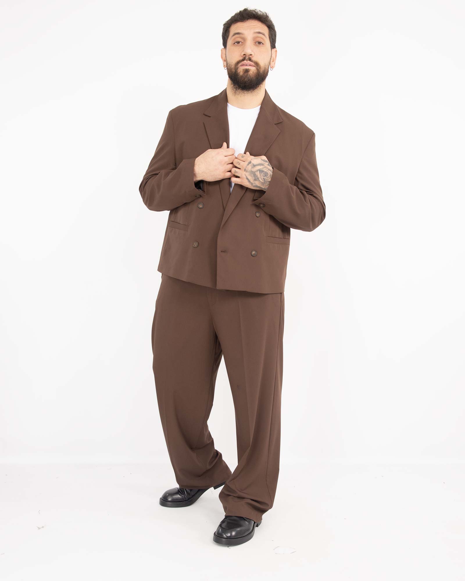 Abito con blazer doppiopetto, spalline e revers ampio con tasche a toppa applicate abbinato al pantalone vita alta, fit sartoriale e fondo ampio con abbottonatura frontale bottone e zip.  Il modello in foto indossa una 56 per altezza 1,85cm e peso 97kg.