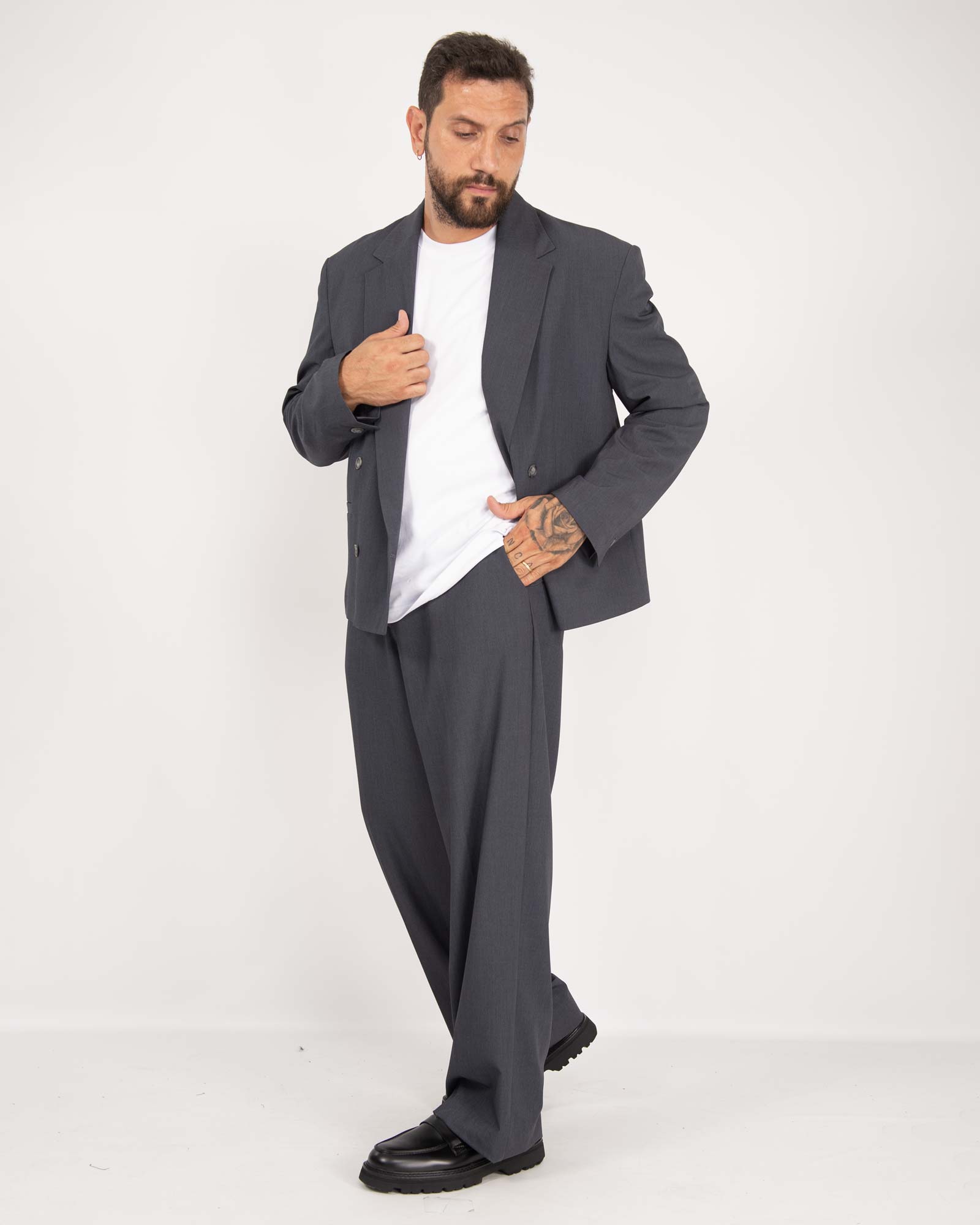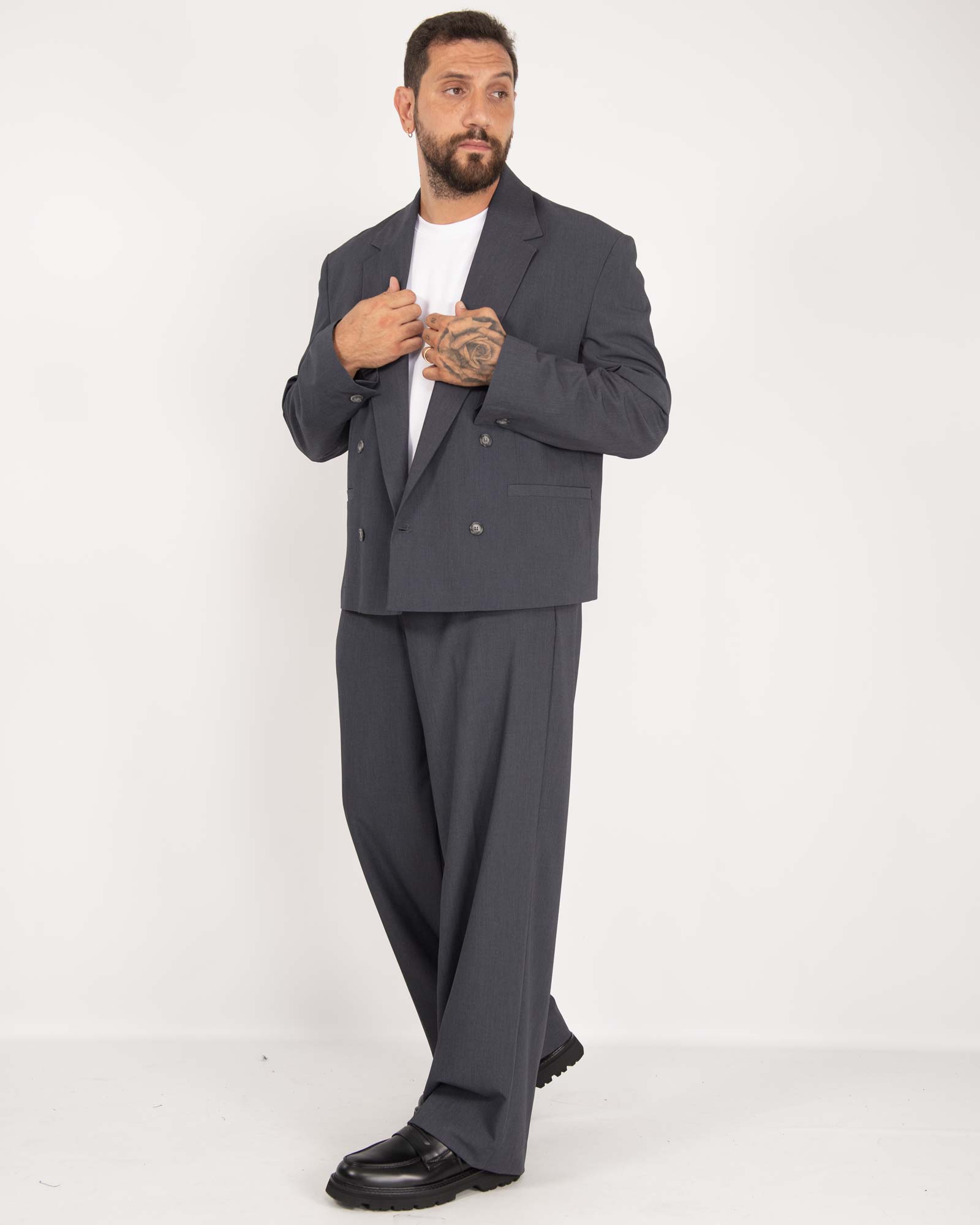 Abito con blazer doppiopetto, spalline e revers ampio con tasche a toppa applicate abbinato al pantalone vita alta, fit sartoriale e fondo ampio con abbottonatura frontale bottone e zip.  Il modello in foto indossa una 56 per altezza 1,85cm e peso 97kg.