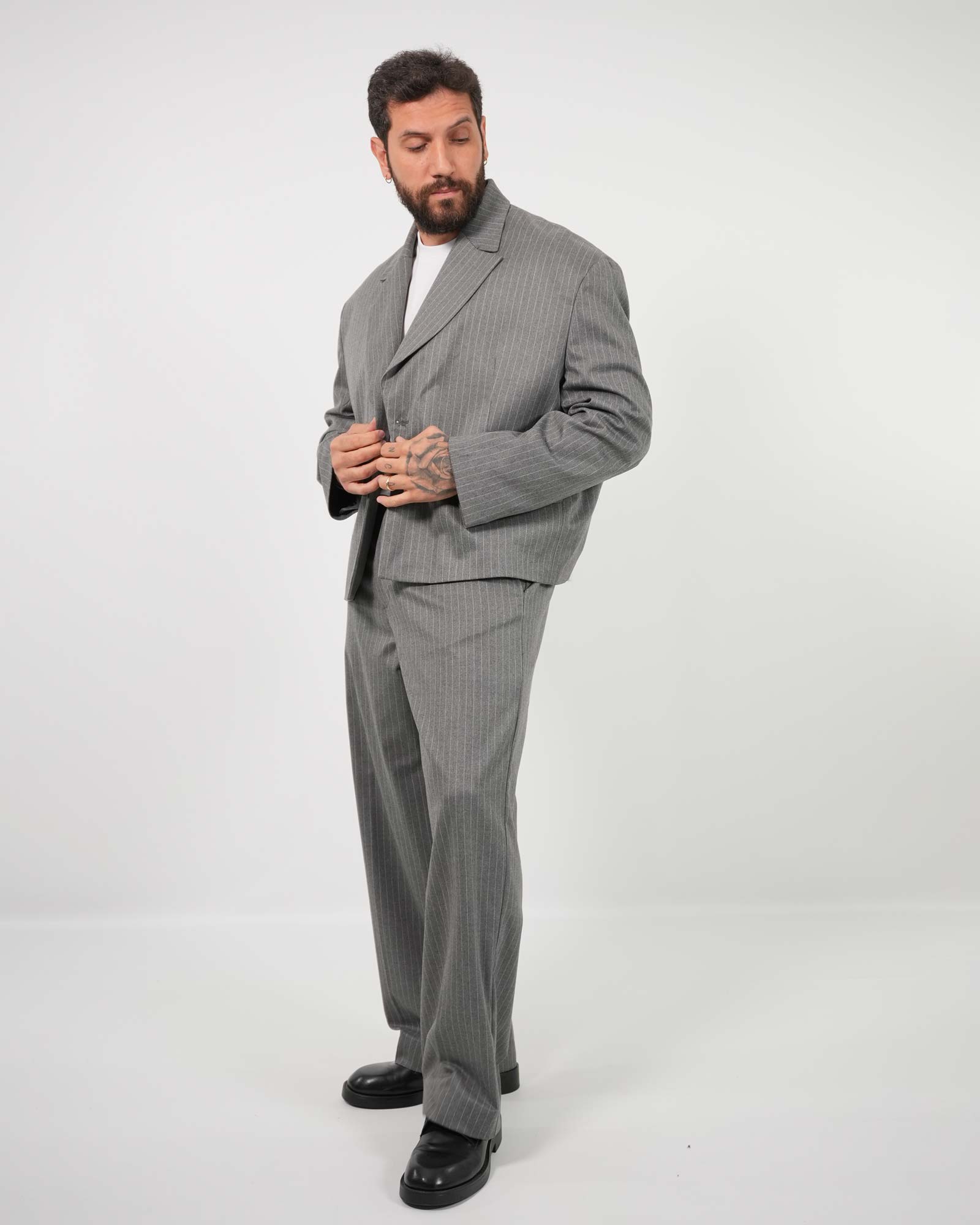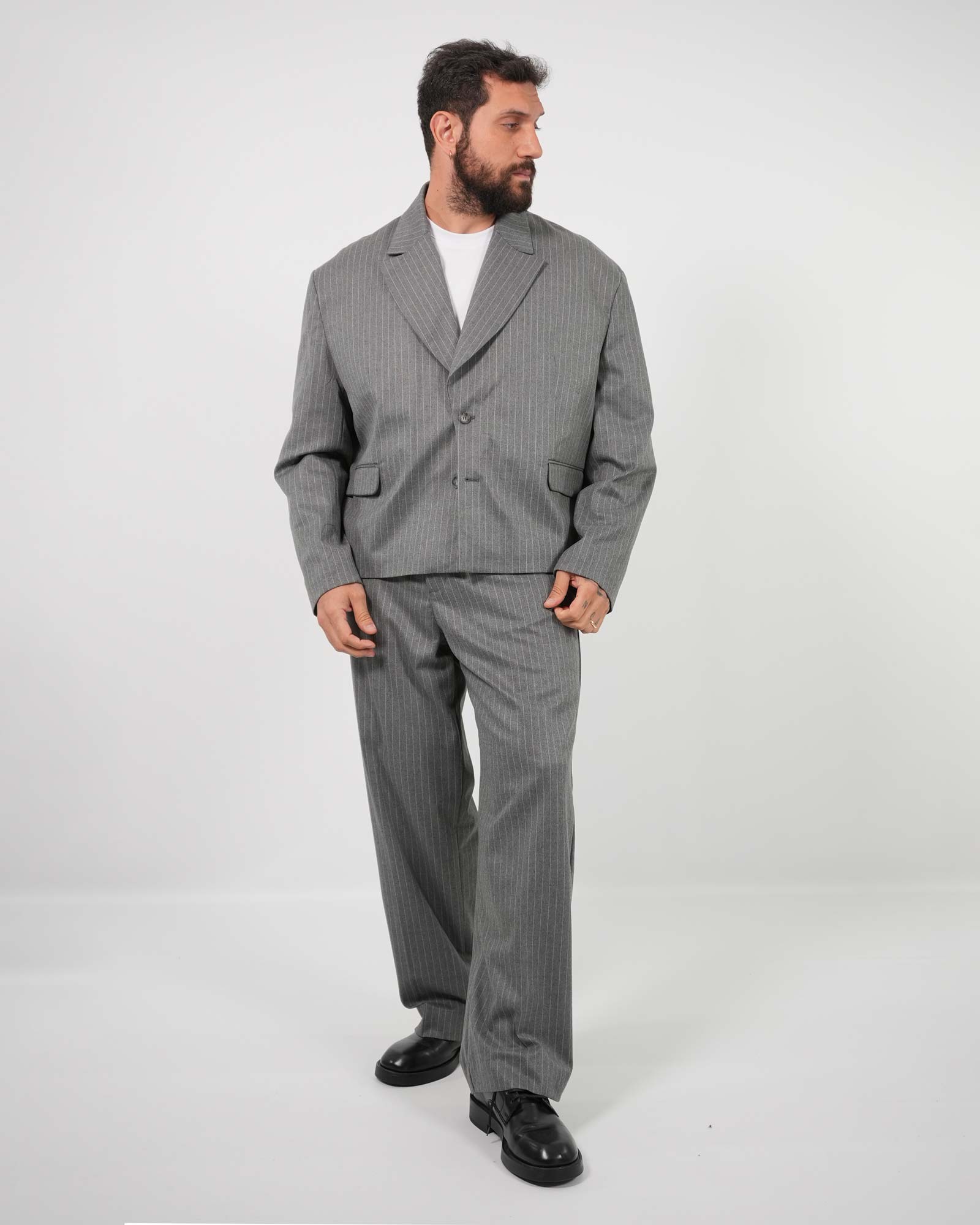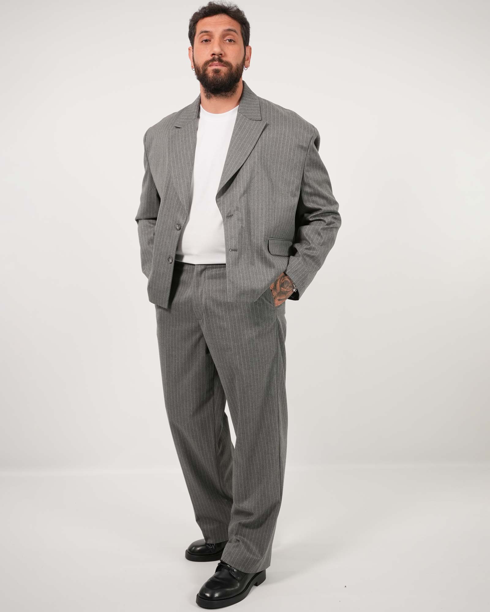 Abito con blazer monopetto, spalline e revers ampio con tasche a toppa applicate abbinato al pantalone vita alta, fit sartoriale e fondo ampio con abbottonatura frontale bottone e zip. In foto è indossata la taglia 52 per la giacca (molto ampia) e a taglia 56 per il pantalone per altezza 1.85cm e peso 97kg.
