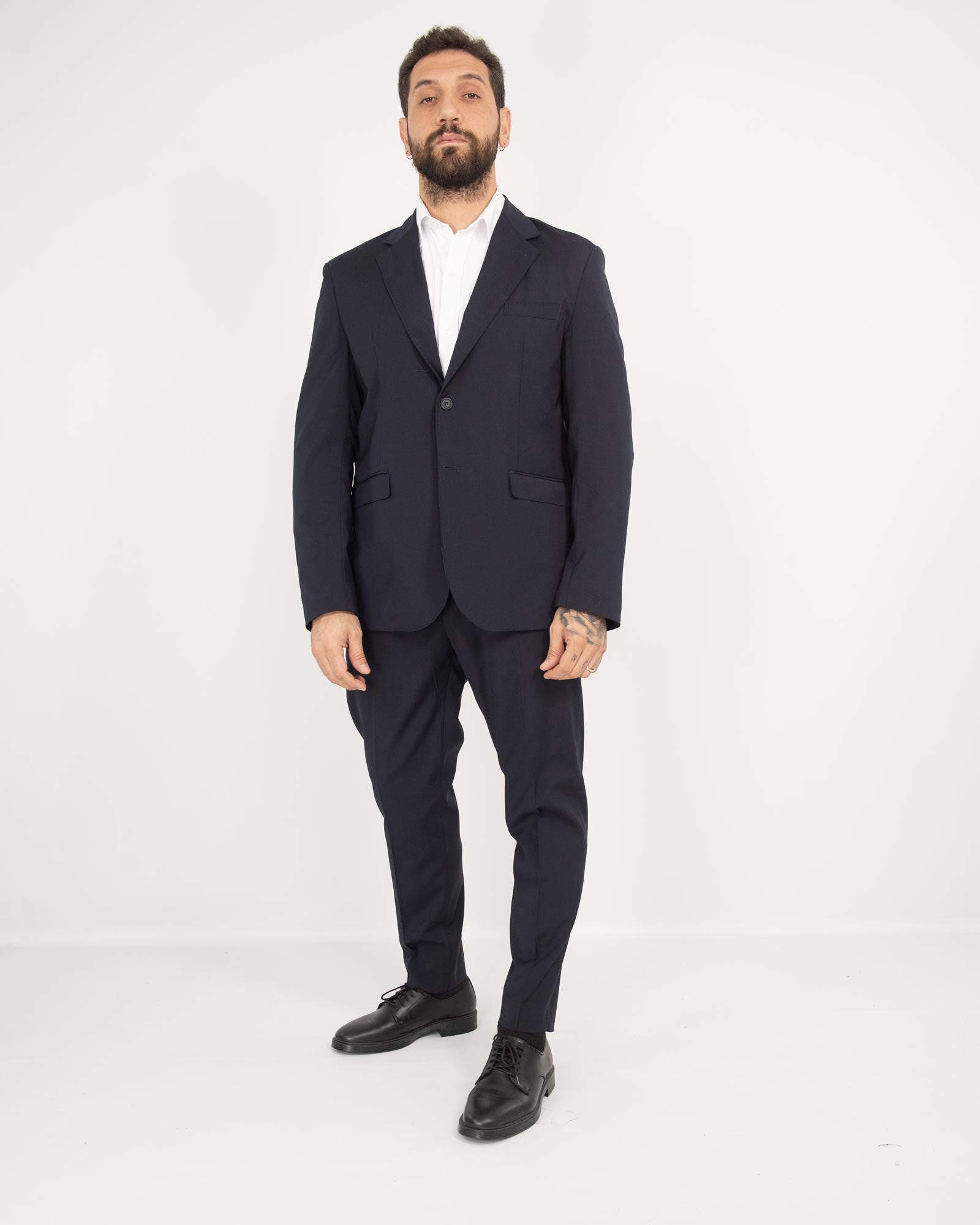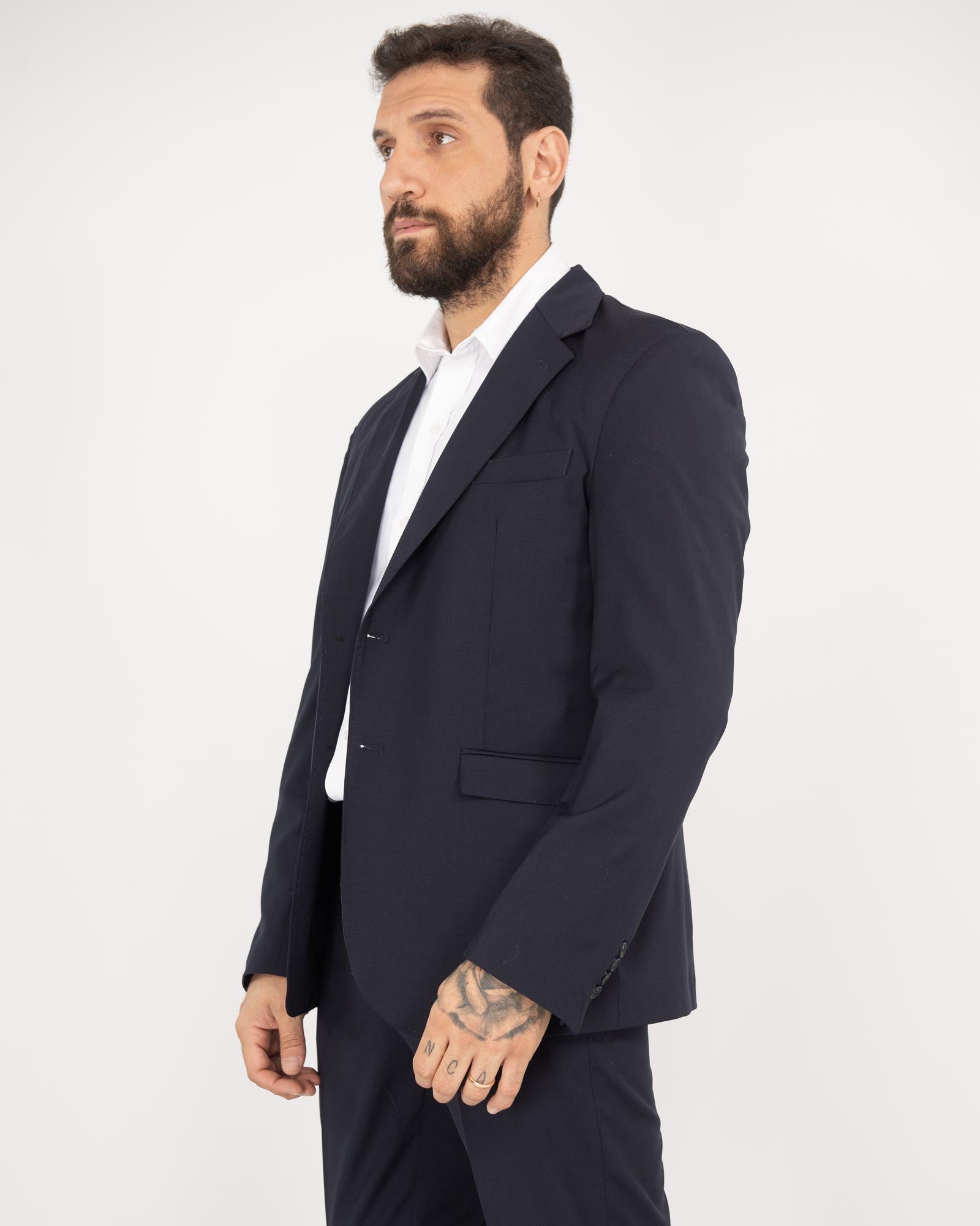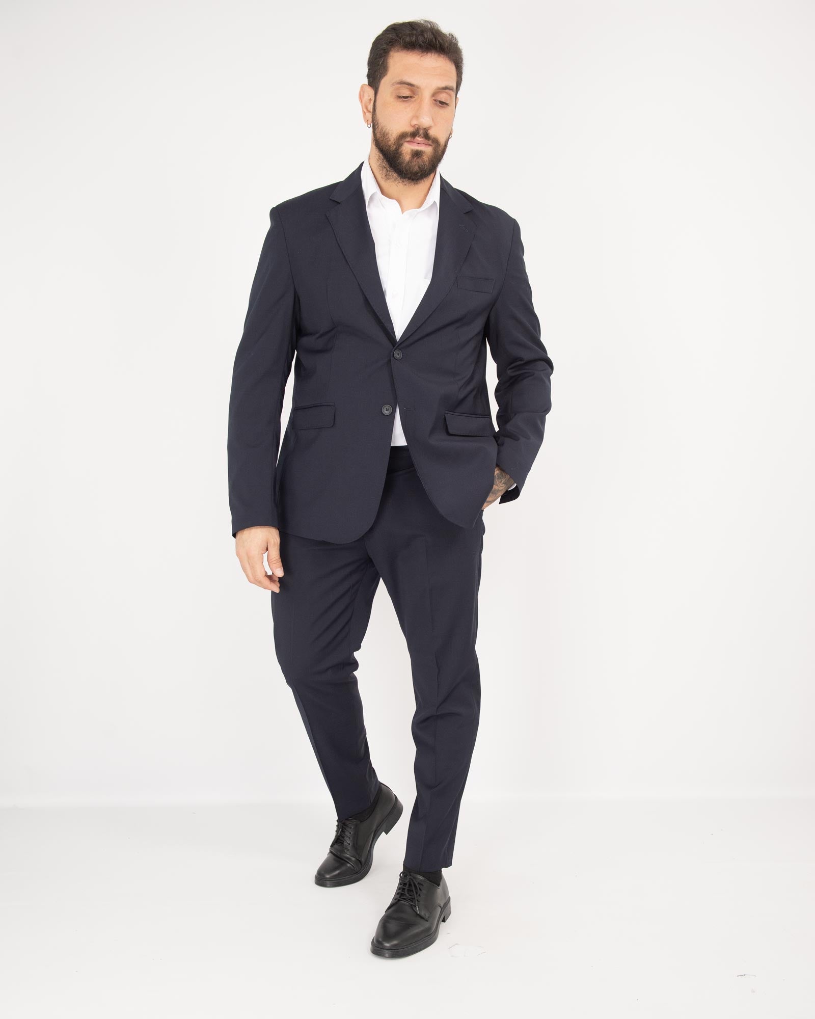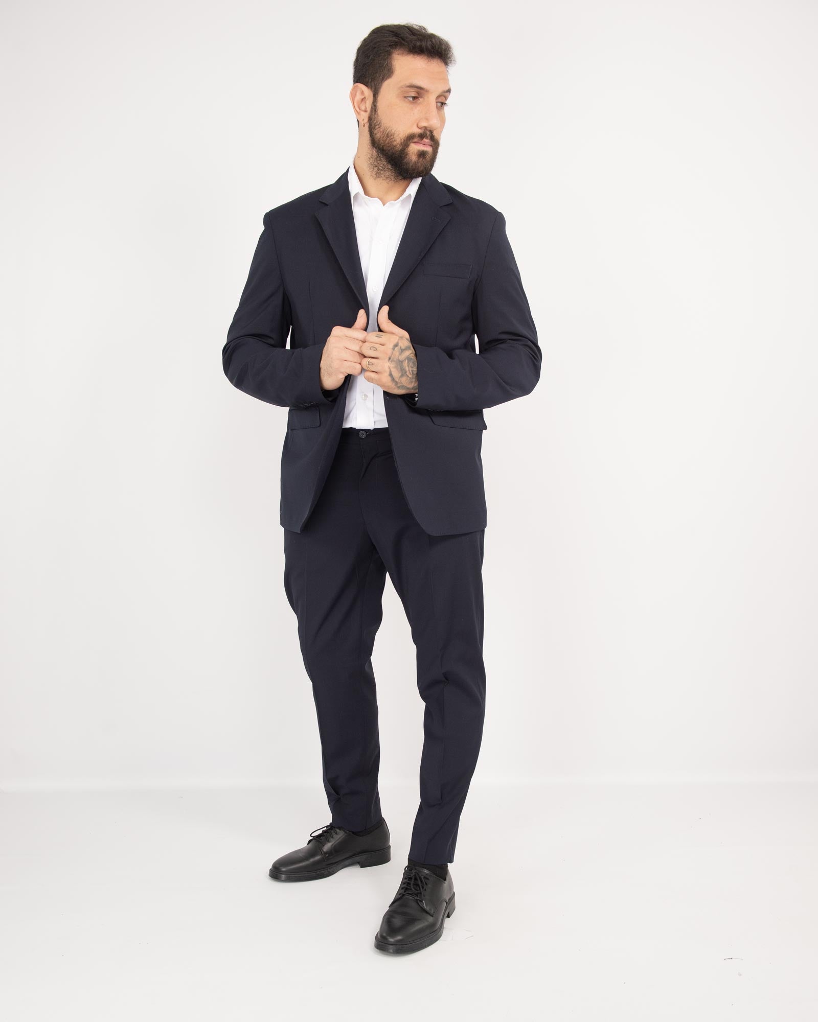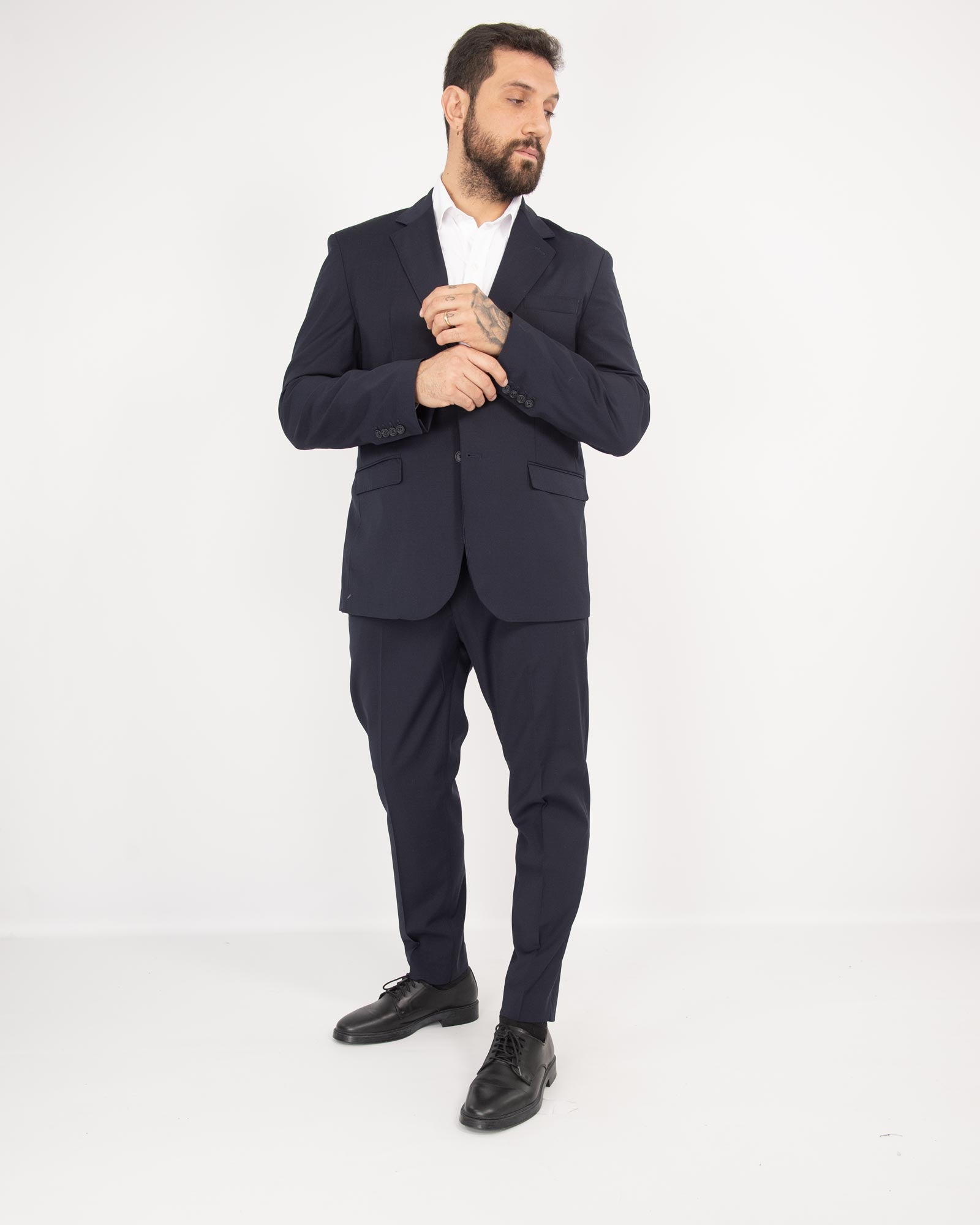 Abito fit sartoriale composto realizzato in fresco lana (quattro stagioni). L'abito è composto da giacca monopetto foderata con tasche a patta sul davanti e tasca interna abbinato al pantalone fondo stretto con tasche laterali e tasche a filetto sul retro. In foto è indossata taglia 56 per la giacca e taglia 54 per il pantalone, altezza 1,85cm e peso 97kg.