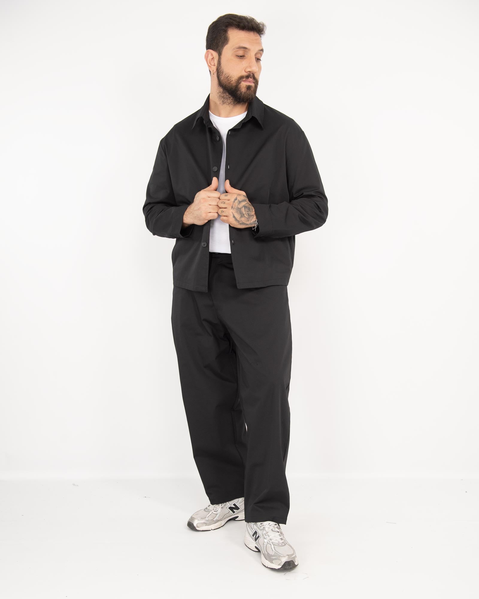 Coordinato balloon fit in gabardine 100% cotone, composto da giacca camicia boxy fit con tasche laterali e pantalone balloon fit con vita caratterizzata da elastico sul retro. In foto è indossata la taglia XL per altezza 1.85cm e peso 97kg.