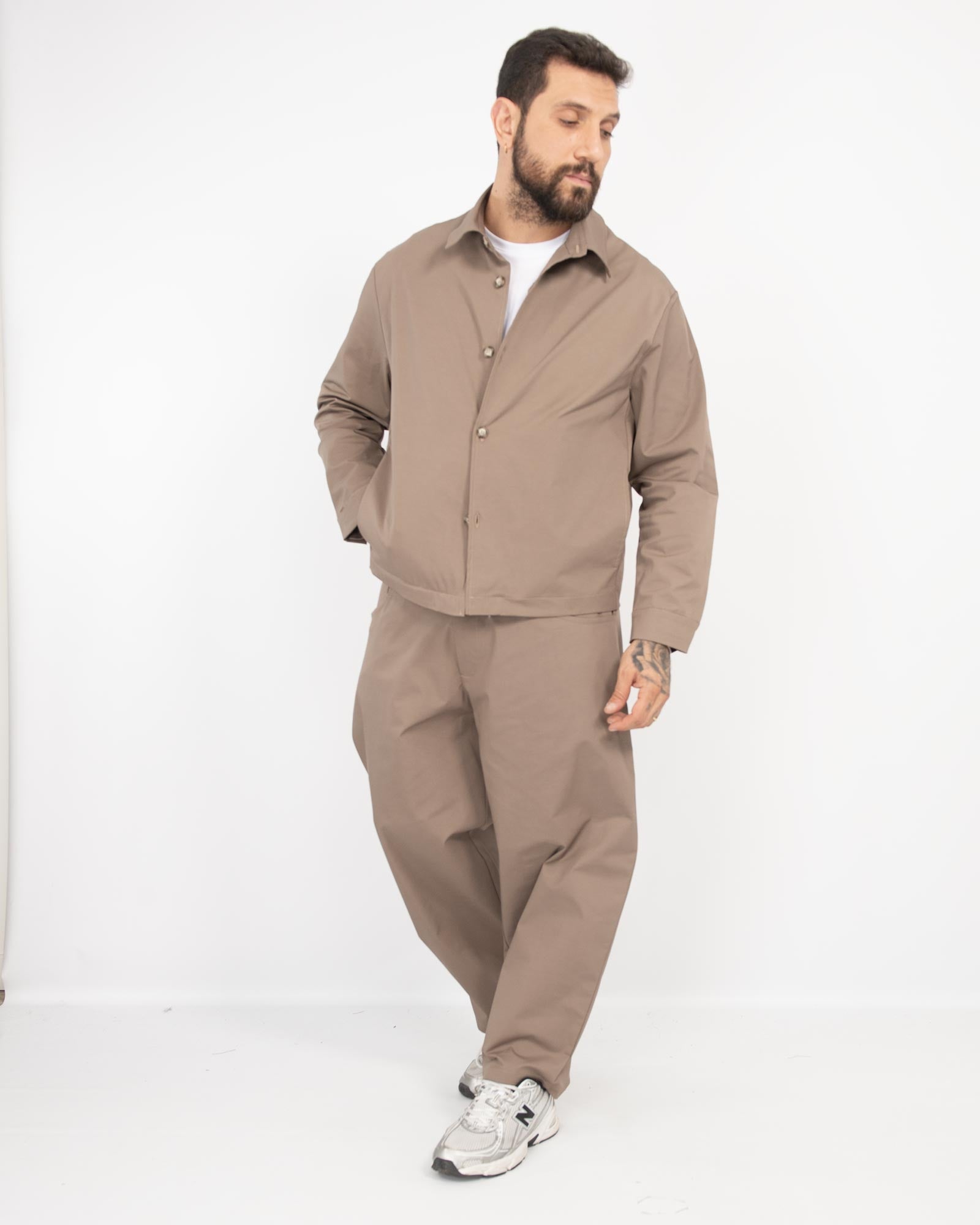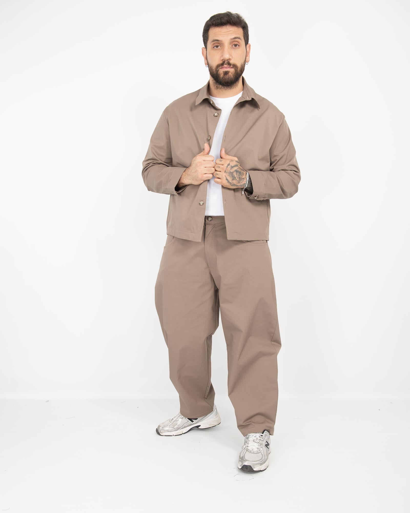 Coordinato balloon fit in gabardine 100% cotone, composto da giacca camicia boxy fit con tasche laterali e pantalone balloon fit con vita caratterizzata da elastico sul retro. In foto è indossata la taglia XL per altezza 1.85cm e peso 97kg.