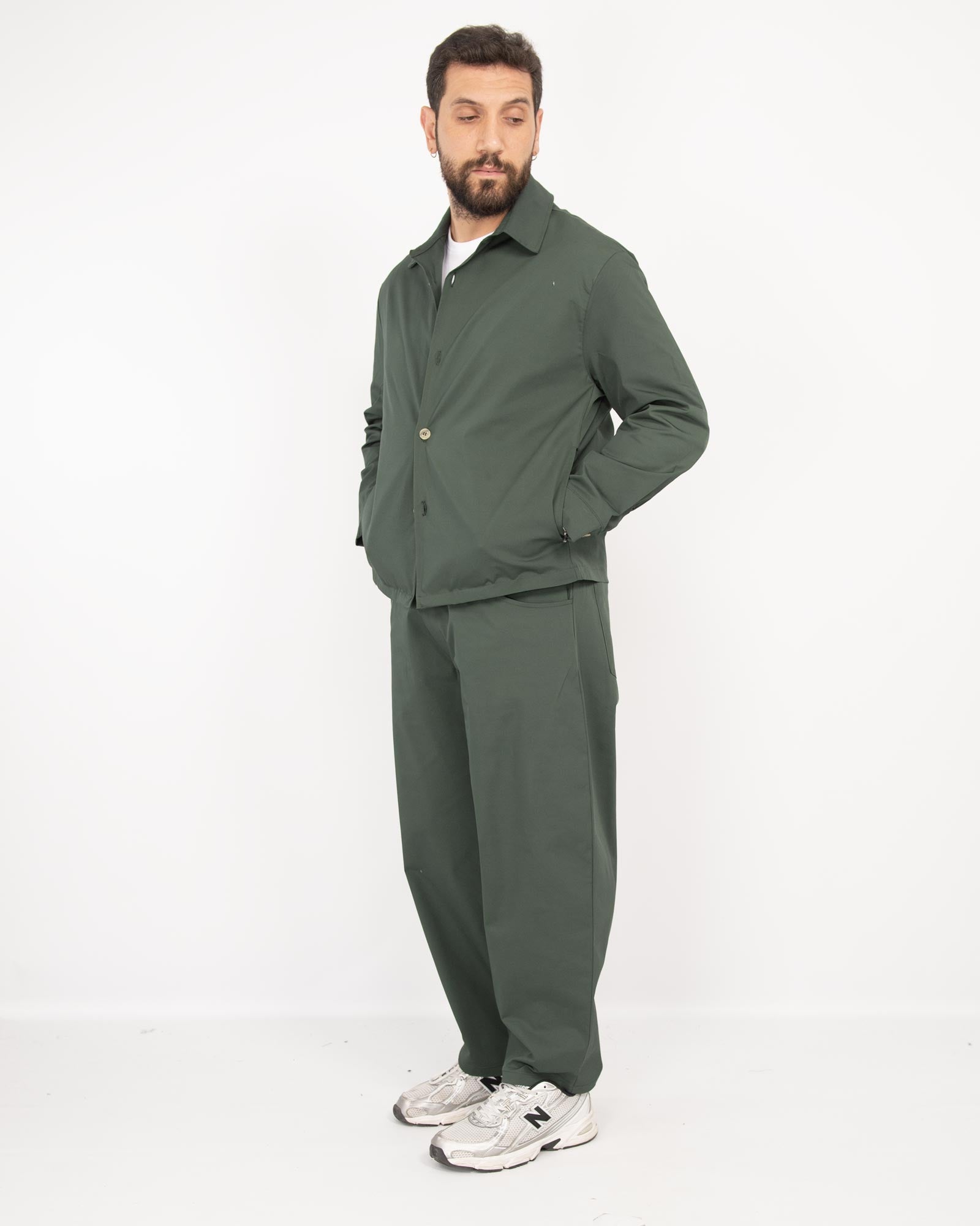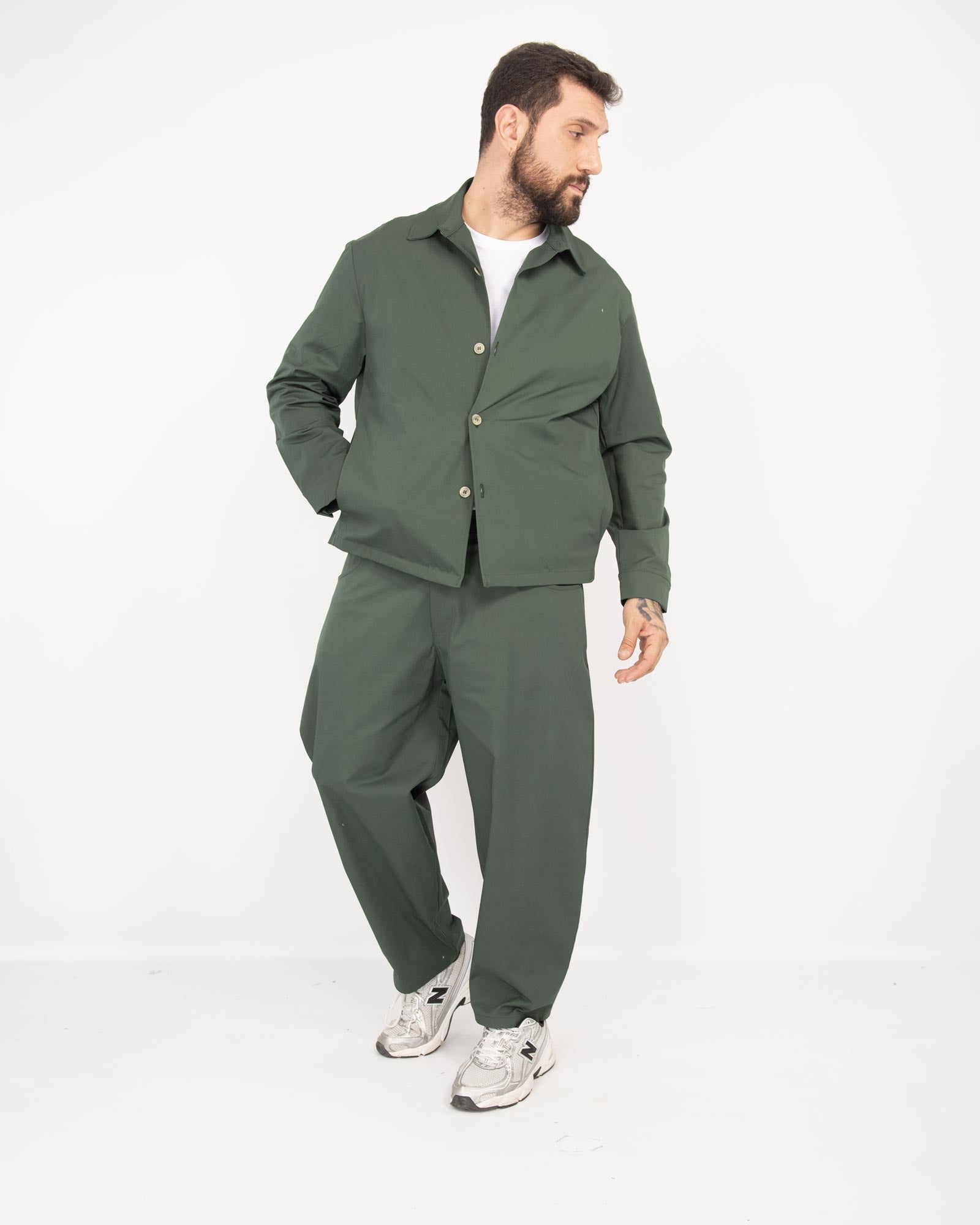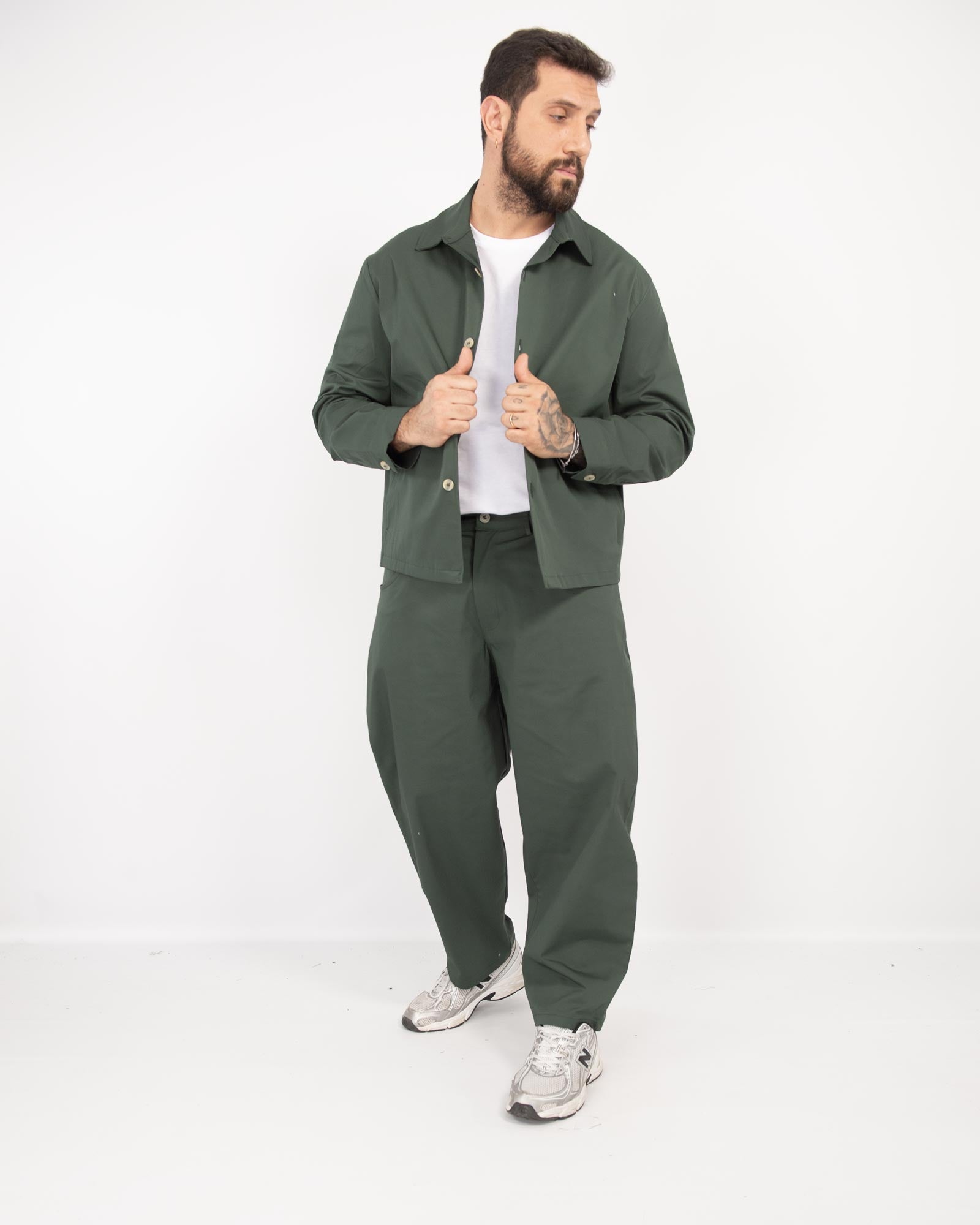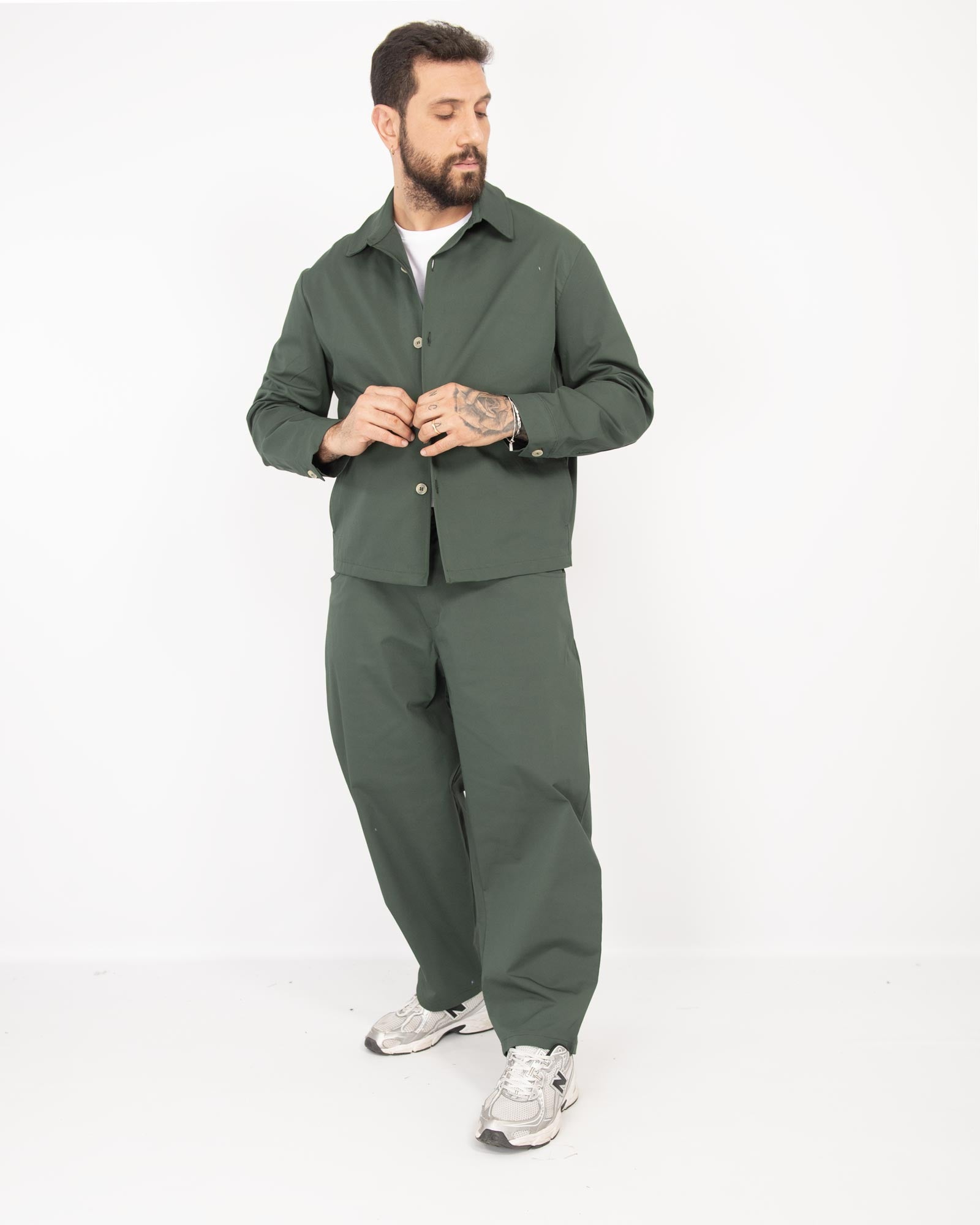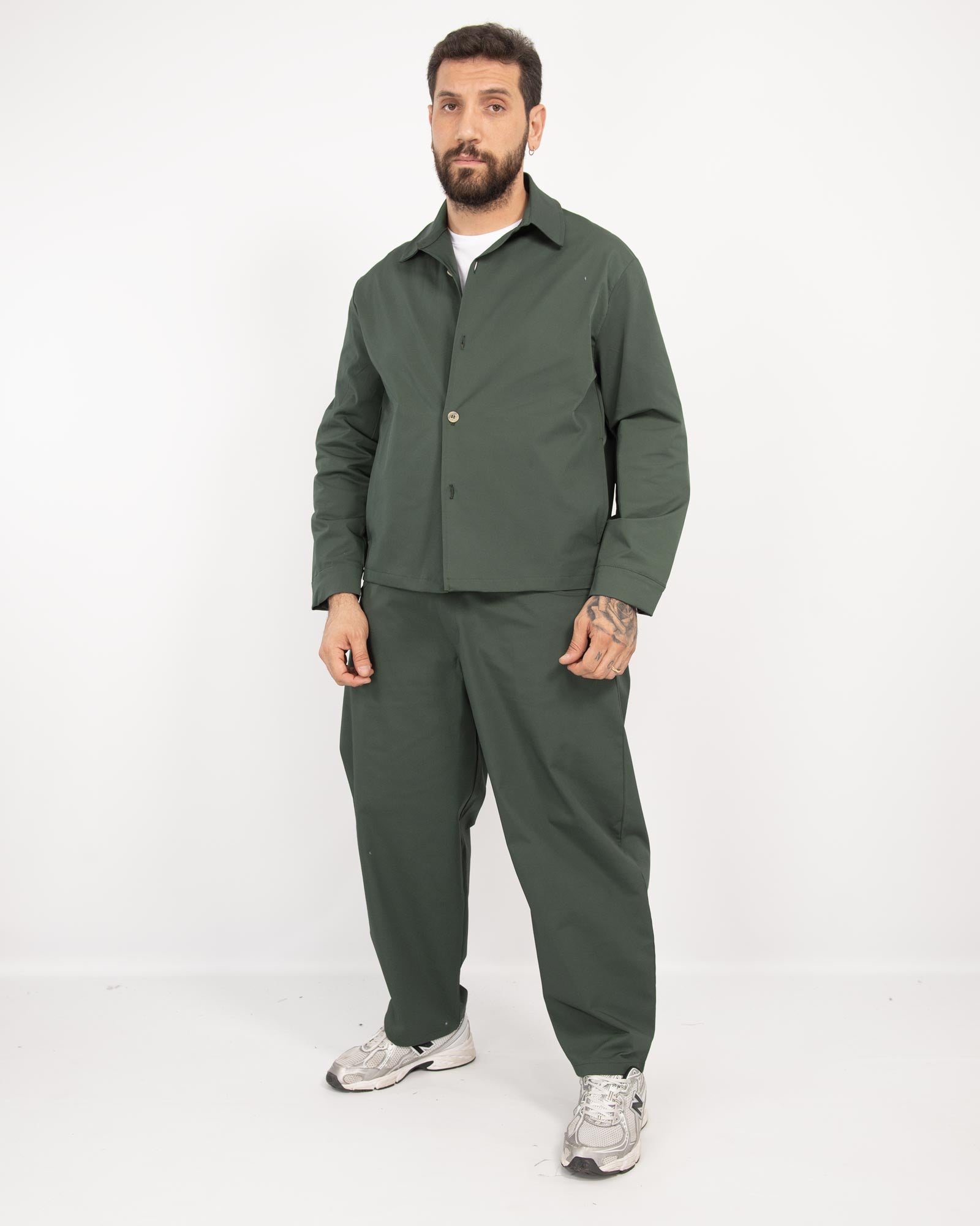 Coordinato balloon fit in gabardine 100% cotone, composto da giacca camicia boxy fit con tasche laterali e pantalone balloon fit con vita caratterizzata da elastico sul retro. In foto è indossata la taglia XL per altezza 1.85cm e peso 97kg.