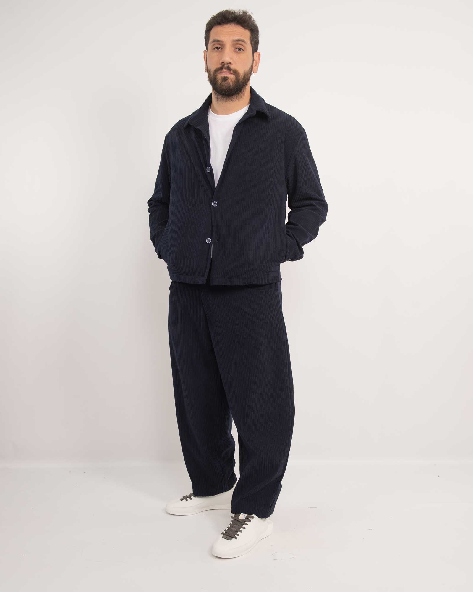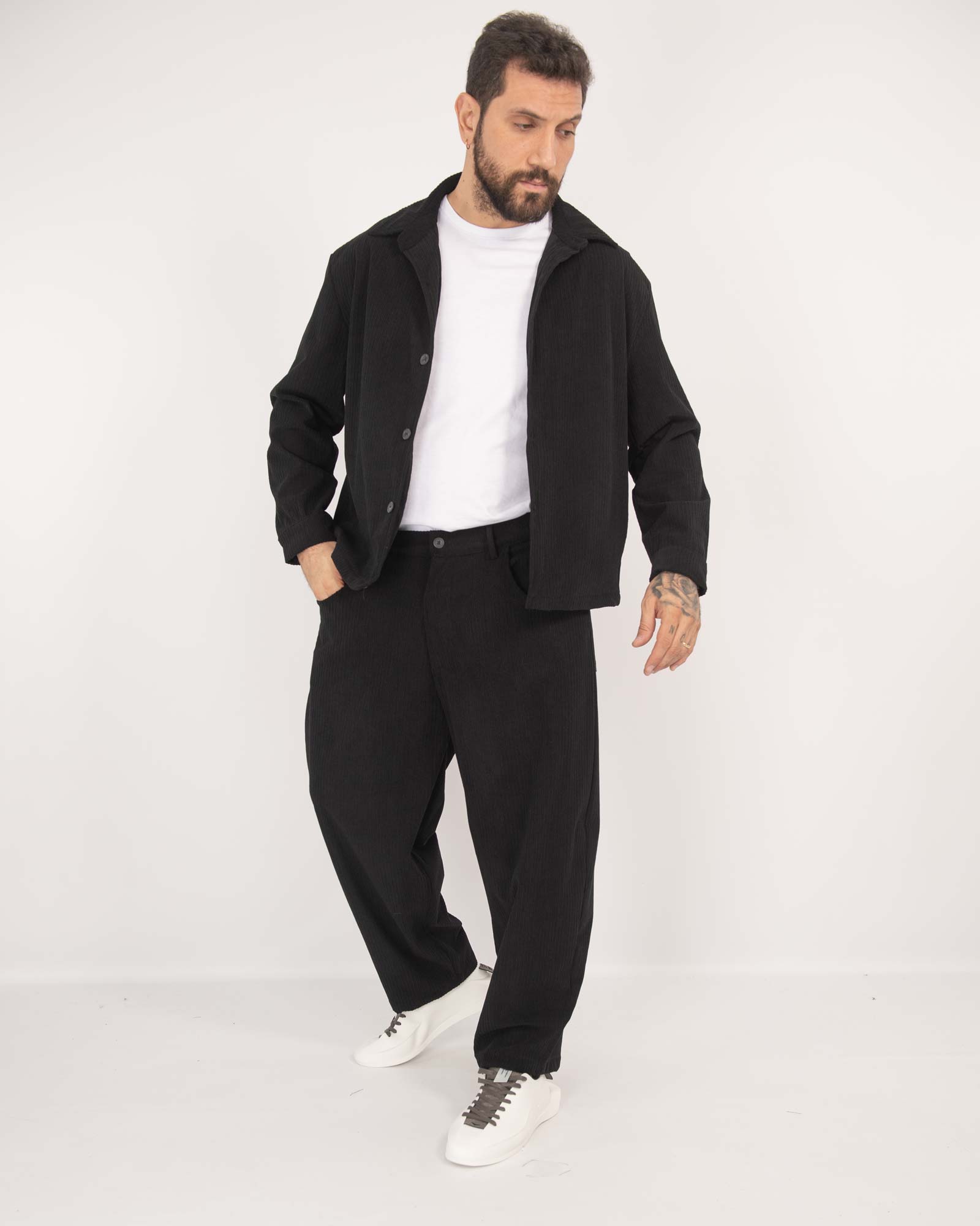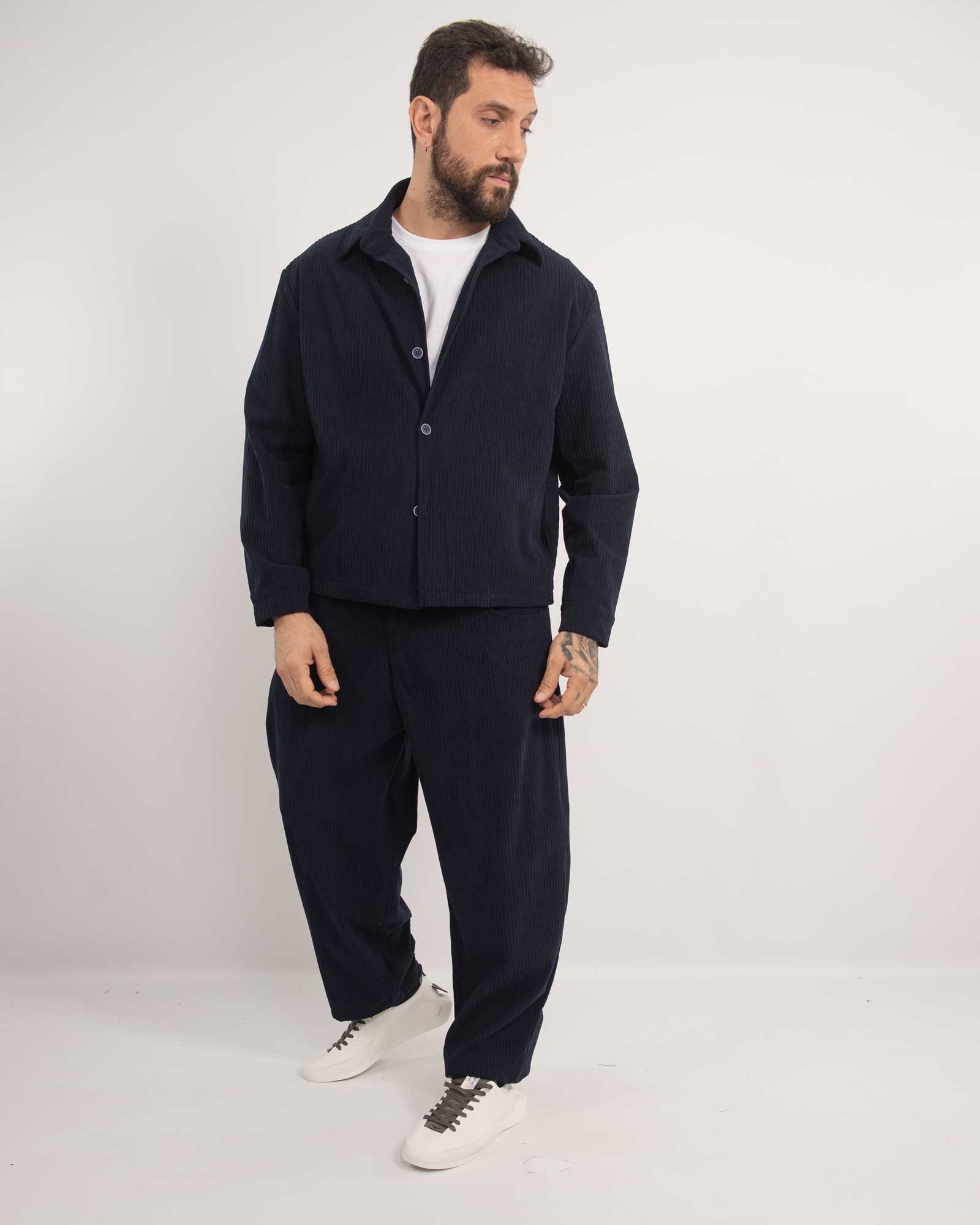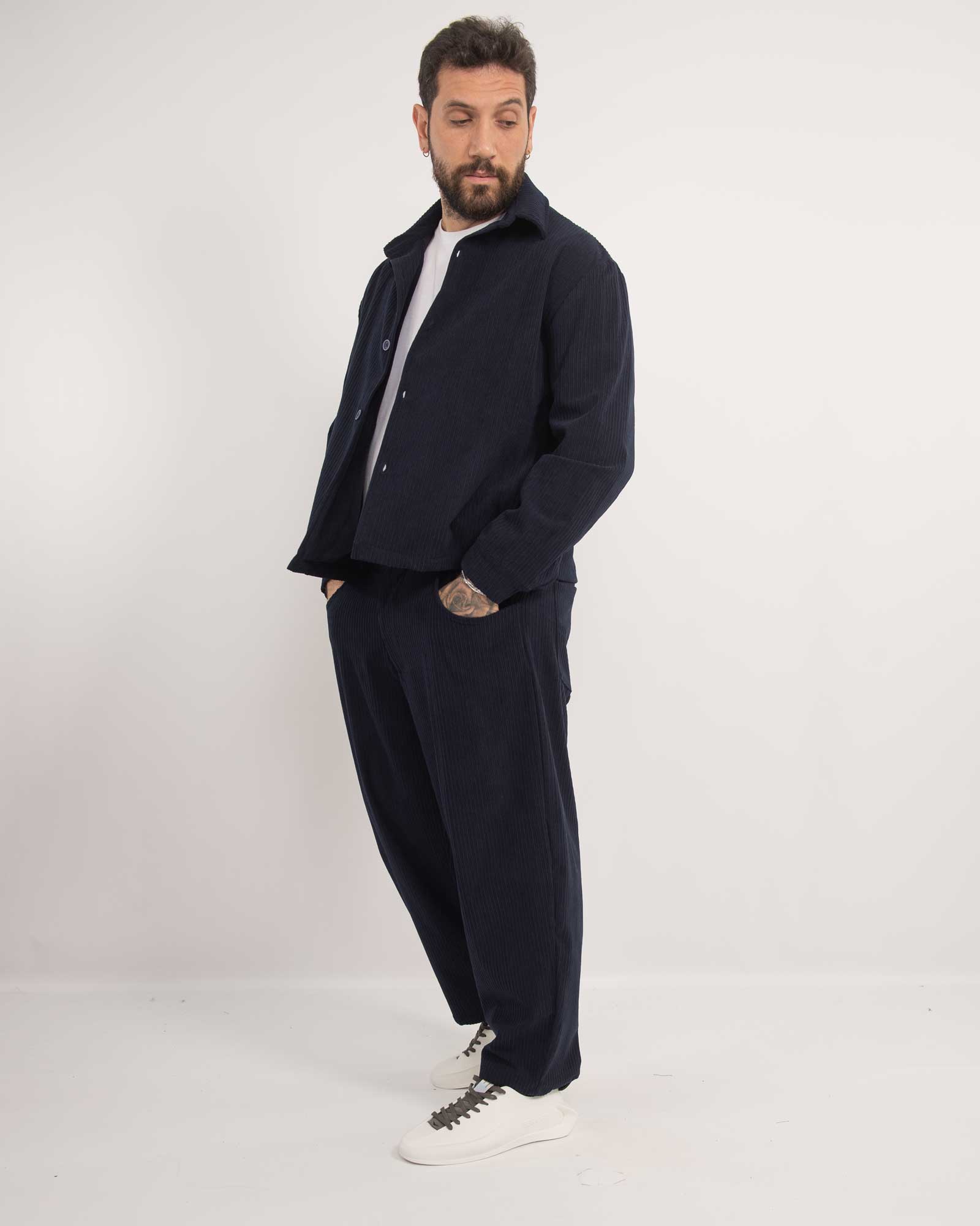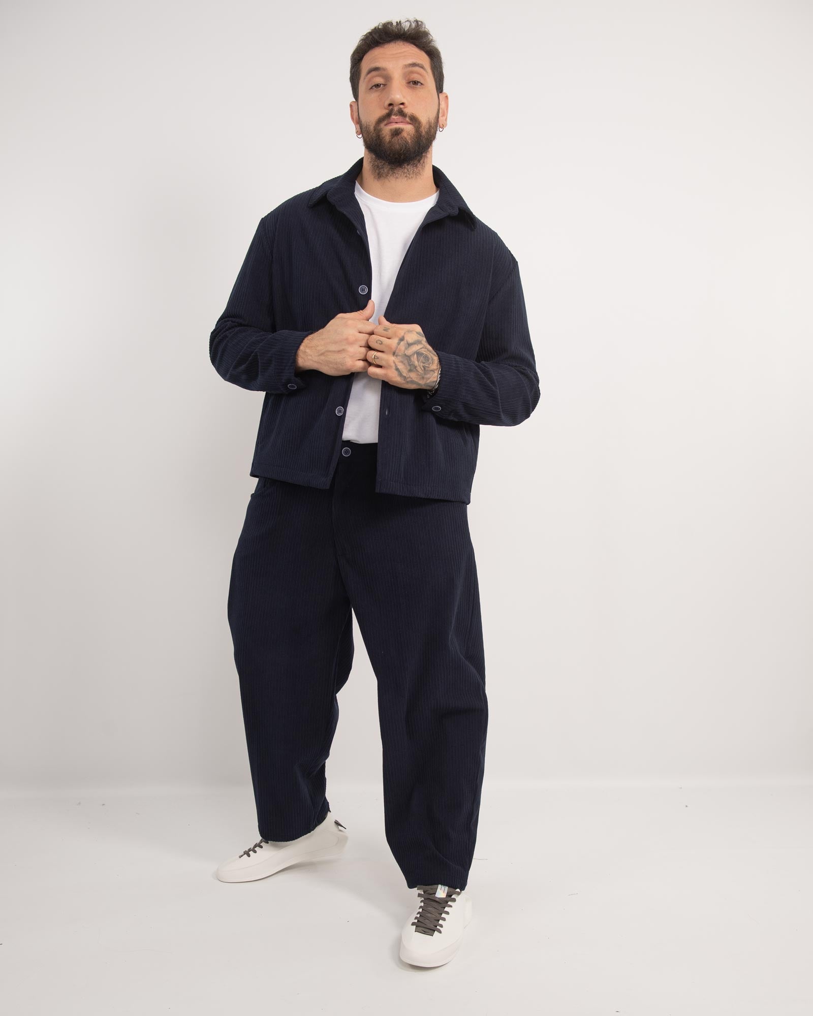Coordinato balloon fit in velluto 100% cotone, composto da giacca camicia boxy fit con tasche laterali e pantalone balloon fit con vita caratterizzata da elastico sul retro. In foto è indossata la taglia XL per altezza 1.85cm e peso 97kg.