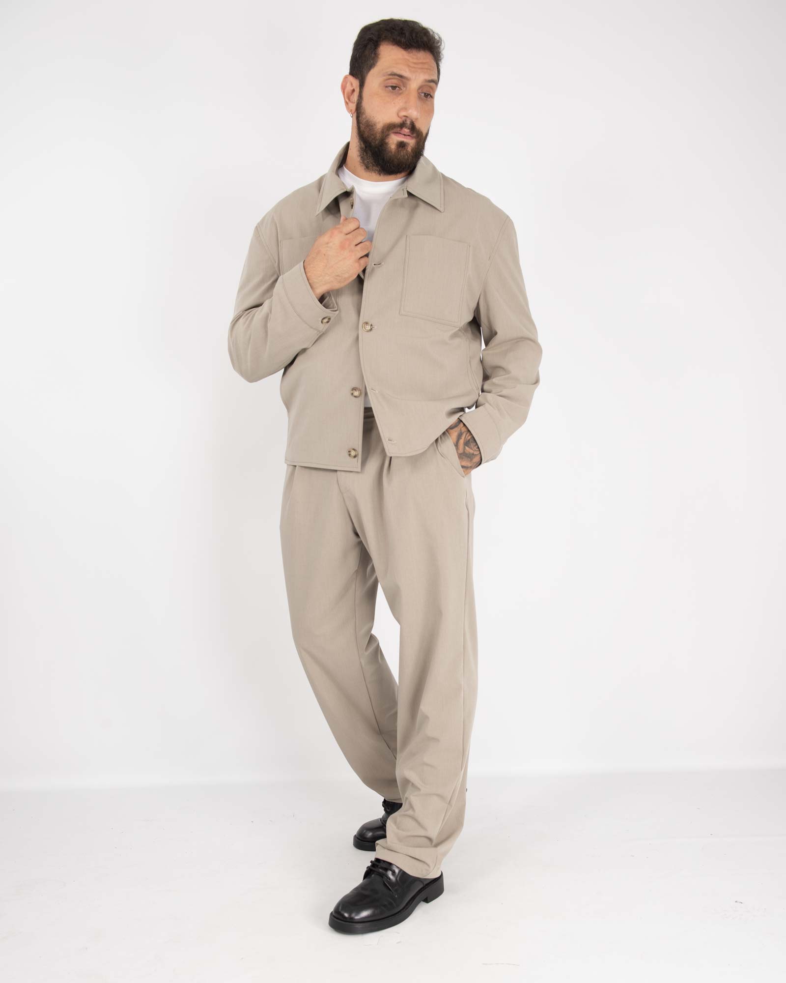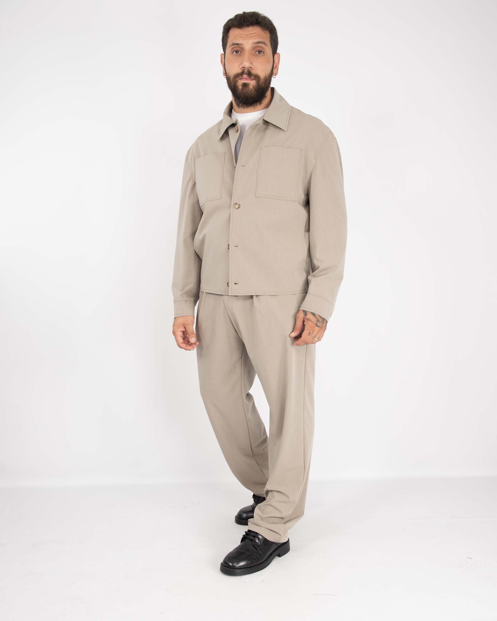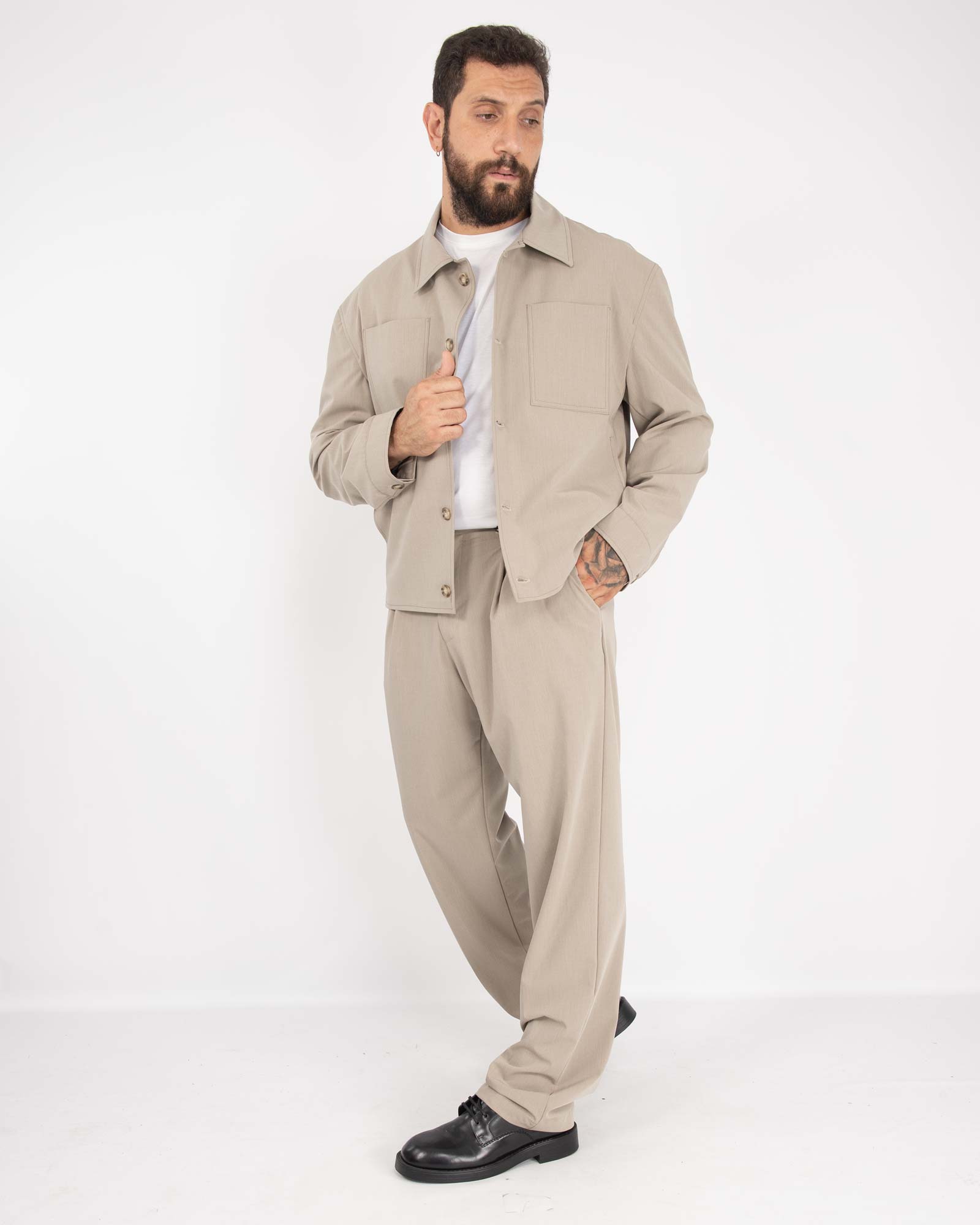 Coordinato composto da pantalone con fondo ampio abbinato alla giacca camicia relaxed fit che presenta maniche lunghe con bottone sul polsino e tasconi altezza petto. In foto vediamo indossata taglia 54 per la camicia e la 56 per il pantalone per altezza 1,85cm e peso 97kg.