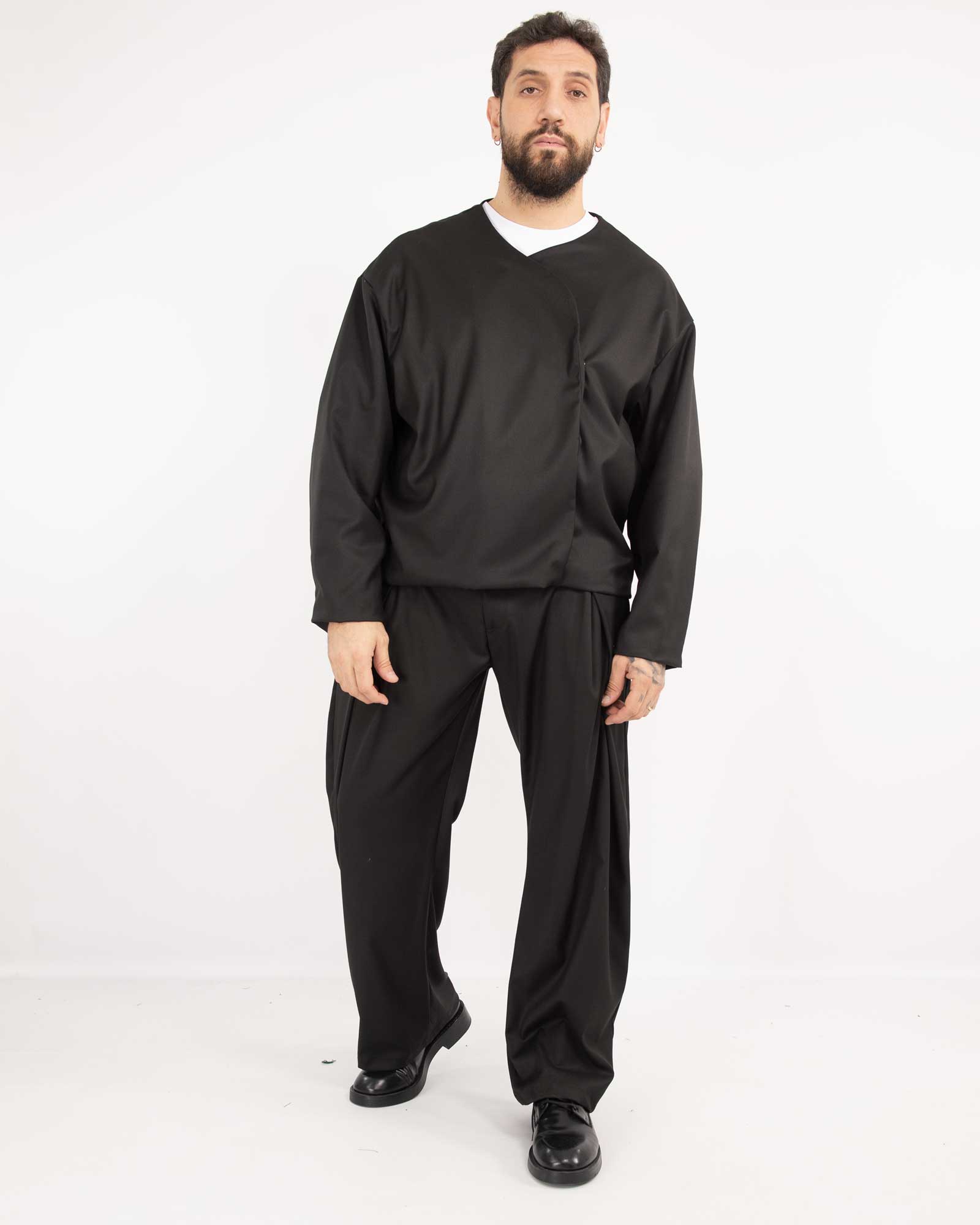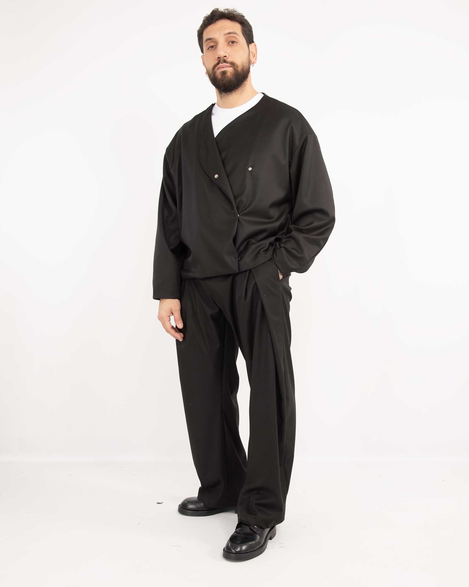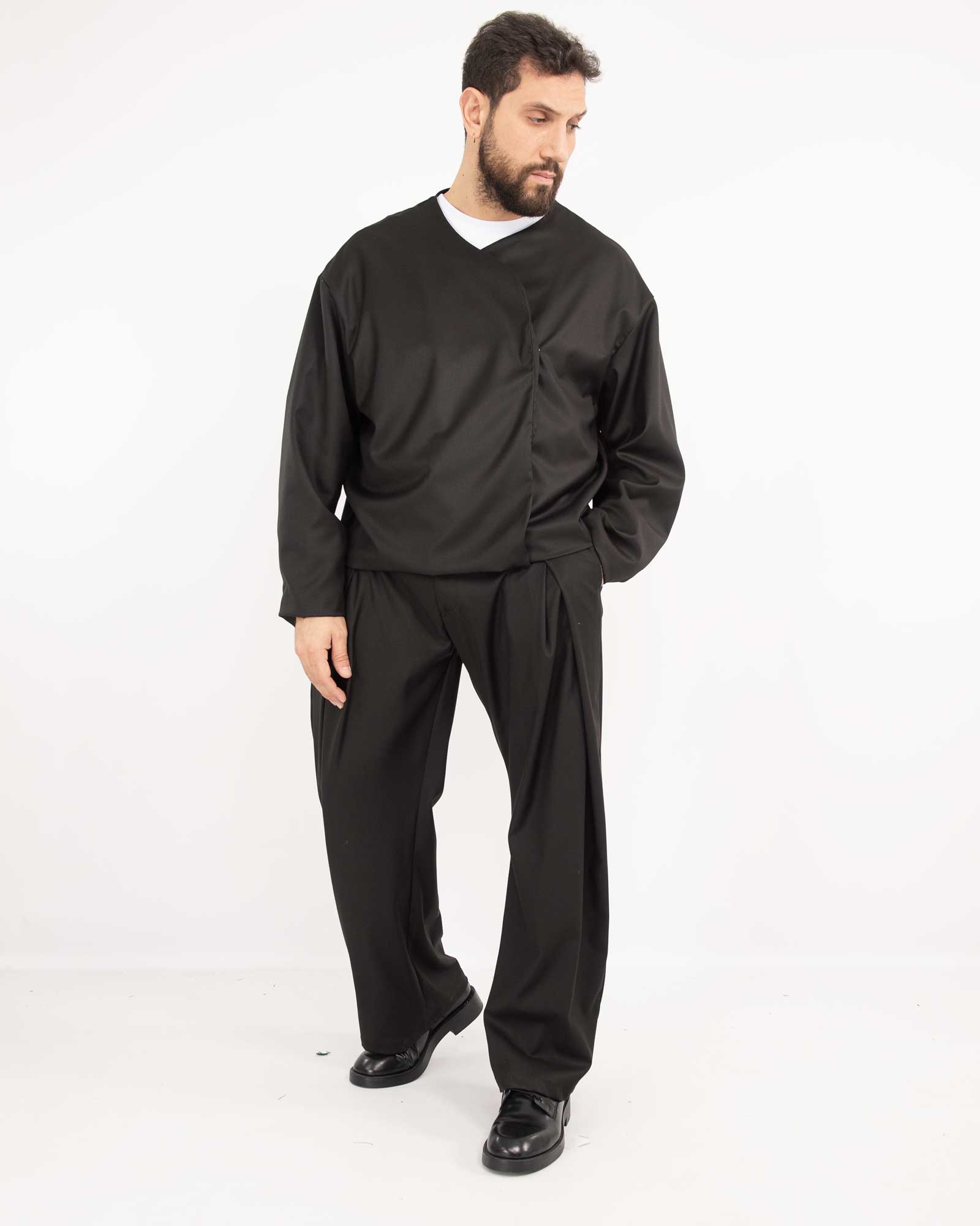 Coordinato in tessuto misto viscosca 55% poliestere e 45% viscosa, morbido e fluido. Composto da giacca con abbottonatura a scomparsa con bottone a clip e pantalone caratterizzato da pinces profonda e abbottonatura con bottone e cerniera e elastico sul retro. In foto la giacca è indossata in taglia XL, mentre il pantalone in taglia XXL. Il modello è alto 1,85 m e pesa 97 kg.