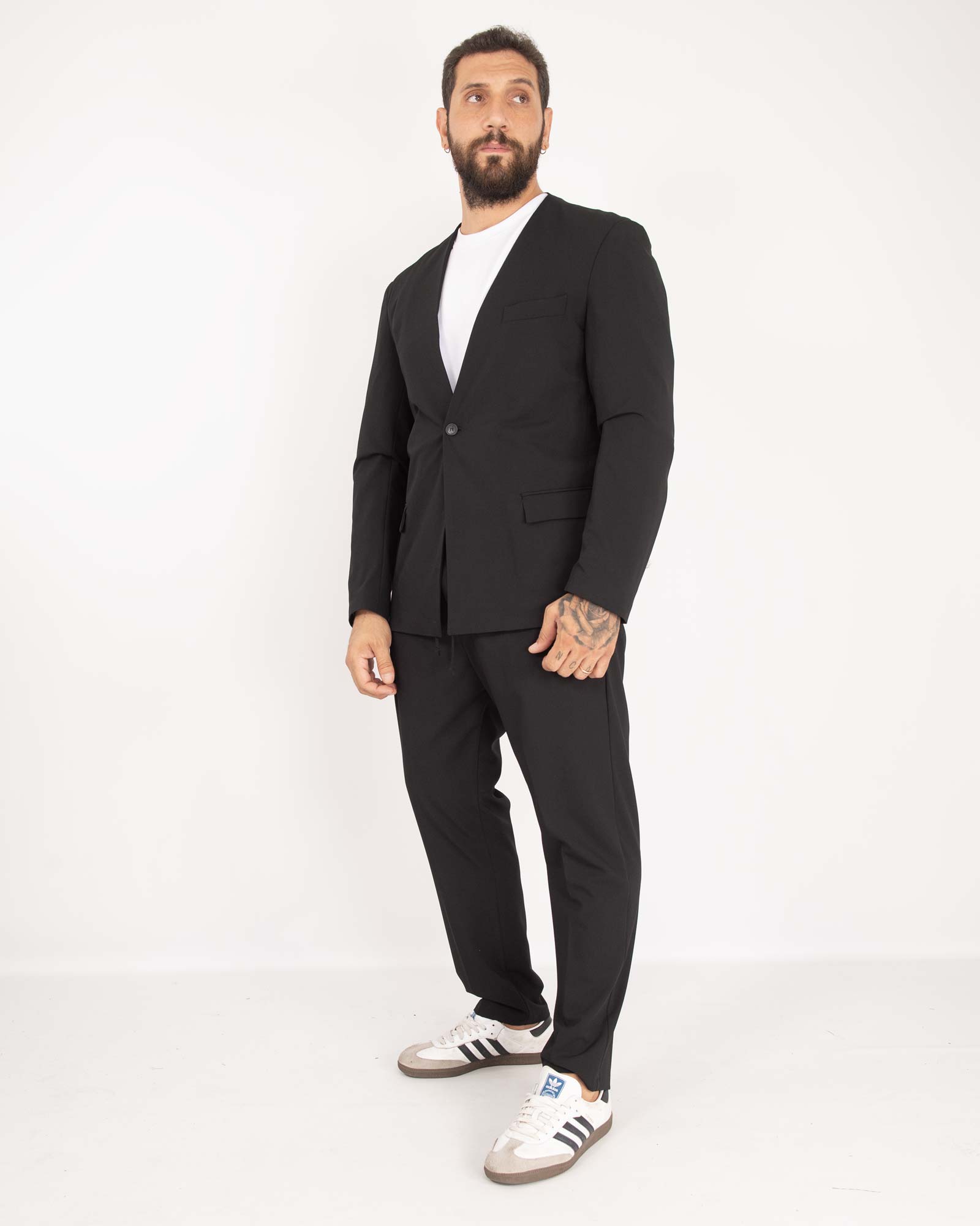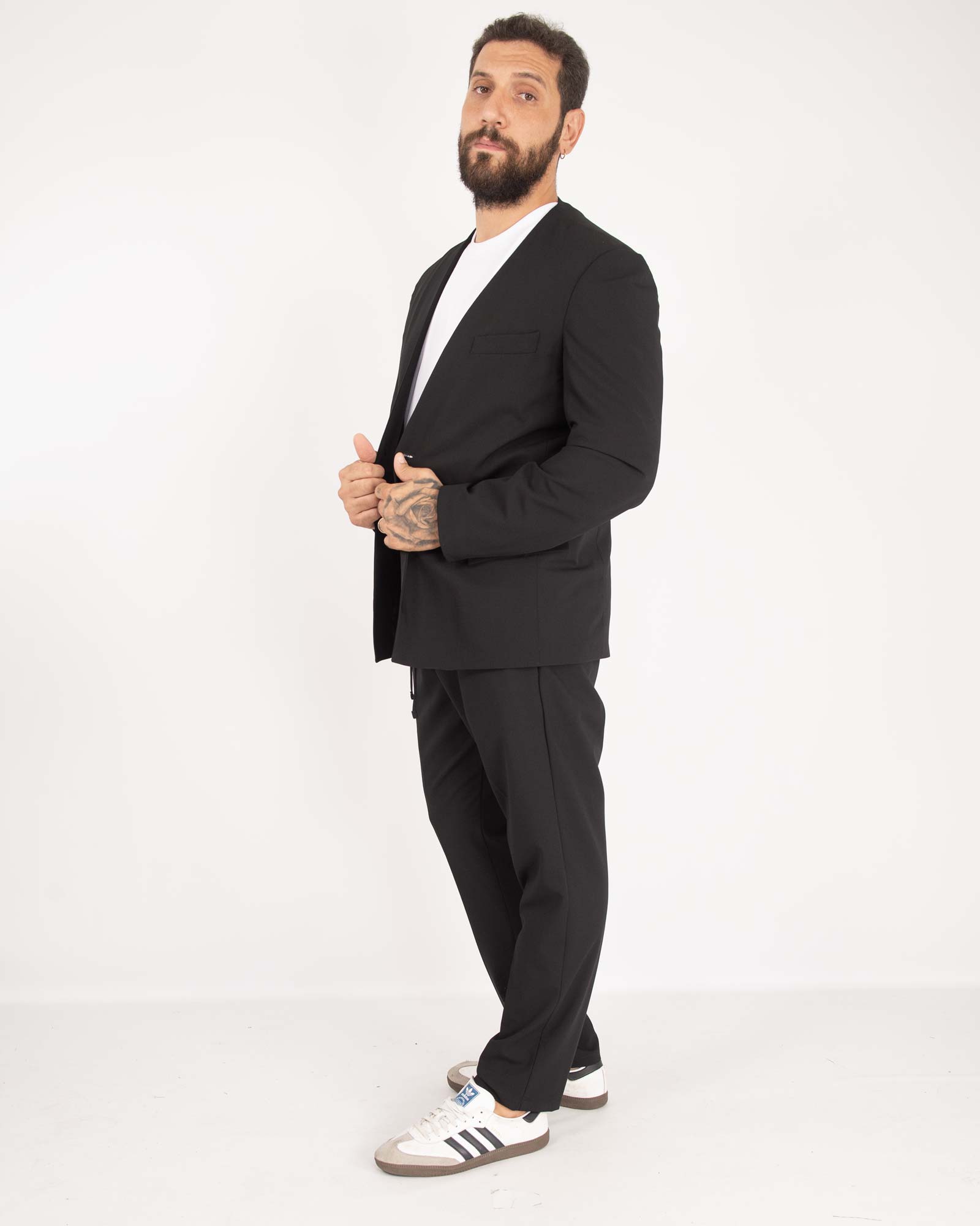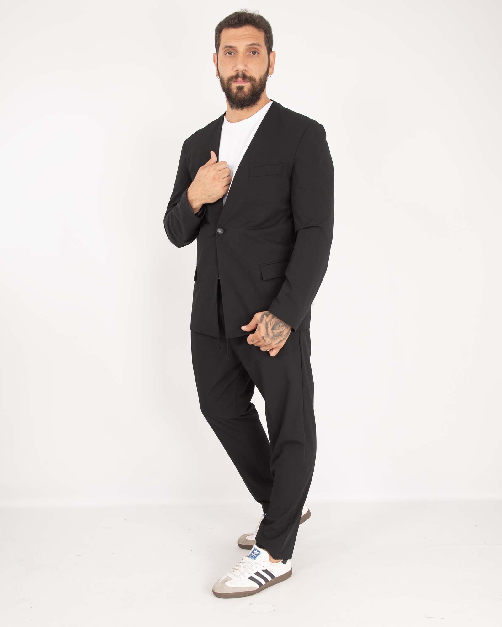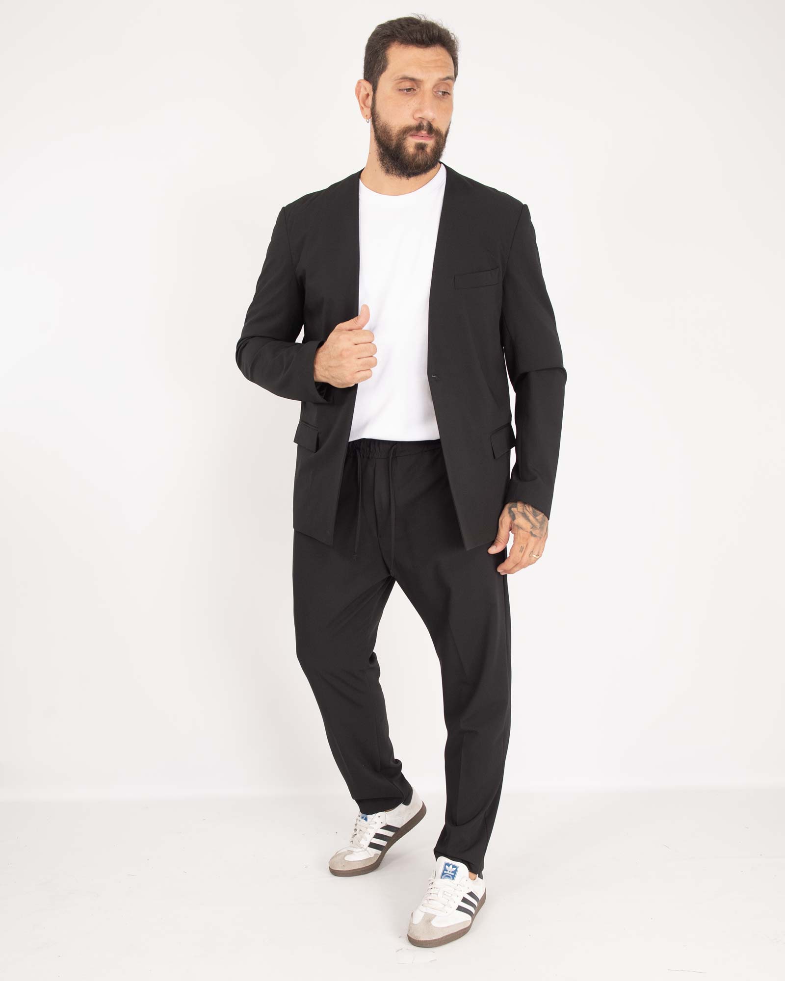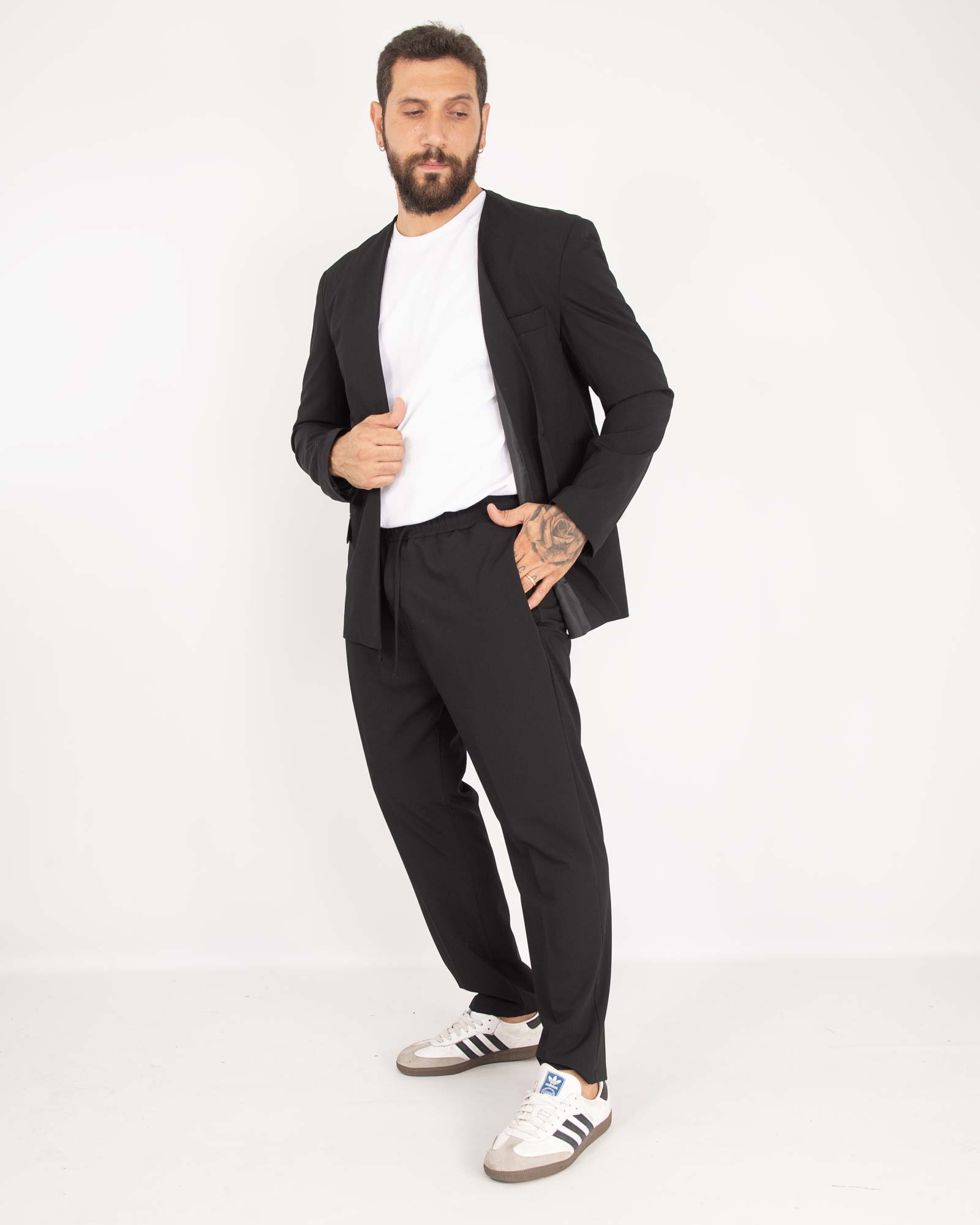 Abito coordinato composto da pantalaccio con vita regolabile da coulisse con fondo stretto abbinato ala giacca foderata con senza revers con spalline e maniche lunghe. In foto vediamo indossata taglia XL per la giacca e la XXL per il pantalaccio per altezza 1,85cm e peso 97kg.