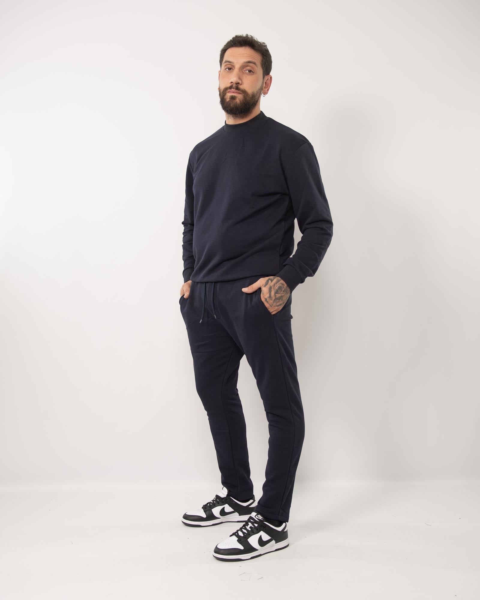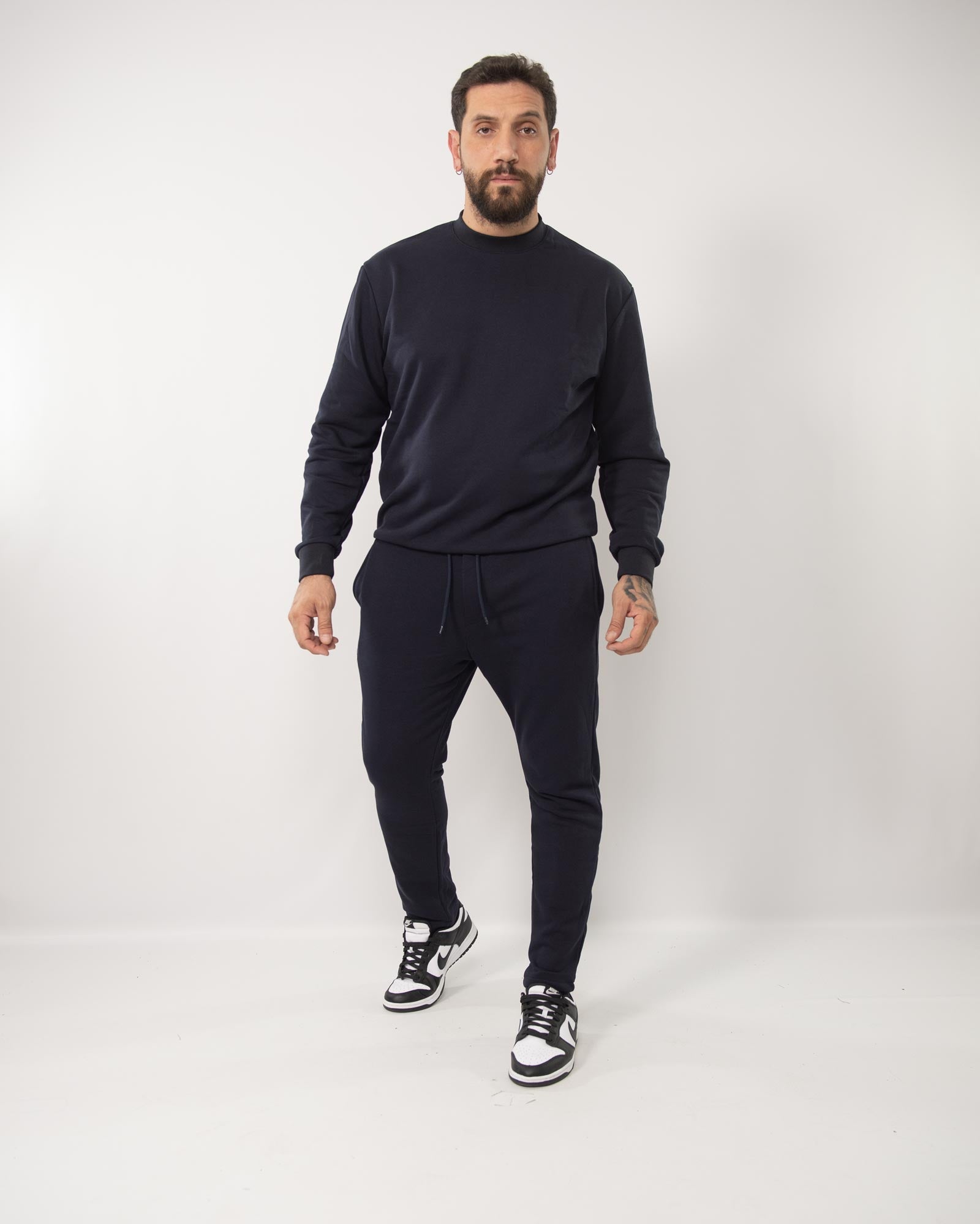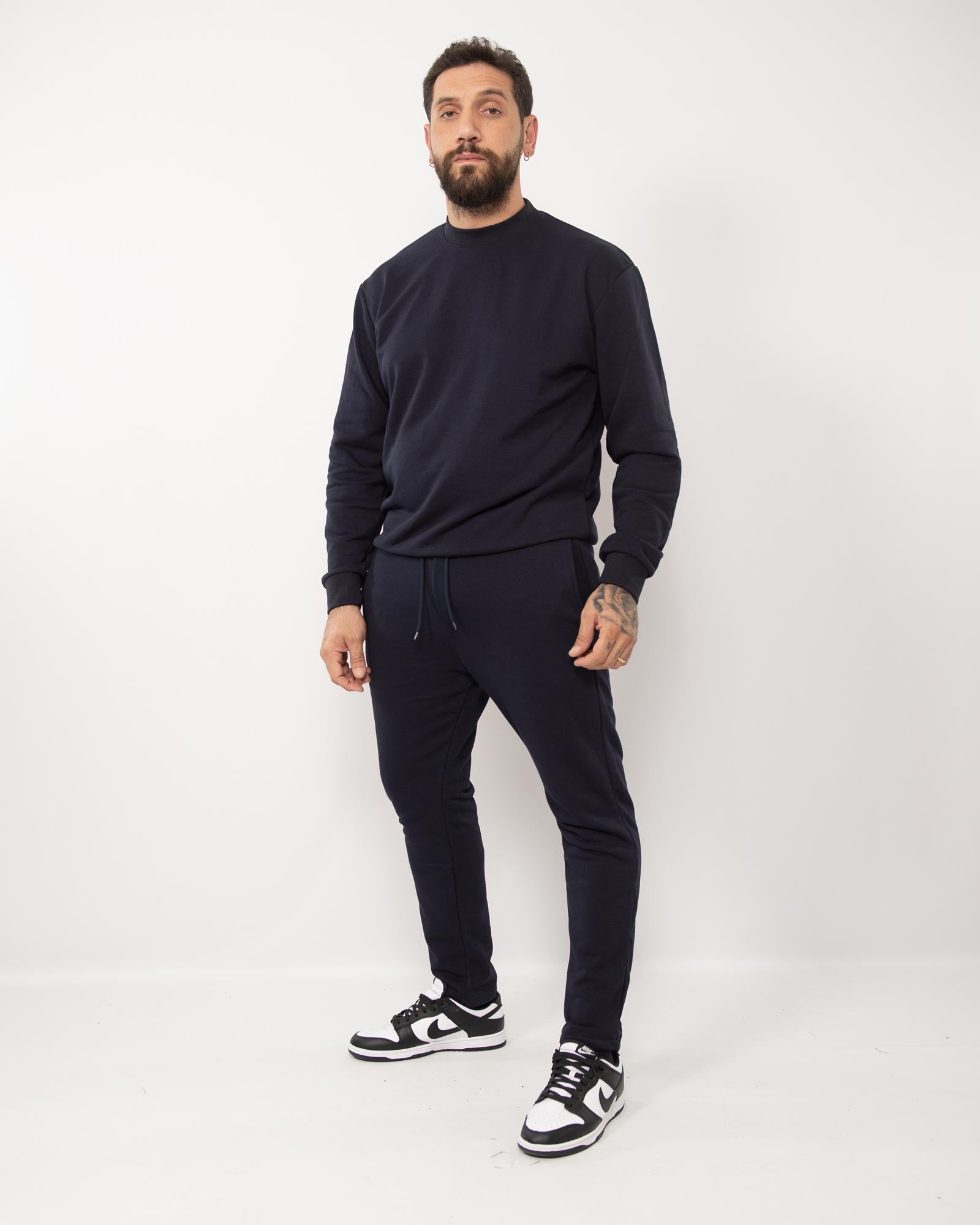 Coordinato tuta basic composto da felpa girocollo regular fit e pantalone tuta con vita elasticizzata con coulisse regolabile e fondo stretto. In foto è indossata la taglia XL per altezza 1,85cm e peso 97kg.