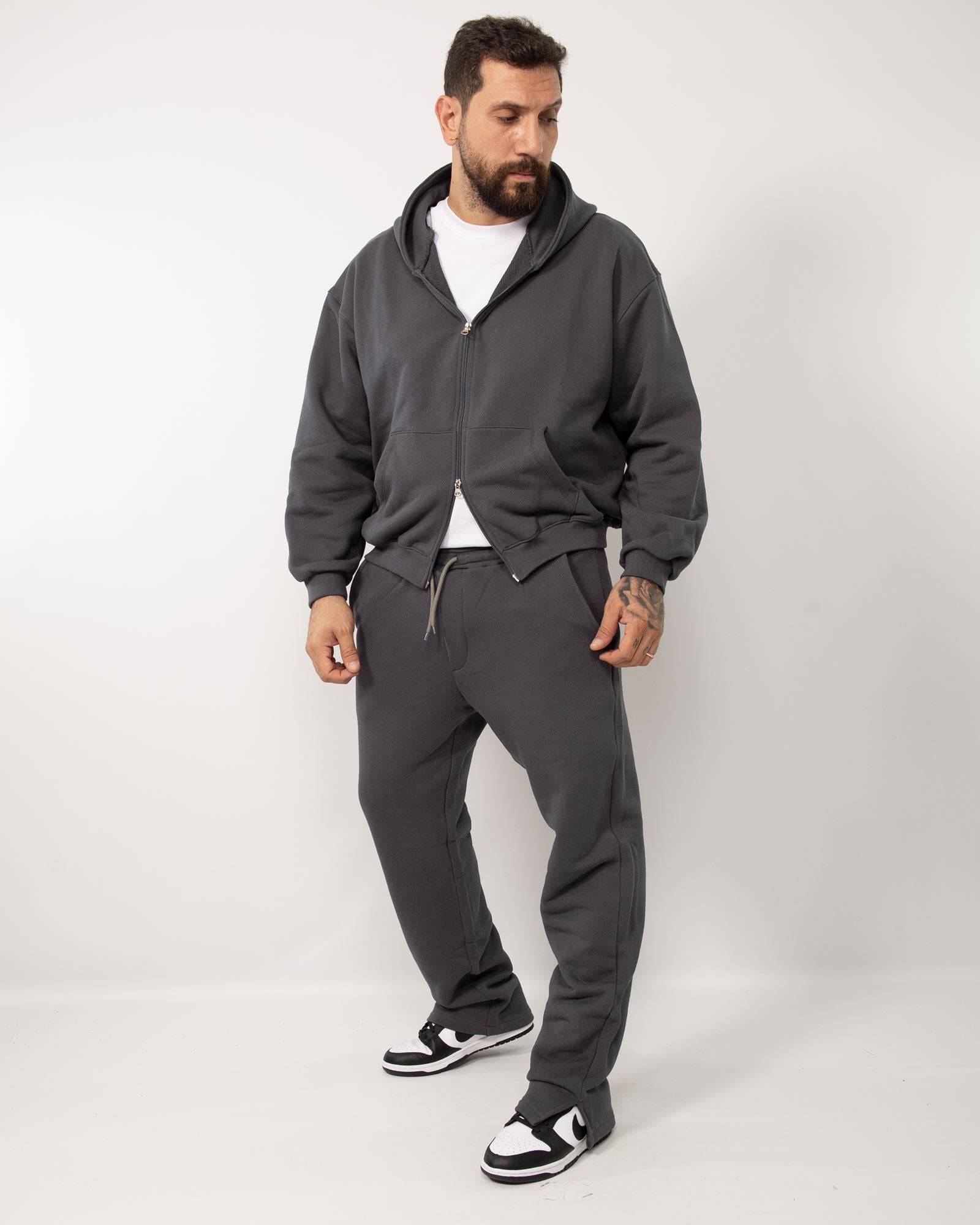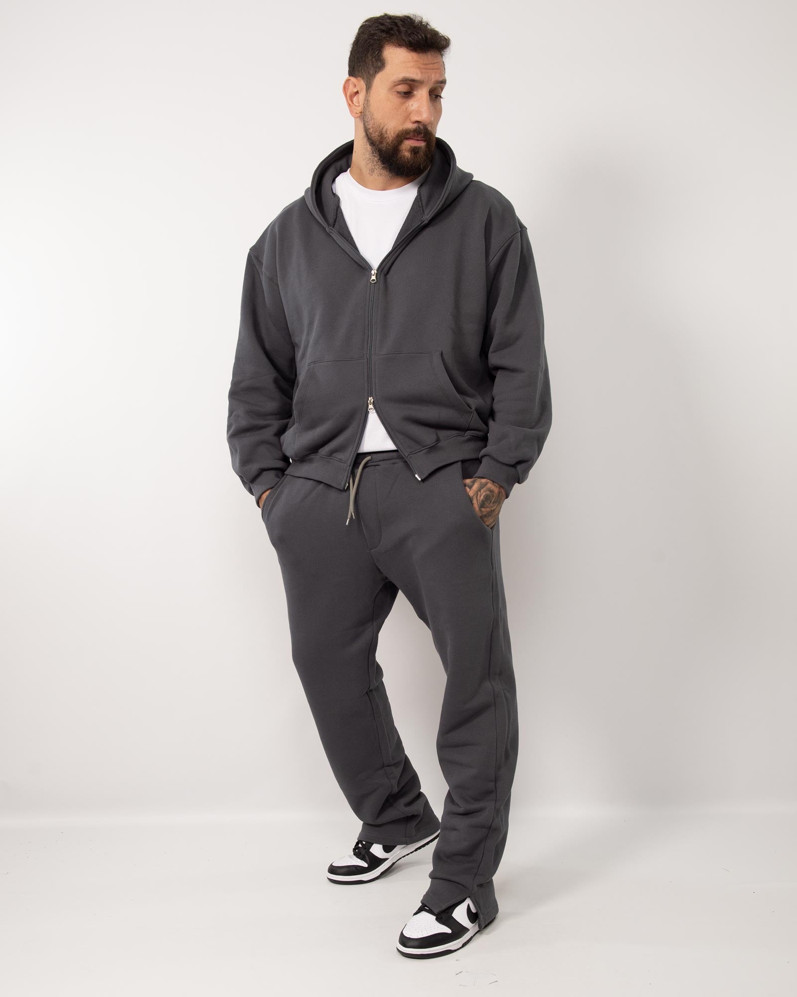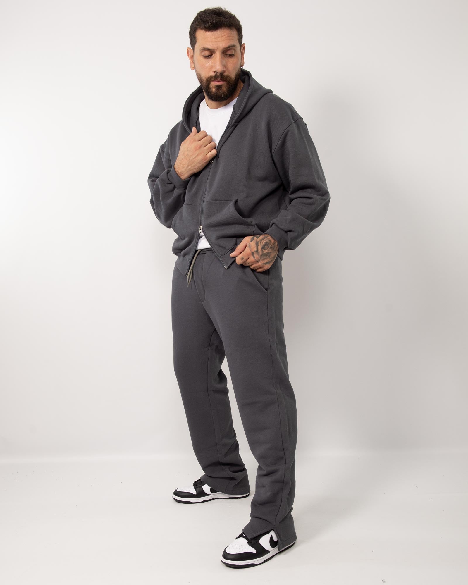 Coordinato tuta composto da felpa con cappuccio cropped in cotone con zip doppio cursore e maniche lunghe abbinata al pantatuta fondo largo con vita regolabile con coulisse. In foto è indossata la taglia XL per altezza 1.85cm e peso 97kg.