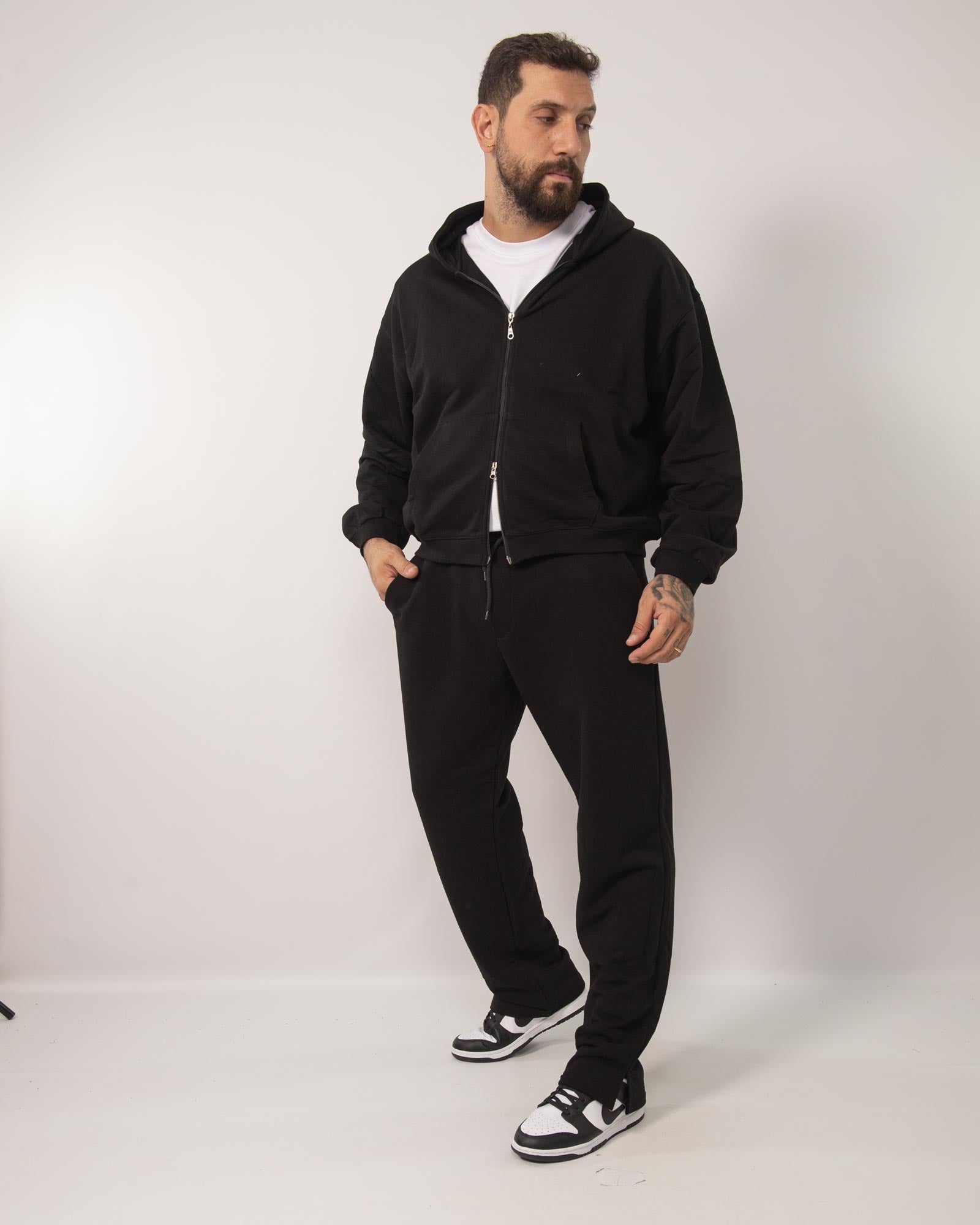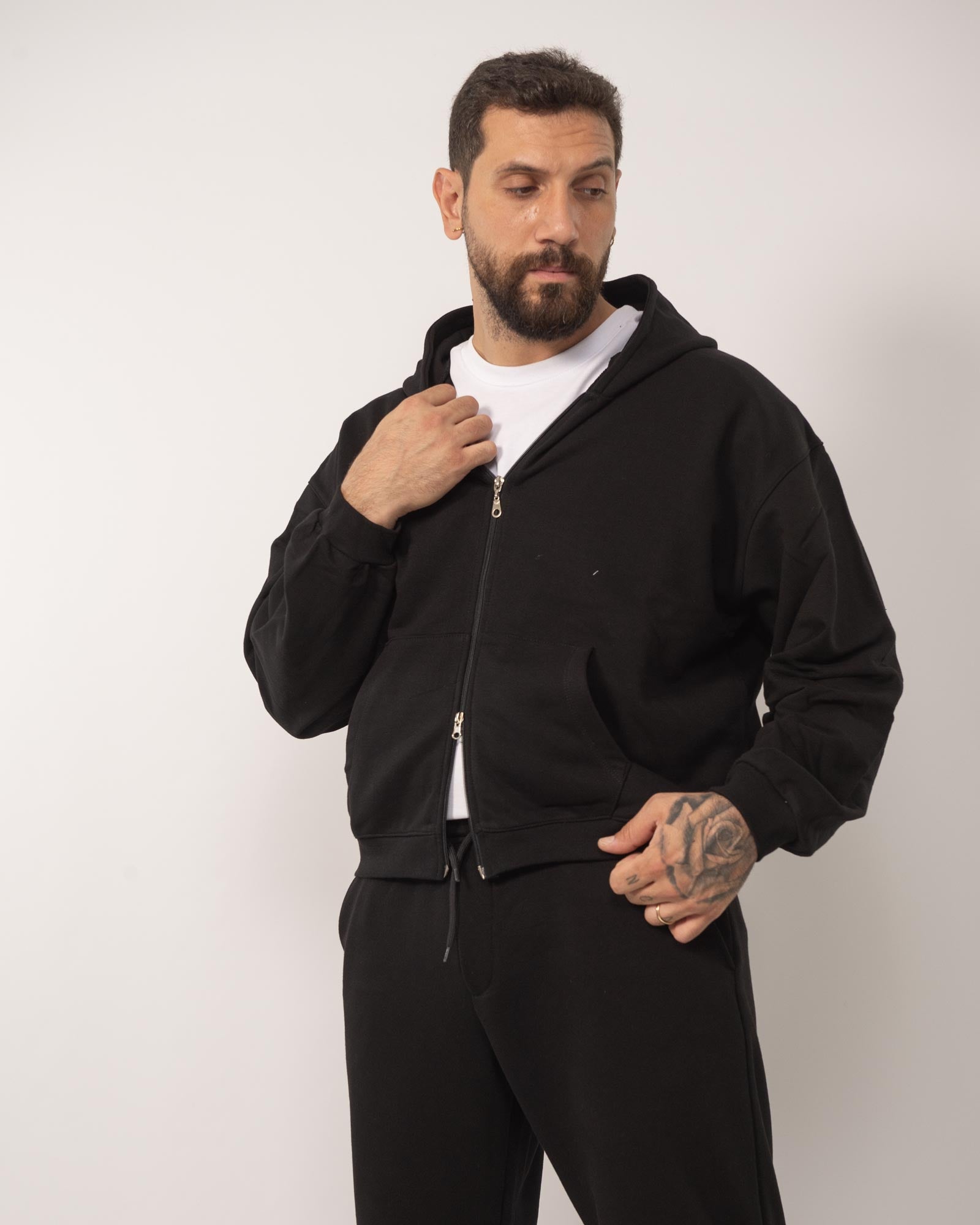 Coordinato tuta composto da felpa con cappuccio cropped in cotone con zip doppio cursore e maniche lunghe abbinata al pantatuta fondo largo con vita regolabile con coulisse. In foto è indossata la taglia XL per altezza 1.85cm e peso 97kg.