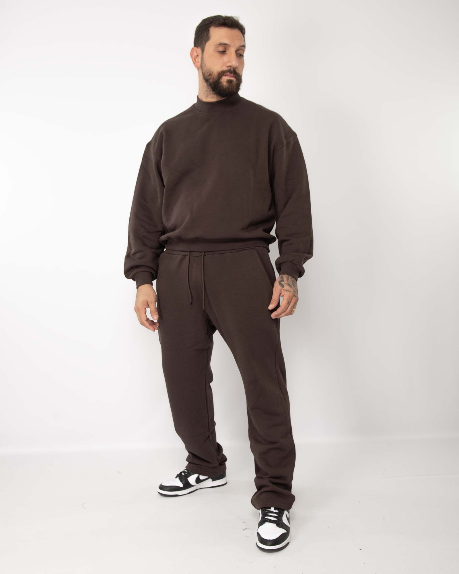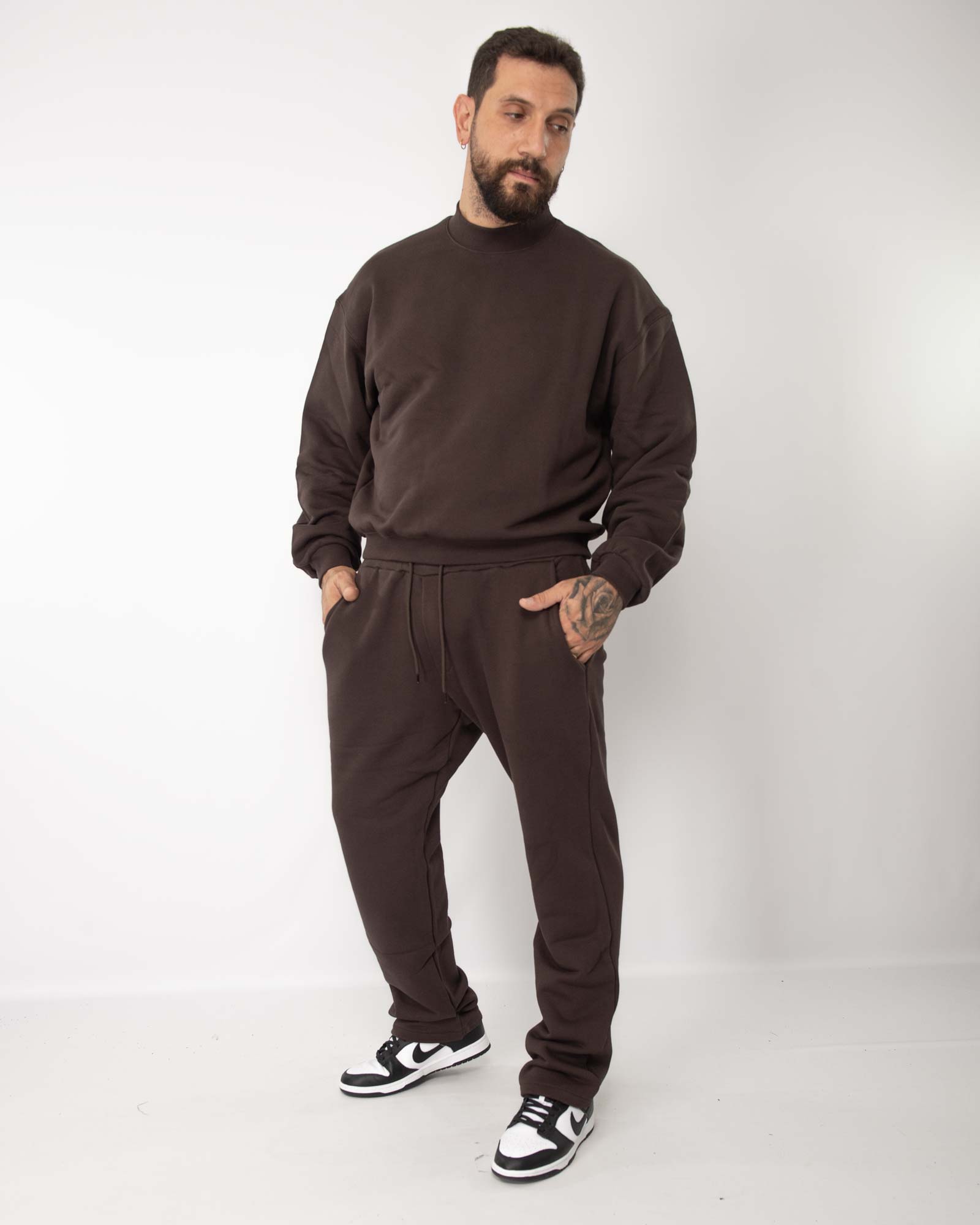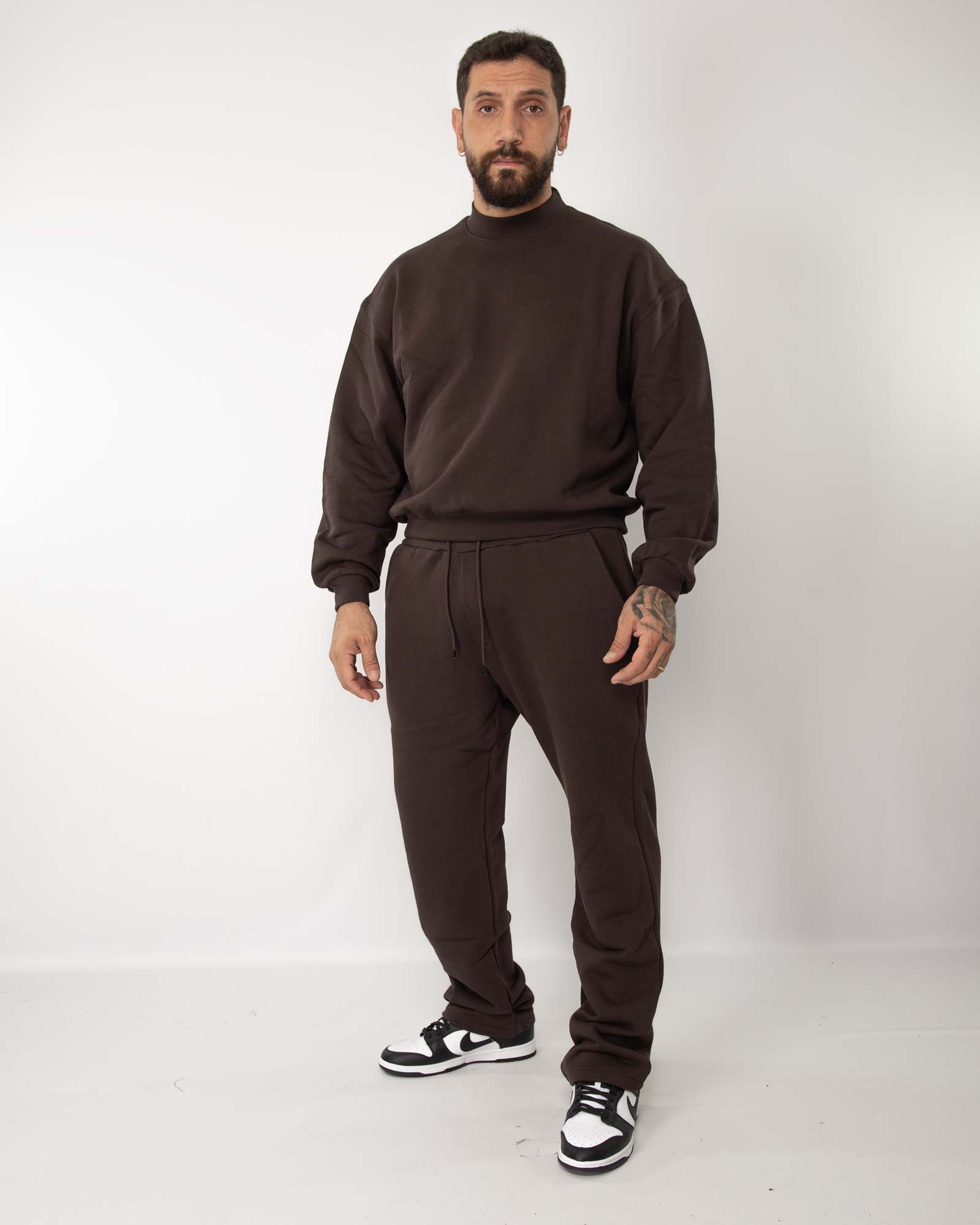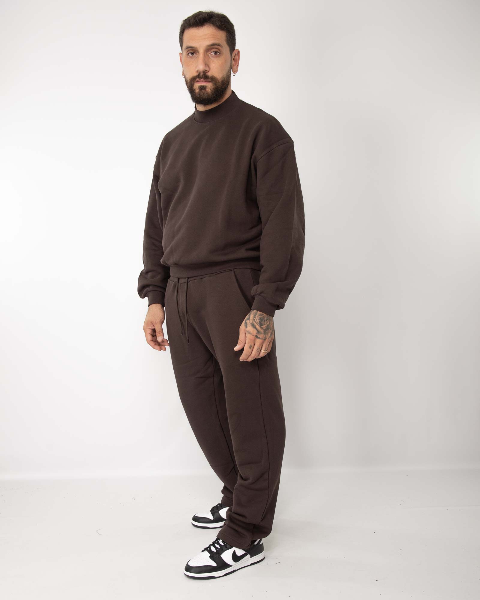 Coordinato tuta composto da felpa girocollo cropped in cotone con maniche lunghe abbinata al pantatuta fondo largo con vita regolabile con coulisse. In foto è indossata la taglia XL per altezza 1.85cm e peso 97kg.