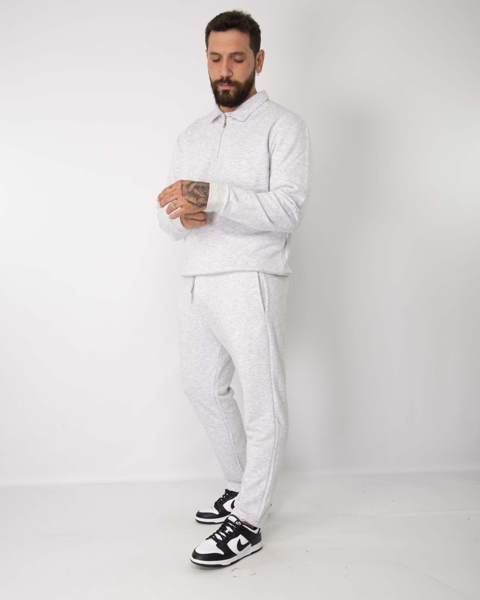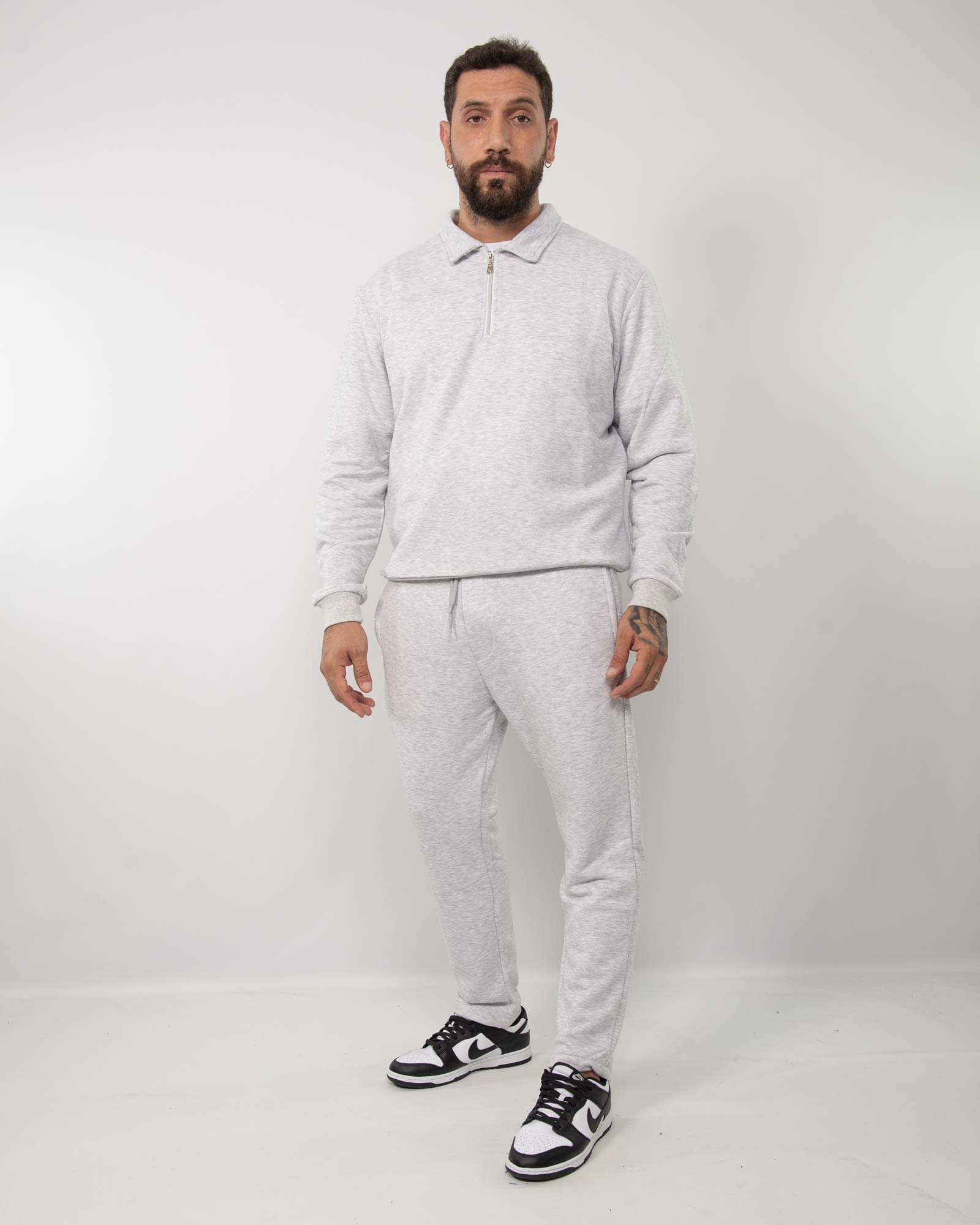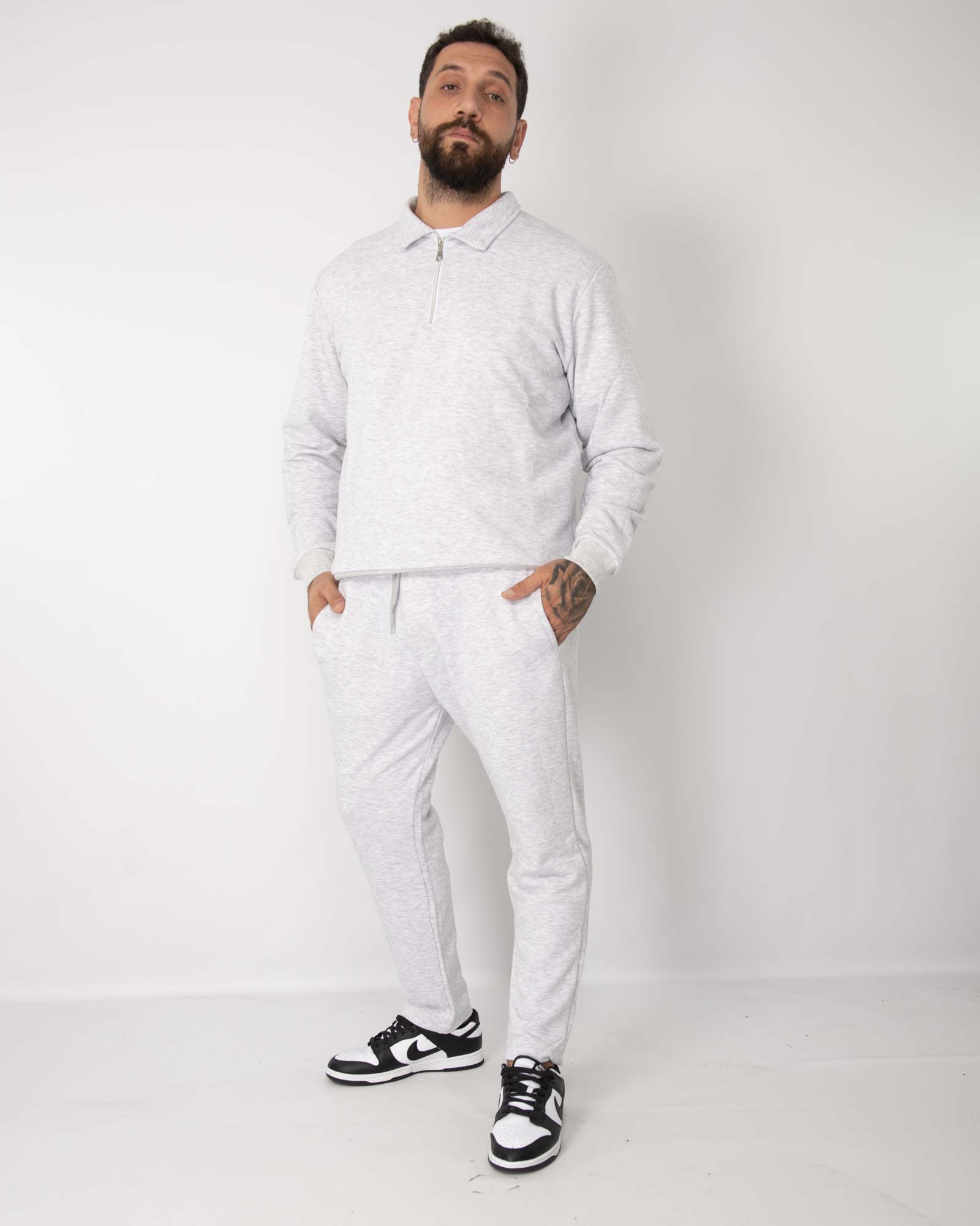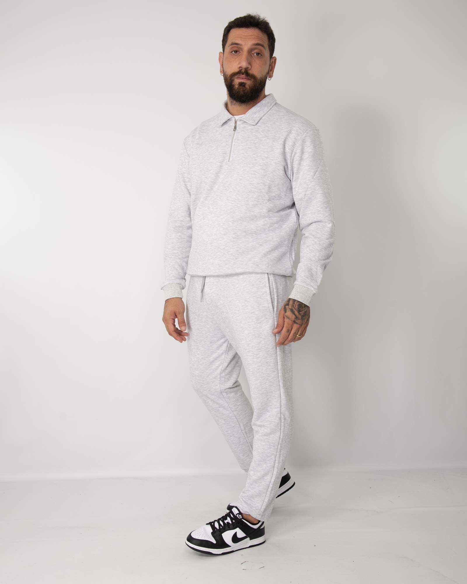 Coordinato tuta composto da felpa modello polo regular fit con maniche lunghe abbinata al pantatuta fondo stretto con vita regolabile con coulisse. In foto è indossata la taglia XL per altezza 1.85cm e peso 97kg