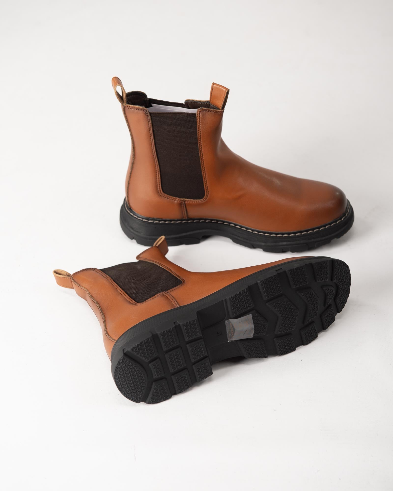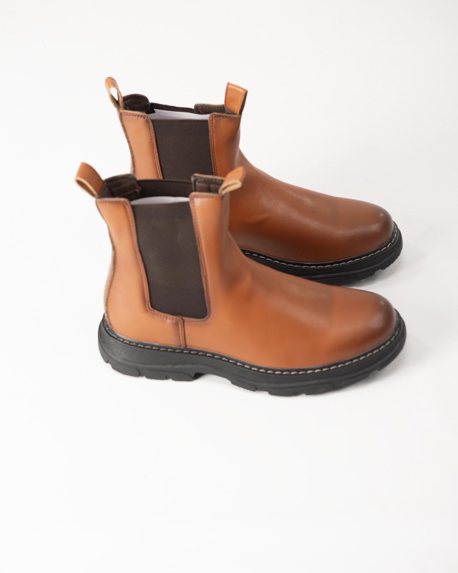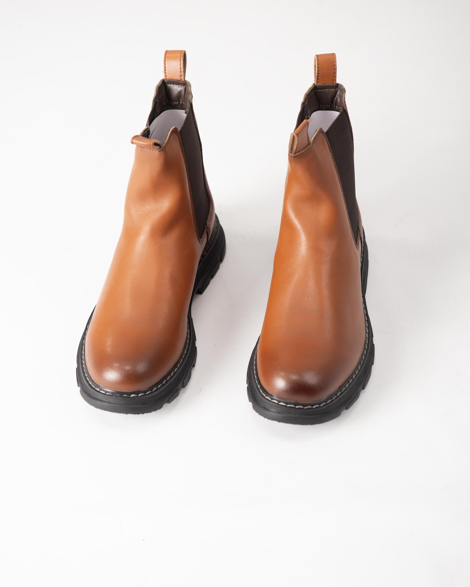 Stivali con tomaia liscia con inserti elastici laterali e tirante posteriore per facilitare la calzata. Forma arrotondata e suola voluminosa.