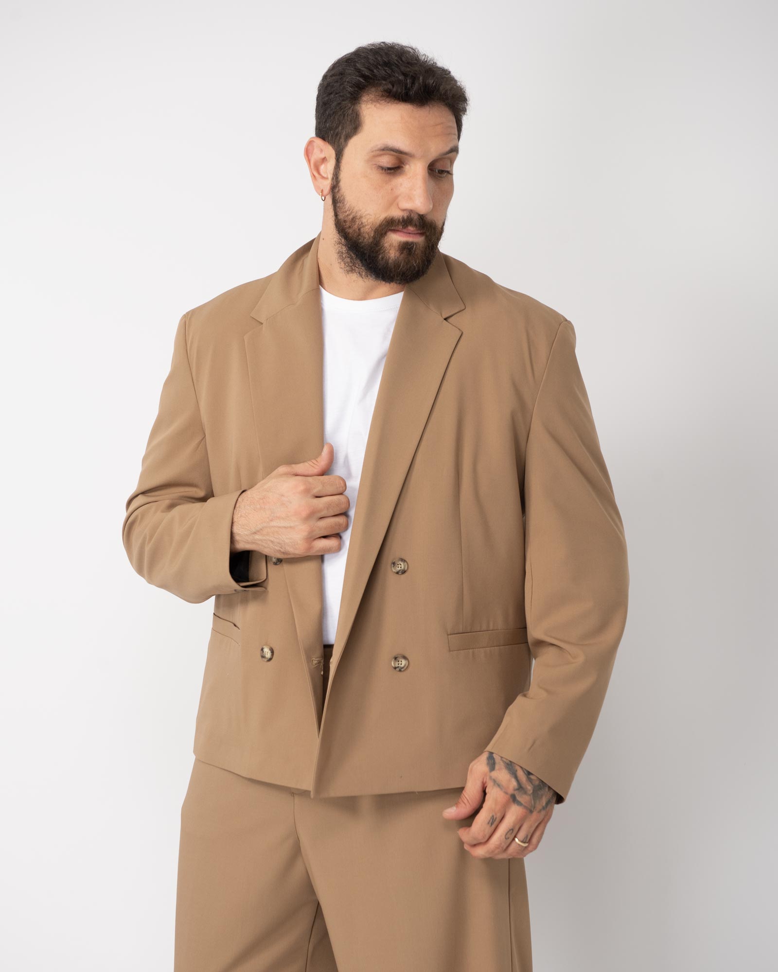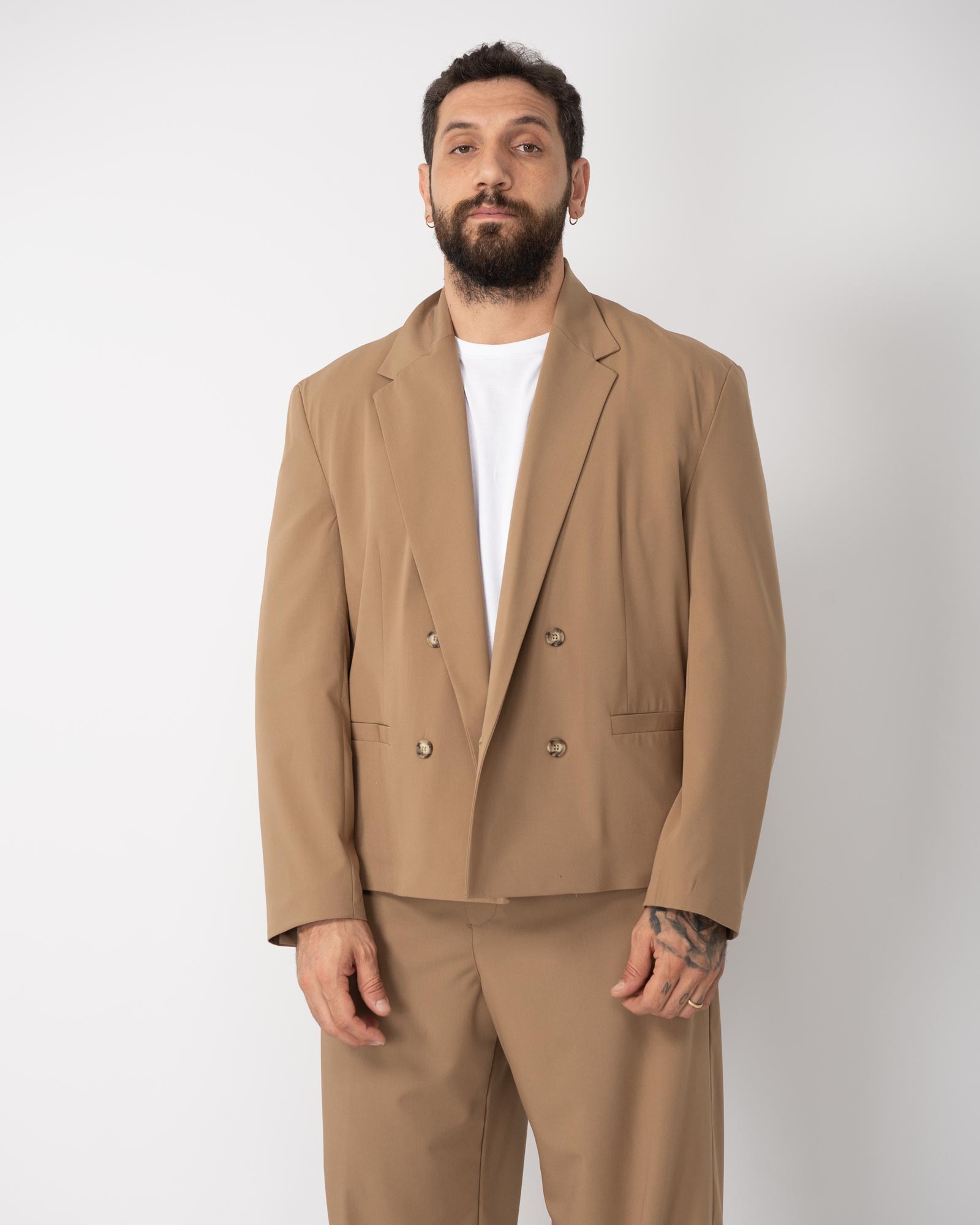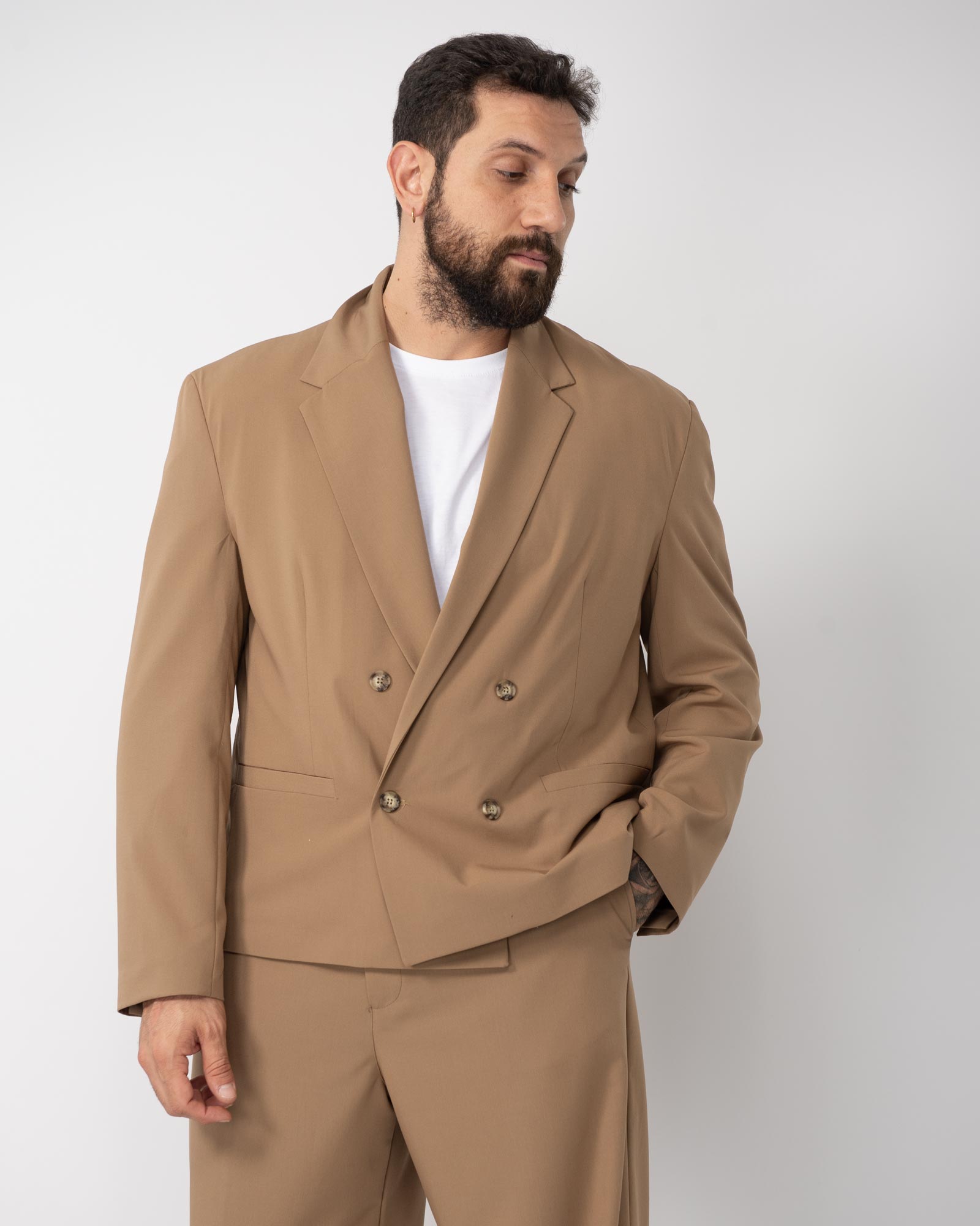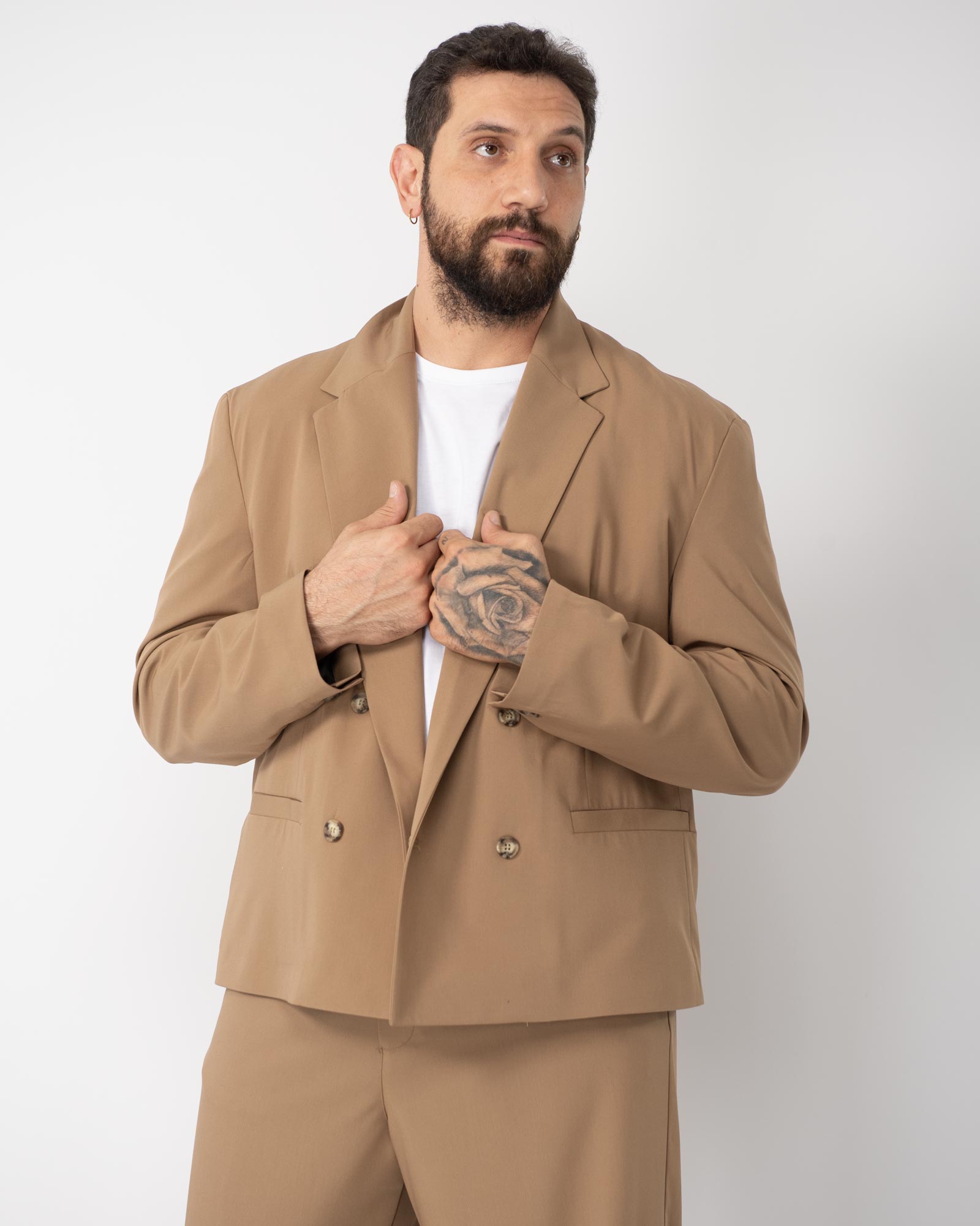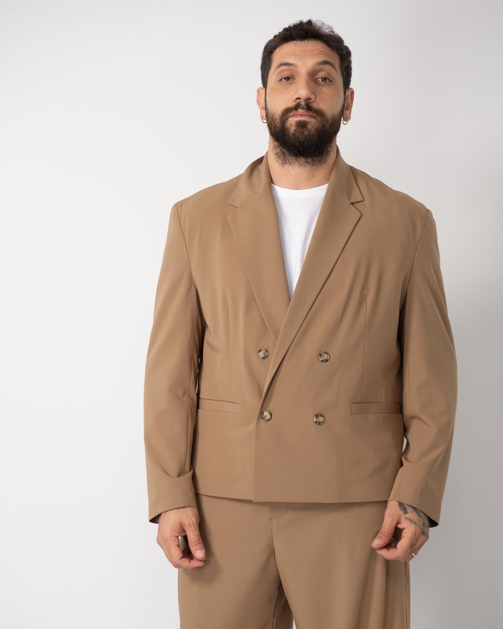 Blazer doppiopetto foderato, presenta spalline e revers ampio con tasche a toppa applicate. Il modello in foto indossa taglia 56 per altezza 1,85cm e peso 97kg